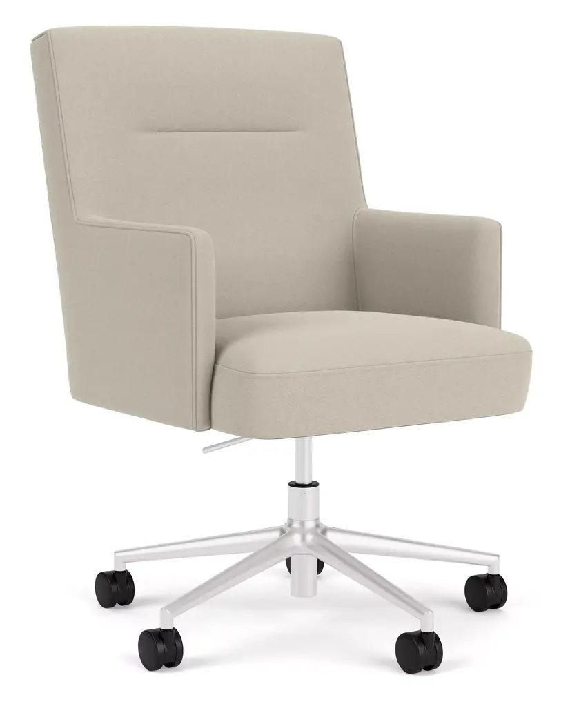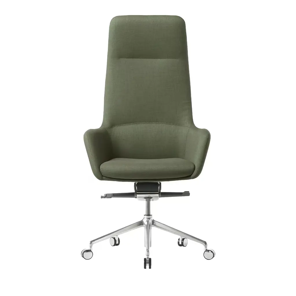 This elegant upholstered executive armchair is characterized by a medium backrest and a 5-star base, that can swivel and move up and down.