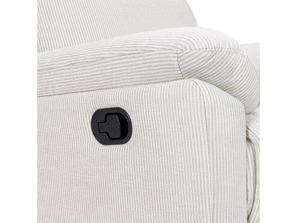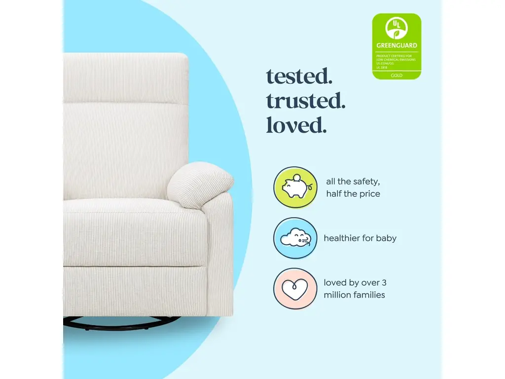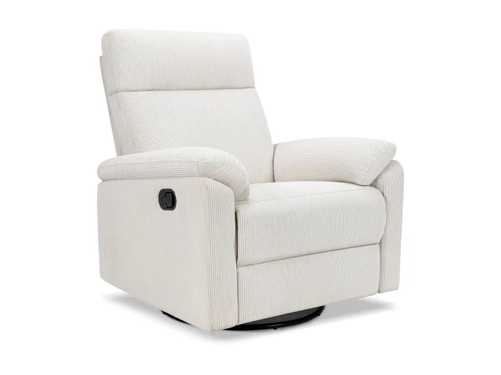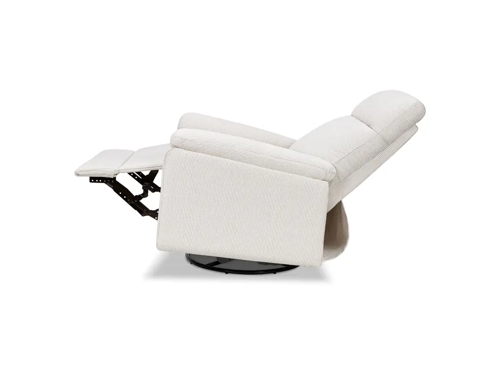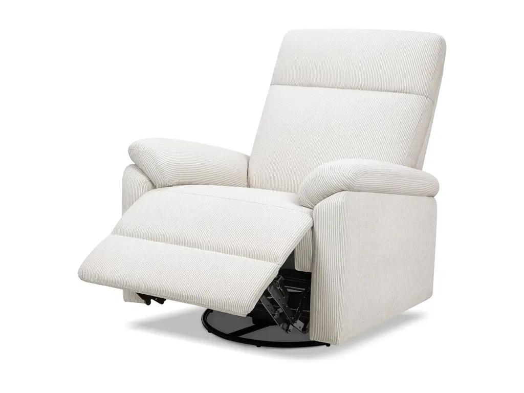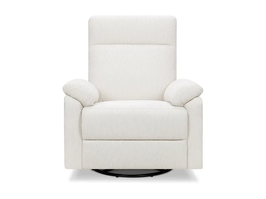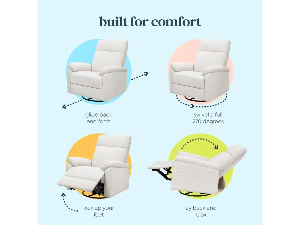 The Suzy Recliner and Swivel Glider has been thoughtfully crafted with cushioned armrests to provide optimal support and comfort to meet parent's and baby's feeding time needs. Moms and dads can rest easy in this comfortable, durable chair that swivels and has a smooth and easy-to-use mechanism that ensures a seamless transition from sitting to a peaceful reclined resting position. Designed with a high pillowback for head and neck support, you'll find yourself wanting to drift off into a peaceful slumber. This modern and versatile design can easily transition to your home in the later years.