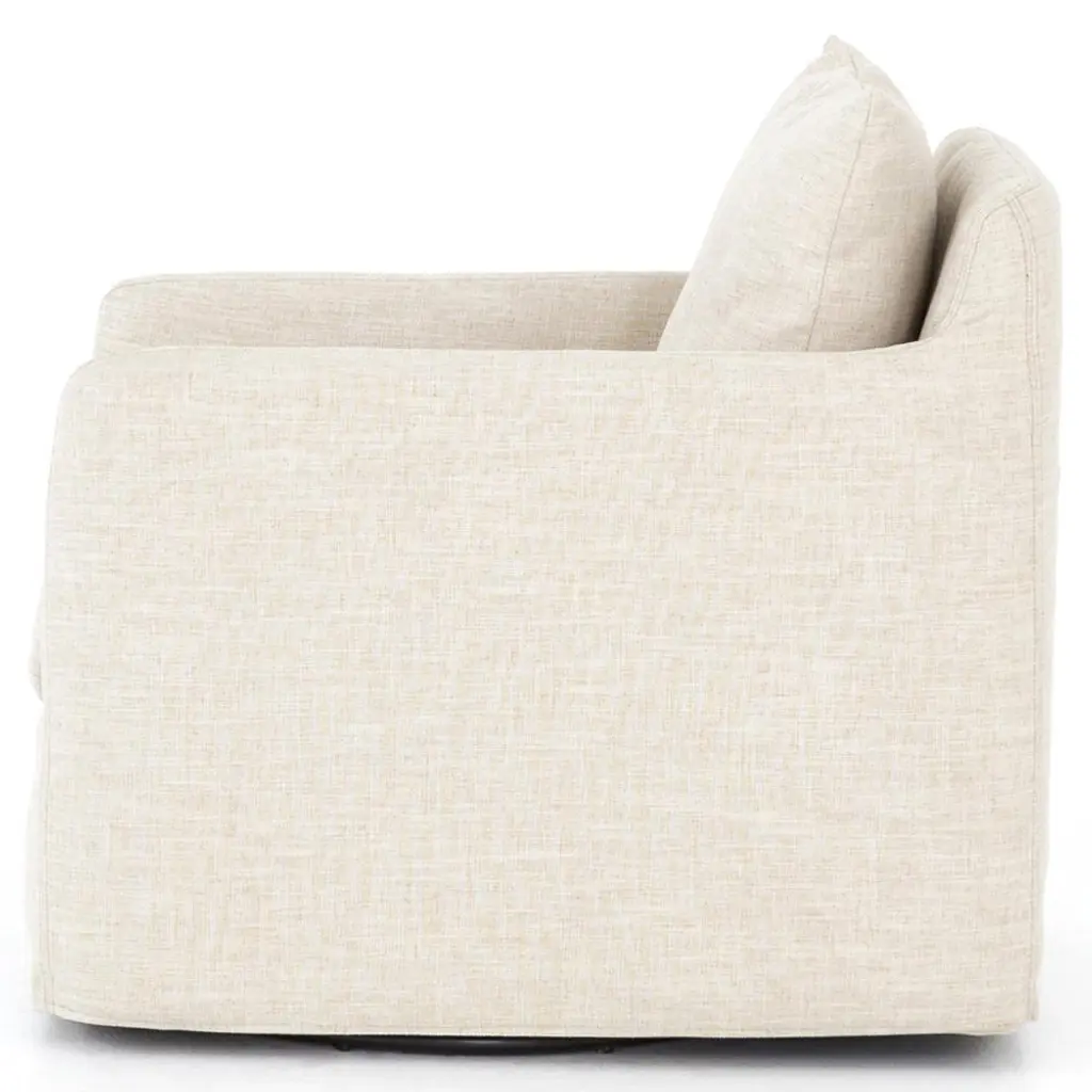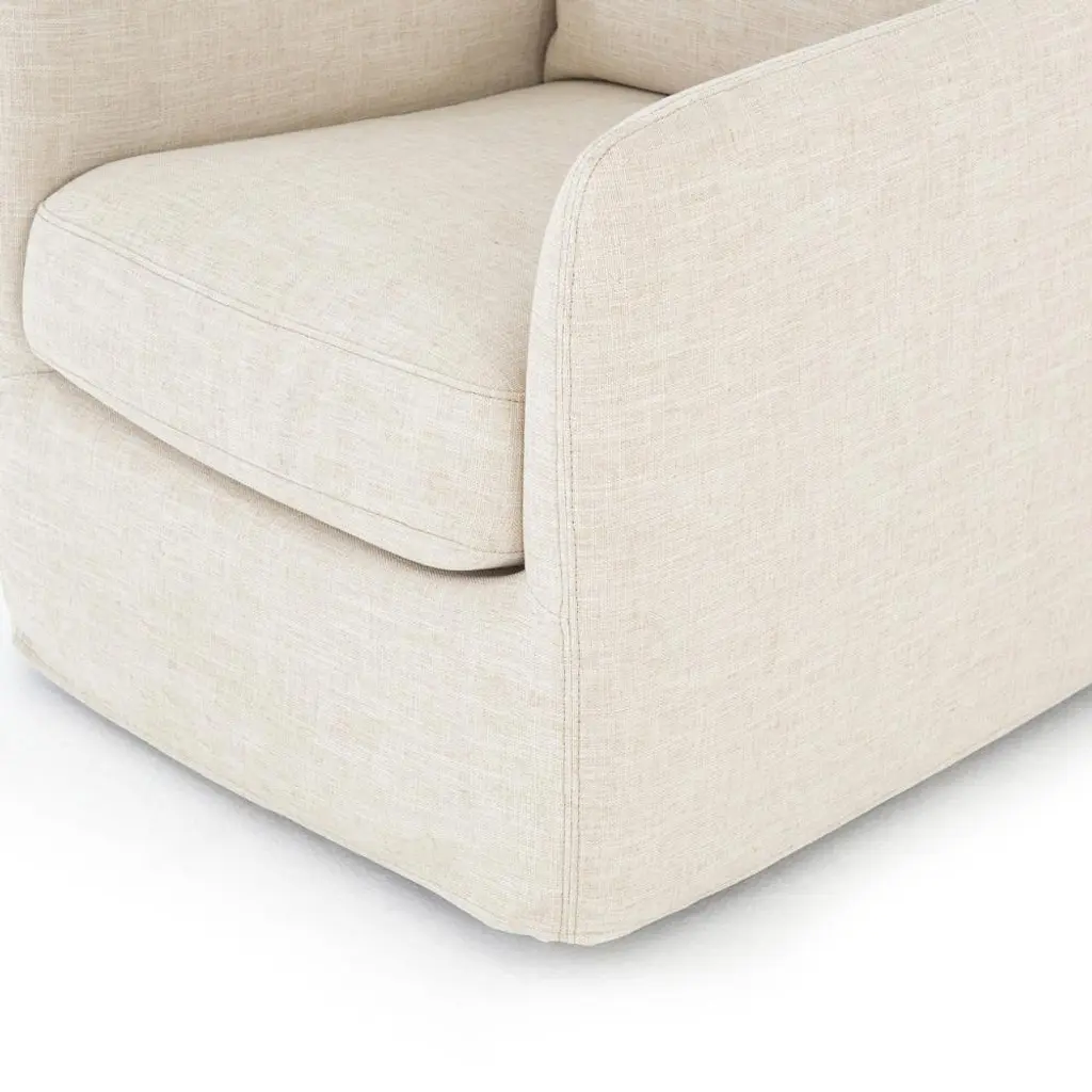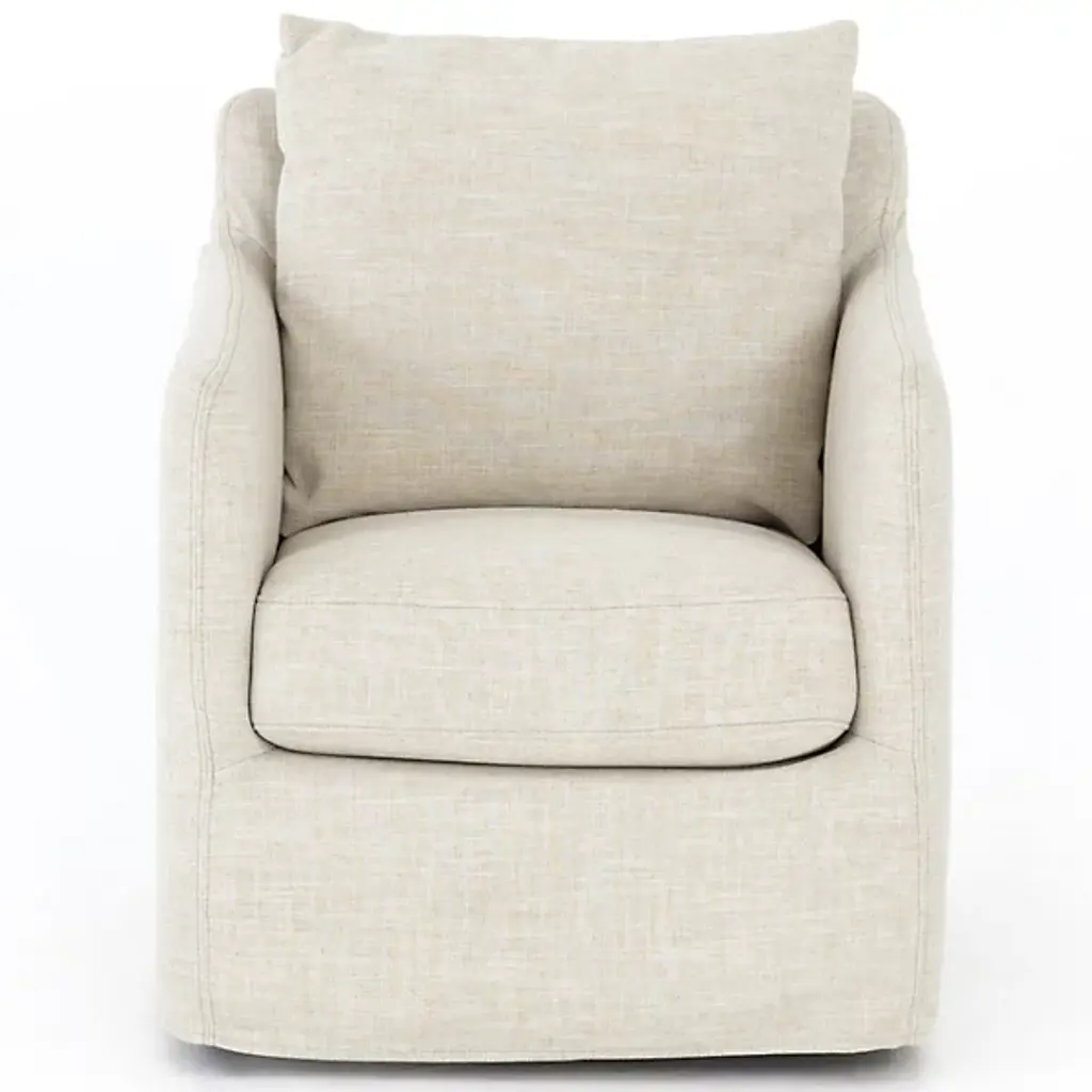 Comfort meets modern classic style in the Dayana armchair. With its generous seat cushion and ivory linen-blend performance slipcover, this luxe chair makes for an inviting addition to your living room or bedroom. A 360-degree swivel base brings a playful element to an elegant design.
