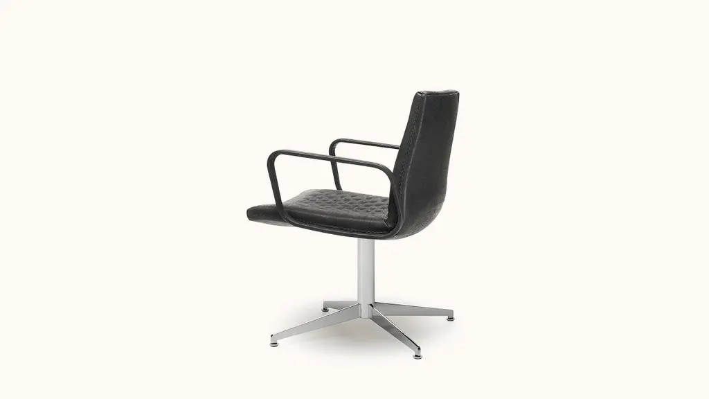 DS-1051 is available in a wide variety of versions: high- or low-backed, with or without armrests, as a cantilevered chair, with four-star swivel base or with a five-star base. Extremely filigree, elegant and luxurious in appearance, but without any loss in functionality or comfort.Seat and back are elaborately stitched by hand with needle and thread, and expressive hand sewn seams are to be found at the sides.Additional information:Material: Black leatherType: Nappa leather, lightly pigmentedThickness: 1.2 to 1.4 mmCharacteristics: Meticulous processing preserves the natural quality – with a characteristic pattern of creases, grain and pores. After tanning, it is dyed with a special finish to maintain the natural aura while also offering improved protection. It undergoes visible ageing, lending it an endearing patina.Dimensions: 73 W x 73 D x 46 H cmSeat height 46 cmAvailable in other upholstery options: Living, touch, naturale, coloral.
