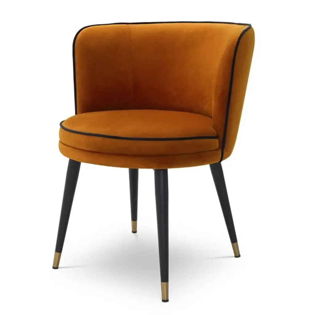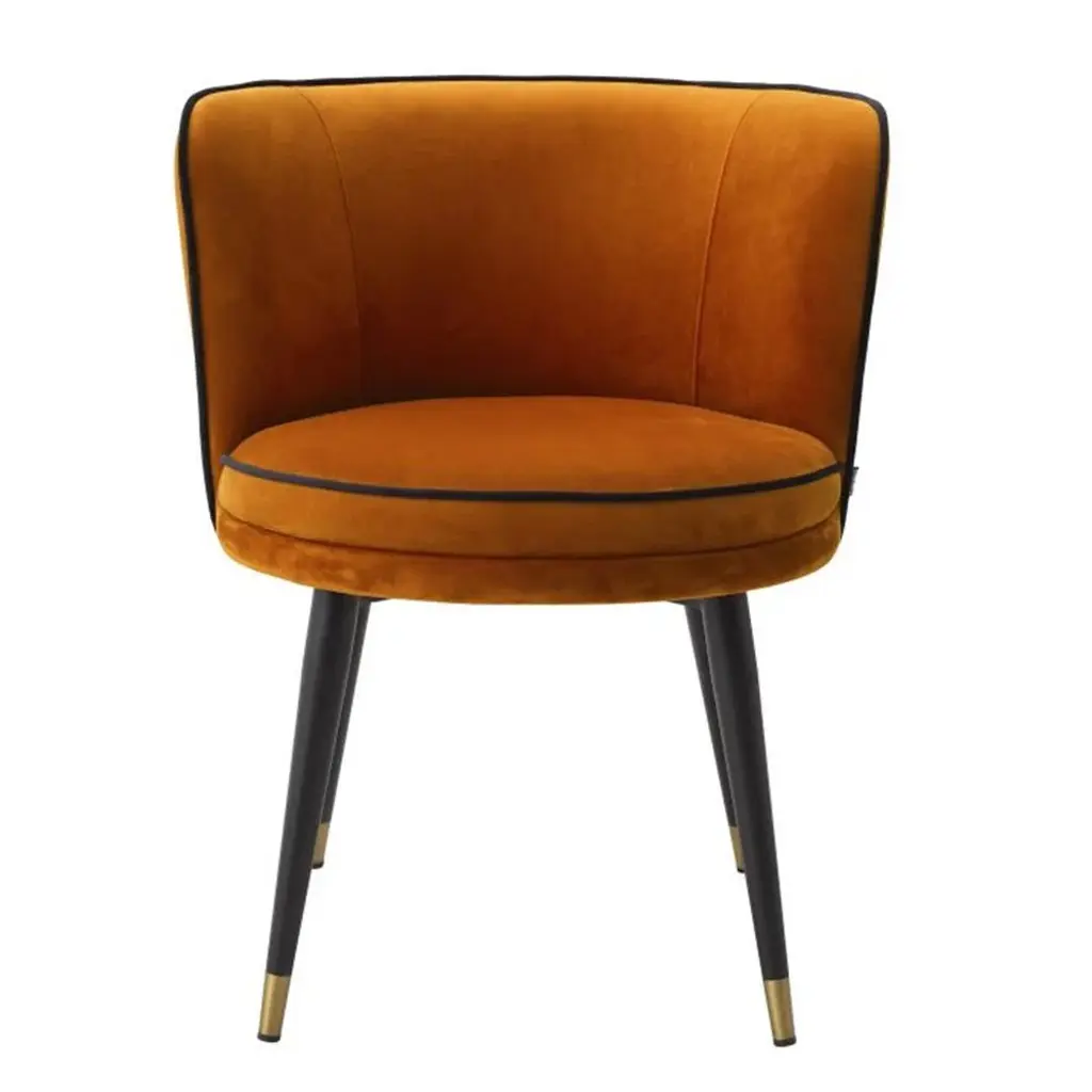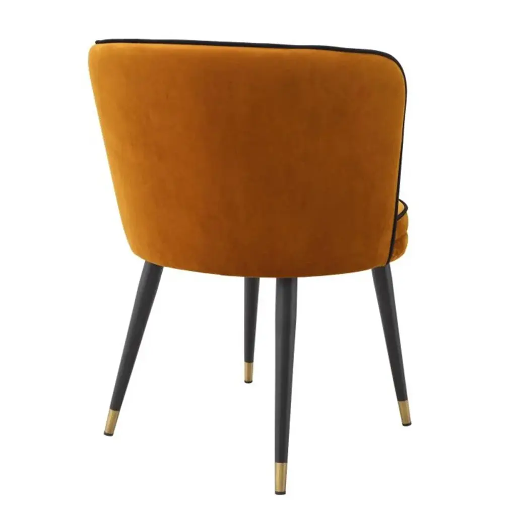Be on trend with the beautiful Delta Dining Chair. This gorgeous retro chair features black tapered legs with gold caps and a swivel seat that is upholstered in Pumpkin Orange velvet. With its Mid-Century Modern appeal this dining chair will add vintage charm to your dining room or kitchen. Available with other color fabrics: Dark Blue Velvet, Greige Velvet, Grey Velvet and Off White Lyssa fabric.