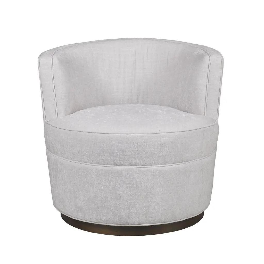 A contemporary spin on the classic barrel chair silhouette, the Devlan Swivel Chair is angular in it's frame, and features a wooden plinth base. Welt trim throughout the upholstery adds additional sophistication. Ships In 8-10 Weeks Tight back Tight seat As Shown Fabric: Bass Grey As Shown Finish: Antique Walnut If you choose to purchase COM, once you have placed your order a customer service rep will contact you regarding where to send your fabric. Please note that current lead time is 17-19 weeks once your fabric arrives at the factory, and if unused fabric is under 1.5 yards, it cannot be sent back to you.This product can be special ordered in additional fabrics, leathers, finishes, and cushion fillings. Click here to email us for for additional information about special ordering.This image is for illustrative purposes only. The colors shown are accurate within the constraints of lighting, photography, and the color accuracy of your screen.