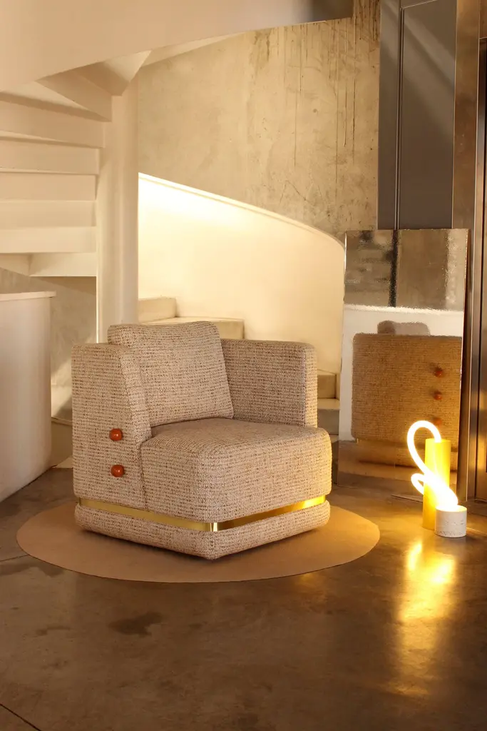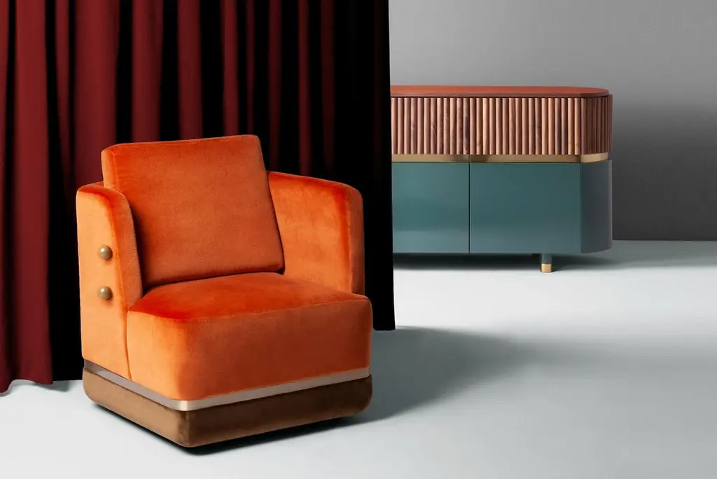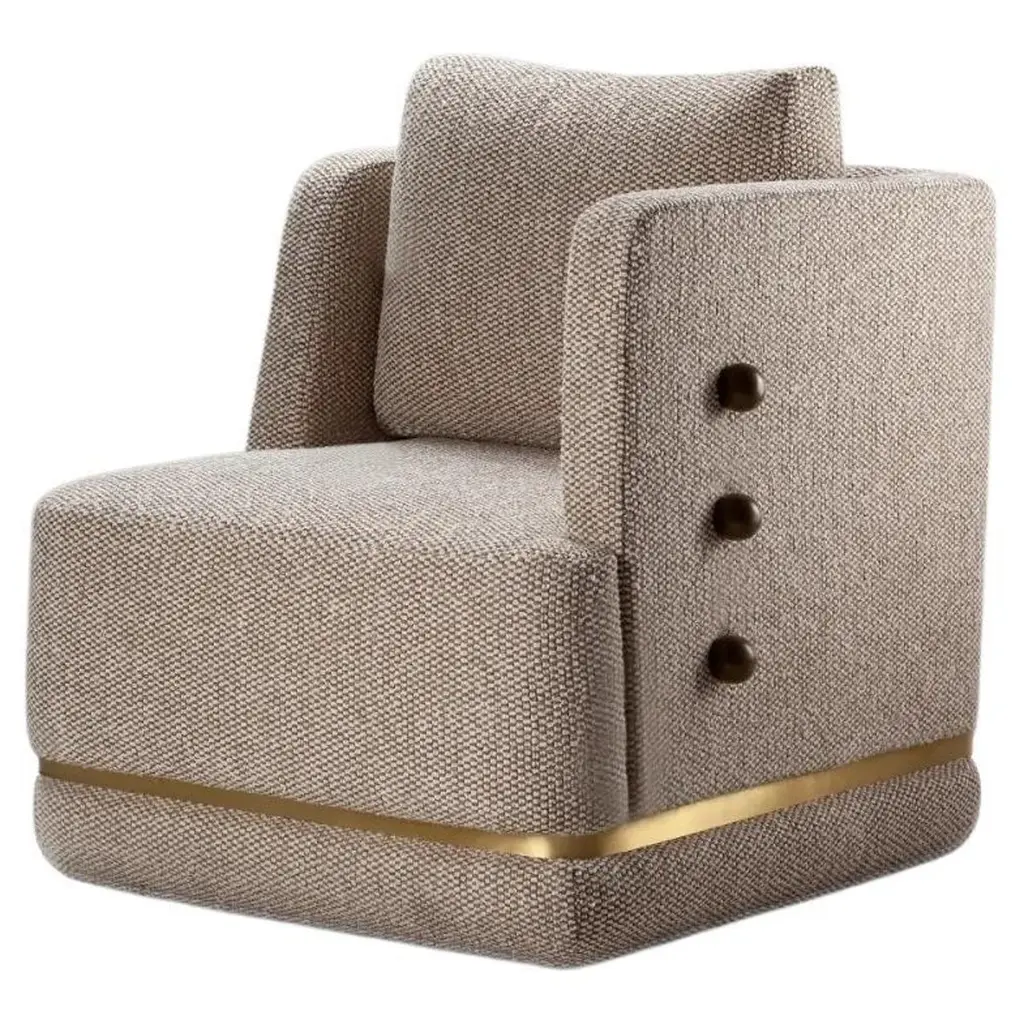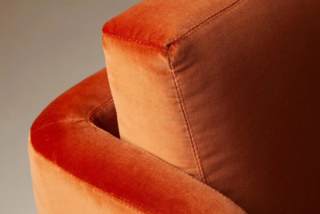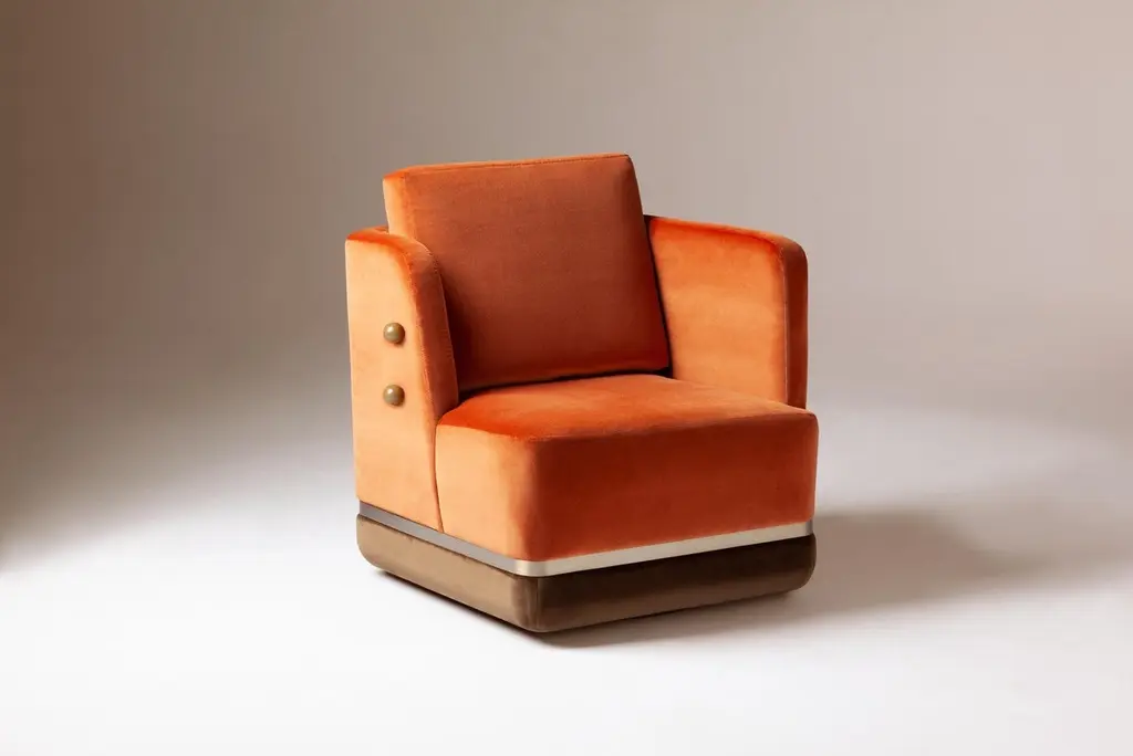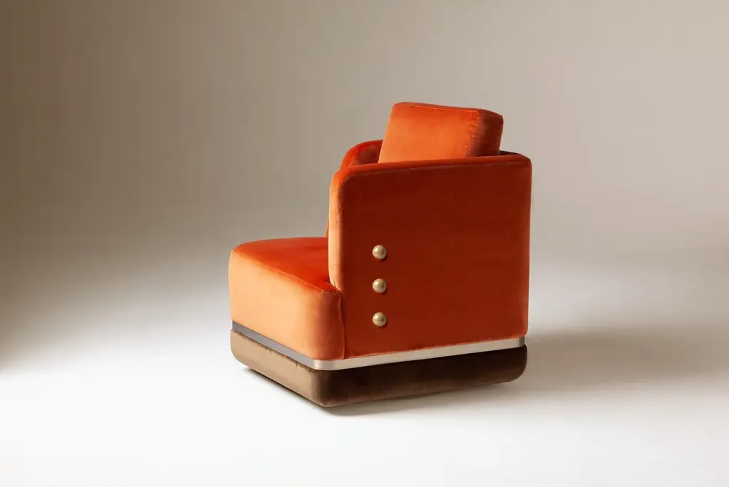 Swivel armchair with soft 100% cotton Orange and Brown velvet by Pierre Frey and satin brass detail. New and made to order.Born in Portugal, Dooq is a design company dedicated to celebrate the luxury of living.Our studio focuses on an extensive research of details together with a vast iconographic research around art and design, creating an ever-evolving language that emphasizes first the small details. We seek to find balance in contrasts, creating pieces where feminine meets masculine, small meets large, soft meets solid and past meets the present allowing the new to blossom.Portugal is a country leader in craftsmanship, which used in combination with the creativity of great designers helps creating handmade pieces with a one-of-a-kind character to each, with an uncensored aesthetic where each piece has its own reason of existing. Dooq is pursuing elegance with audacity and devotion, crossing the boundaries between art and design.If you are planning on ordering an upholstery item with COM upholstery, please follow these instructions: - Let us know that you are shipping fabric to us prior to shipping, as we will need you to fill a form;- All fabrics must be shipped to the company DOOQ, LDA, and no other name;- Send us the fabric invoice so we can present it to portuguese customs so the fabric can be released;- Our company must appear on the fabric invoice as "SHIP TO" only, not as "BILL TO" or "SOLD TO"- Our company has the right to refuse acceptance of fabric/leather if the shipment of such material ignores the requirements written above;Solid and concrete like in appearance, panorama line is an ode to monumental proportions and impacting visual lines impossible to overlook in a voyage amongst Eastern Europe’s architectural legacy. Still the strong lines are attenuated by softly gathered upholstery that will provide you maximum comfort and stability.For sales with delivery address within European territories, VAT will be charged additionally to the stated price.