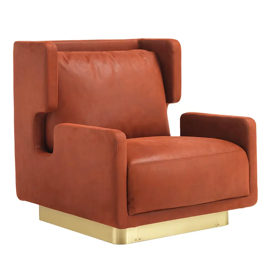 Dooq Swivel Armchair In Orange And Brown And Brass Detail Panorama