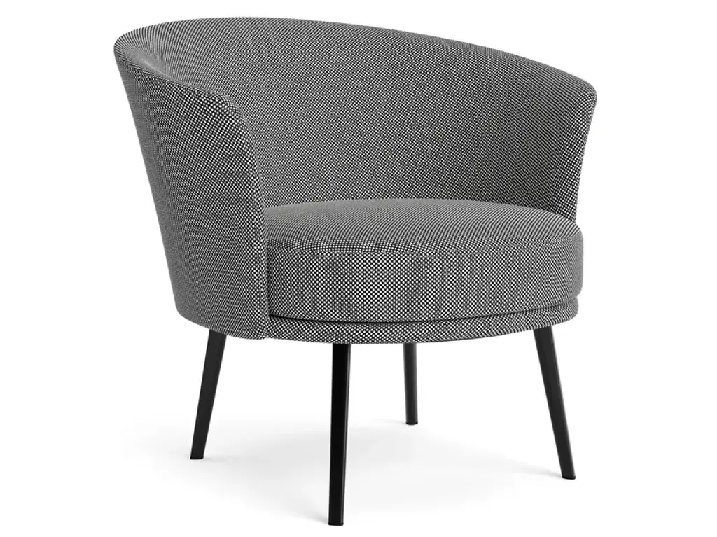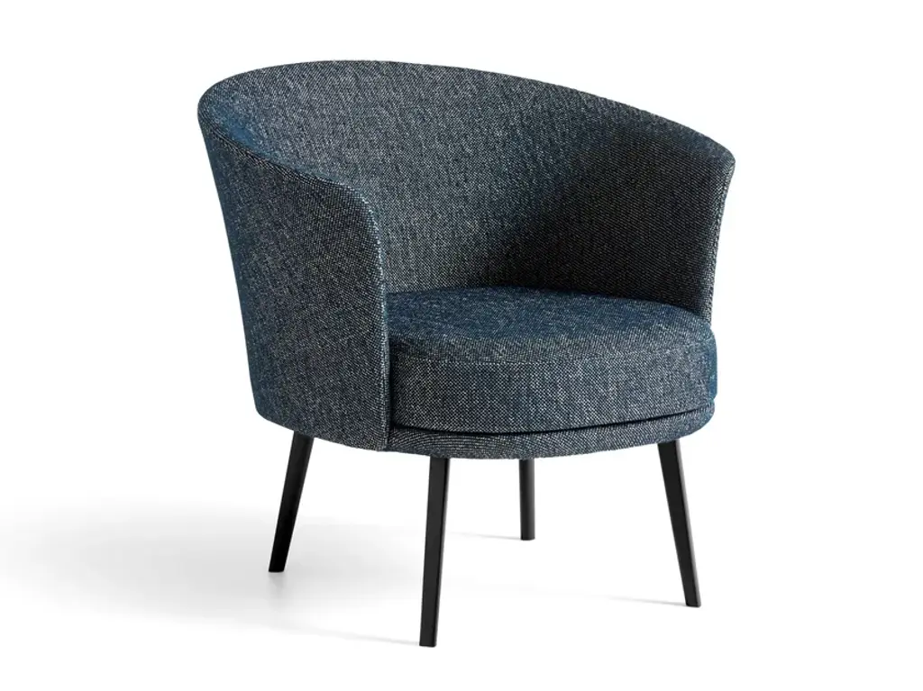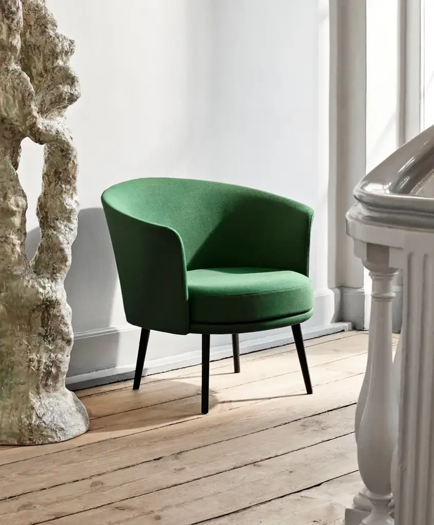 Inspired by the shifting curves of a human torso in motion, GamFratesi’s Dorso chair combines a rounded exterior with a rotating base, creating a relaxing and functional lounge chair. Dorso’s compact dimensions, swivel mechanism, and high level of comfort make it suitable for many different contexts, ranging from conferences, lounges, and waiting areas in public environments to homes and other private settings. Shell in moulded polyurethane (PU) foam with an inner steel frame. Full upholstery. Seat Cushion: Polyurethane (PU) foam with upholstery and anti- slip fabric on the bottom. Base: Steel frame with extruded aluminium bearing. Integrated swivel mechanism. Legs: Steel or FSC-certified solid wood. Available in a large selection of standard fabrics and leathers. Available in 3 different base finishes: - Black powder coated steel (RAL 9005) - Oiled solid oak - Chromed steel