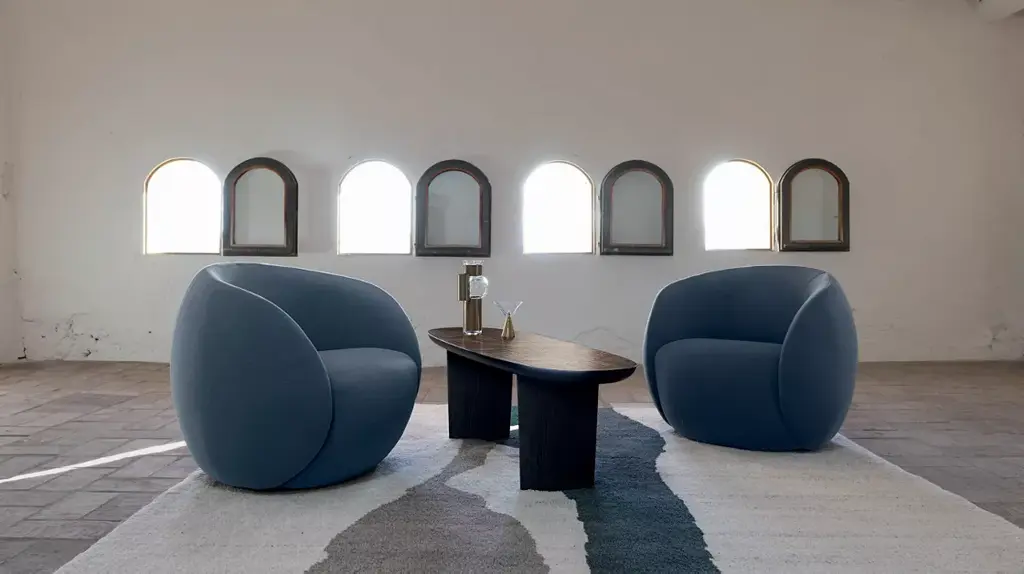 The NATIV collection, which was designed by Raphael Navot for Roche Bobois, focuses on natural lines and organic shapes. The goal was to create a dialogue between nature and culture. The pieces of this collection highlight geometric craftmanship and luxurious materialsMounted on a swivel base and upholstered in a thick elastic fabric, this spherical armchair seems to offer a comforting embrace. Mounted on a swivel base and upholstered in a thick elastic fabric, this spherical armchair seems to offer a comforting embrace.