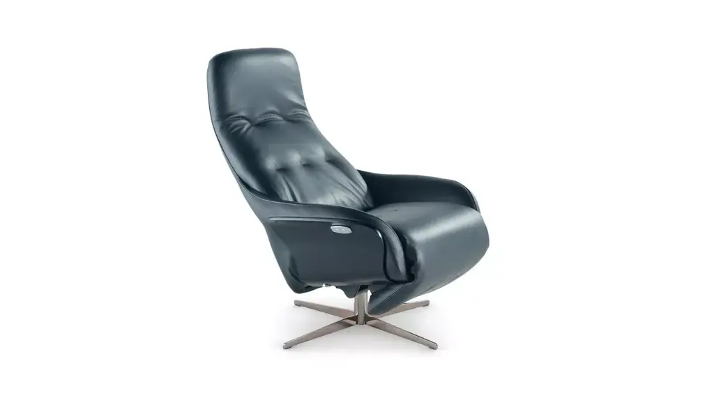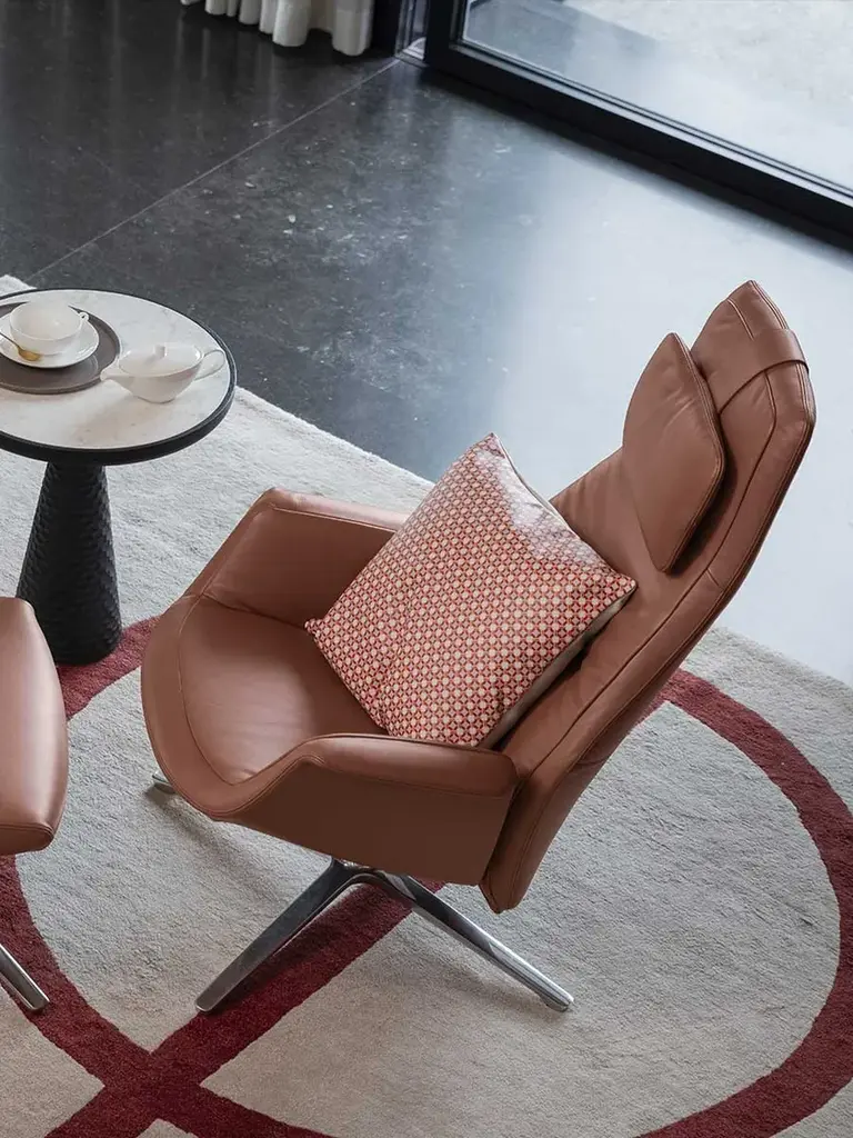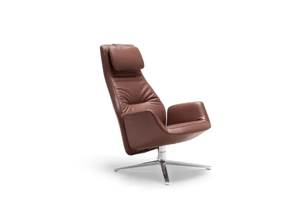 The aerodynamic, slightly reclined contours of the Downtown Lounge armchair invite you to sit back and relax. The differentiated-density padding and headrest cushion ensure exceptional seating comfort. The structure is available in a fixed version, with a solid wood base in various finishes, or a swivel version, with a four-spoke die-cast aluminum base. The base features a “Return” mechanism, allowing for 360° rotation and automatic return to the original position. In both versions, the Downtown Lounge armchair can be fully upholstered in either Pelle Frau® leather or fabric, in various colors.DownTown is the armchair (ideal for working) specially dedicated to demanding decision-makers whose their choice depends on comfort and a refined elegance.A technical seat that look like a silhouette; handcrafted by Poltrona Frau assuring the highest quality.More than a sculpture, DownTown is a sensual and characteristic creation by Jean-Marie Massaud.Downtown is available in 5 versions: President, Executive, Managerial, Meeting and Visitor. The upholstery, embellished with tone-on-tone or contrast stitching, is made with Pelle Frau® leather from the Color System, and is also available in a version with micro-perforations on the inner surface of the backrest, armrests and cushion.In the President, Executive, Managerial and Meeting versions, the five-spoke resting base, available in either polished aluminium or with a black finish, is fitted with soft, self-blocking “W” type wheels that adapt to all types of flooring. The Visitor version has a 4-spoke base with swivel plastic glides that are, on request, also available for the other versions.The President, Executive and Managerial versions are height adjustable and rotate by pulling the lever beneath the seat on the right. The “Syncron” turning mechanism for the seat and backrest allows the armchair to easily accompany the body’s movements, thereby guaranteeing extraordinary comfort. The armchair’s mechanism allows it to be locked into 4 different positions.