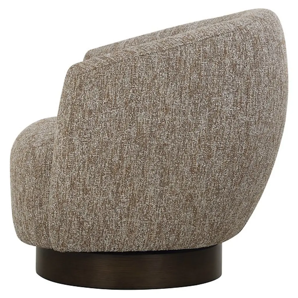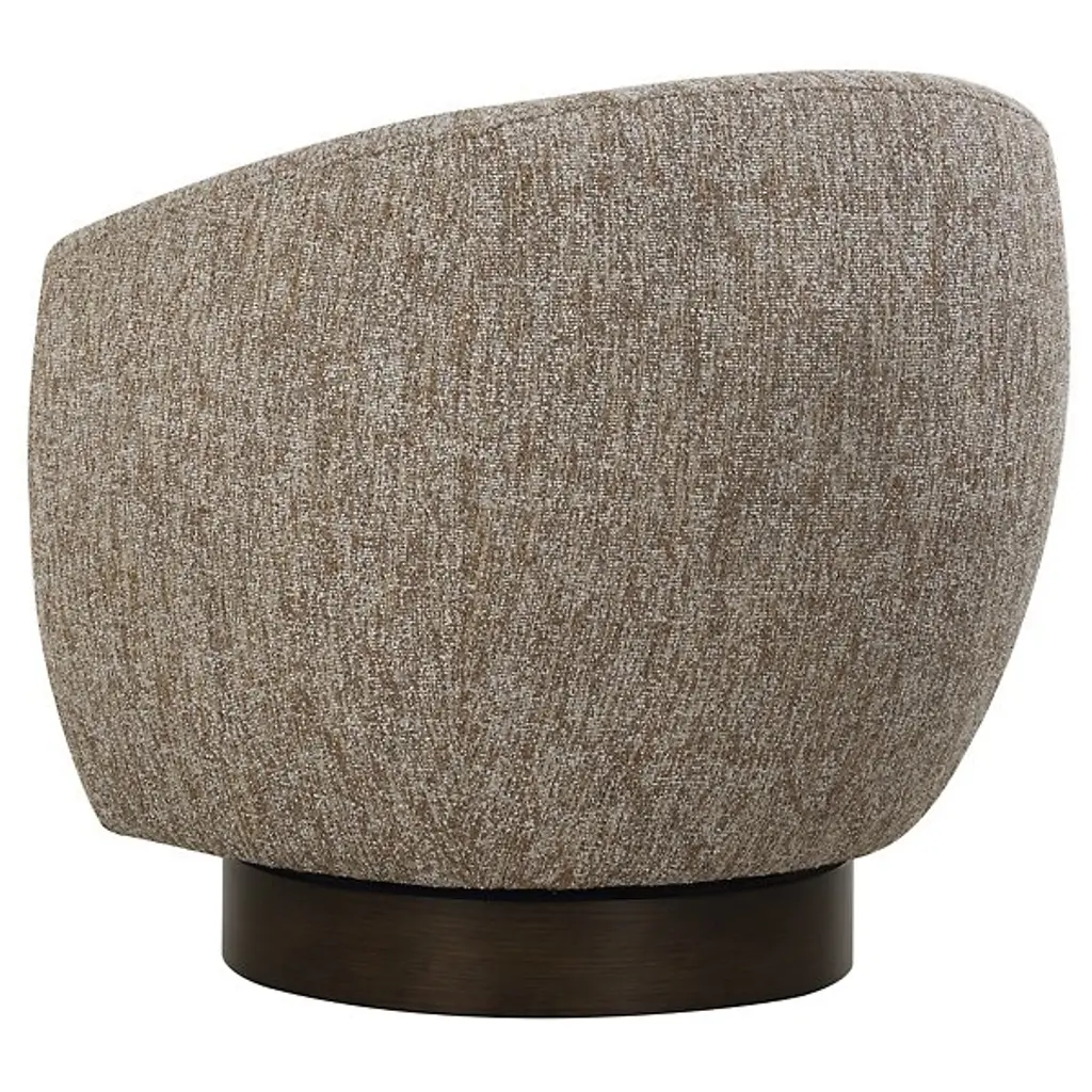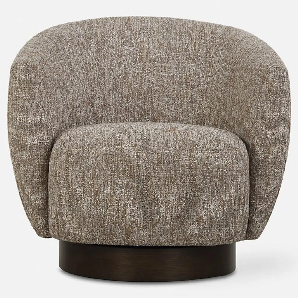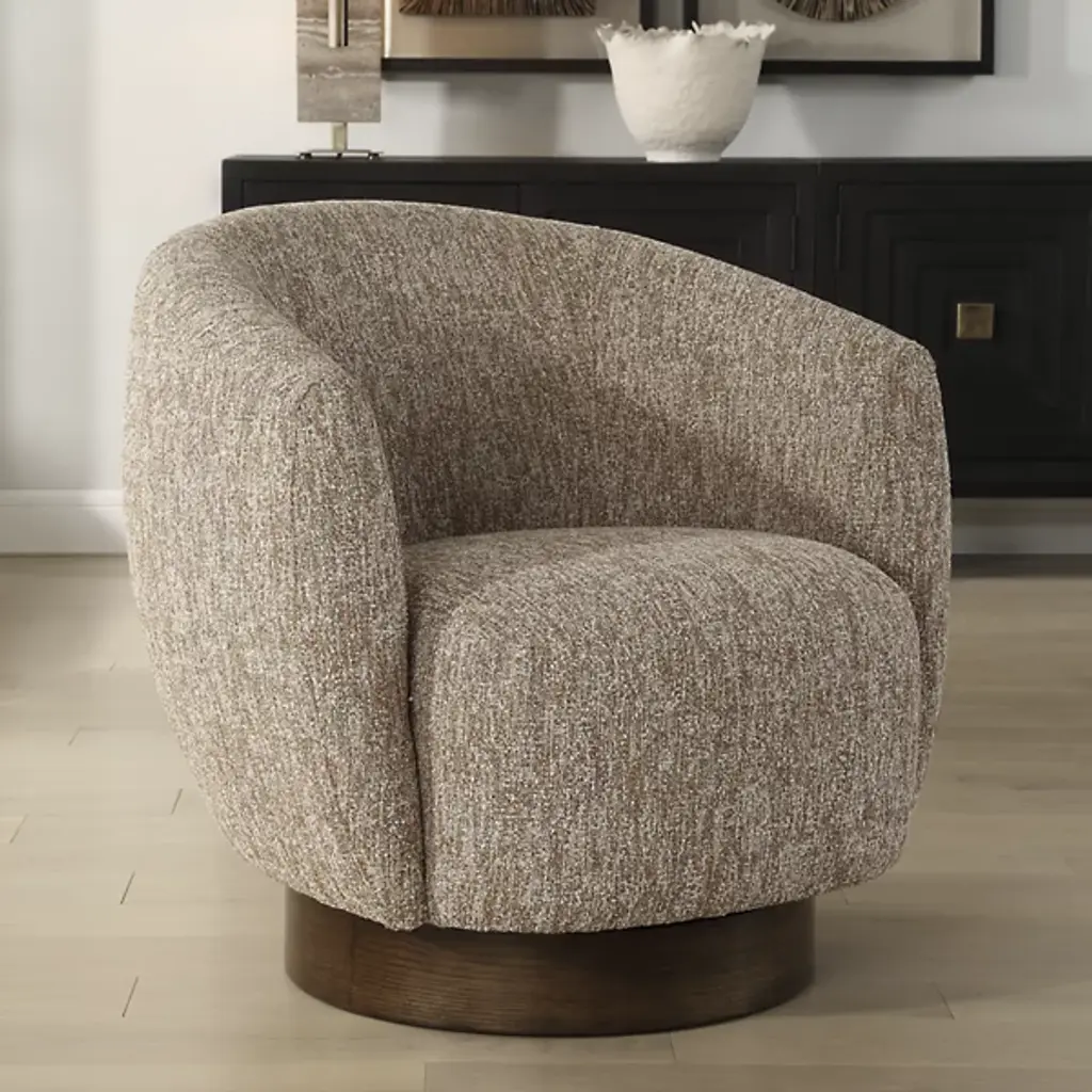 The Dunes Swivel Chair from Uttermost encourages dynamic seating - allowing users to pivot between conversation areas or turn to view different parts of a room while maintaining perfect comfort. The encompassing back creates a private sanctuary while maintaining an open feel. The plinth base houses a smooth rotation mechanism that responds to natural movements. The upholstery's multi-toned weave creates depth through subtle variations in texture rather than pattern.