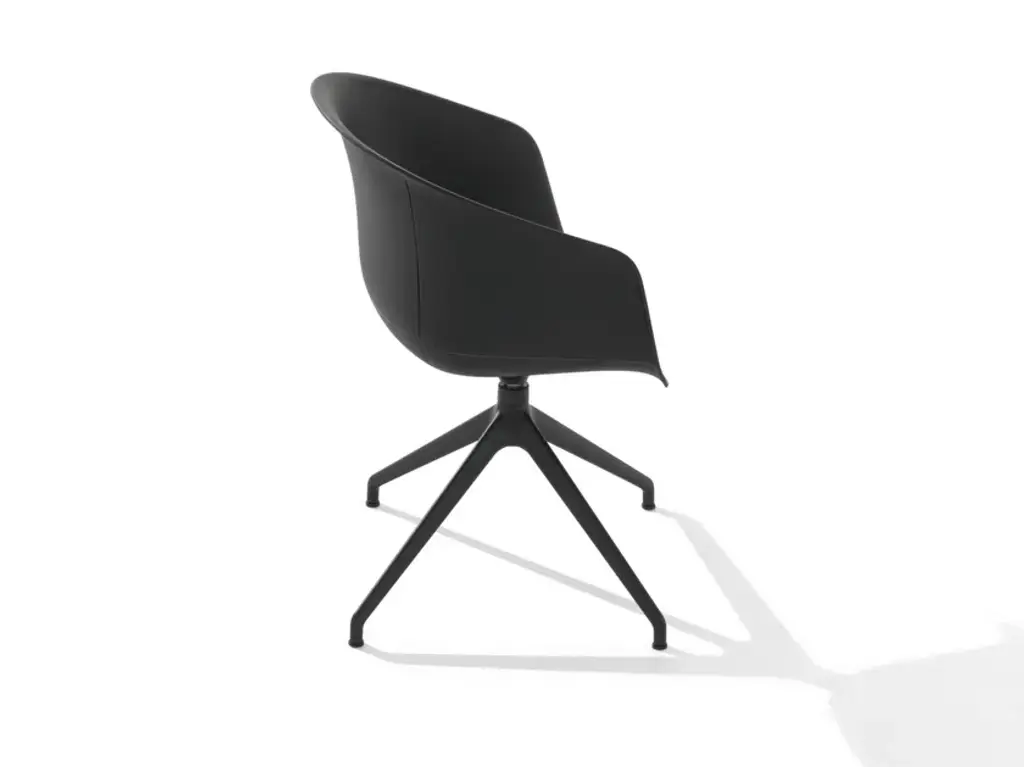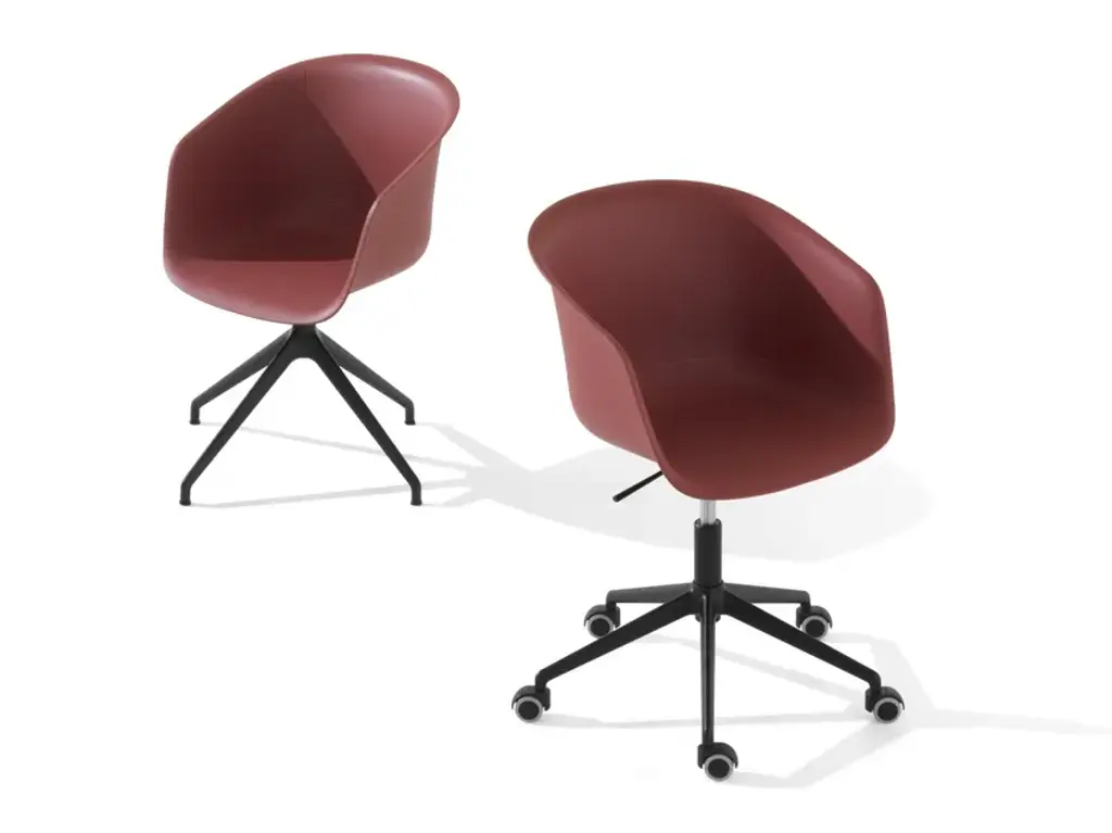 Dunk 1193 is a swivel chair with polypropylene shell and four spoke base.With its ductile and eclectic multifaceted soul, the Dunk armchair becomes even more versatile. The polypropylene shell is available in two versions, with and without holes and with different types of frames. The collection’s green soul is highlighted by the marsala-coloured version in recycled polypropylene (r-PP) made from post-consumer materials.The new versions feature a shell with either an upholstered seat, or else fully upholstered and two new frames: four wooden and rocking legs. The range of use becomes truly infinite.