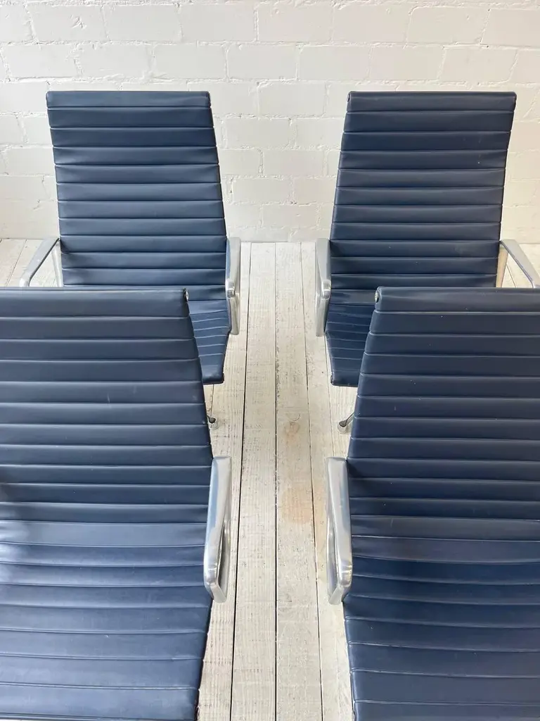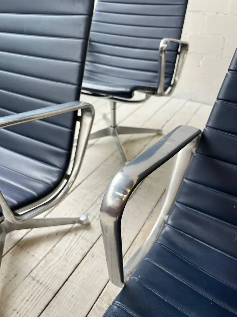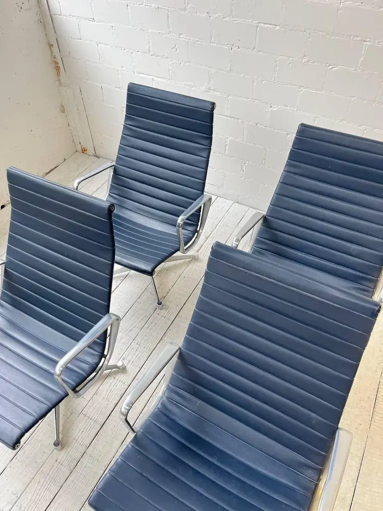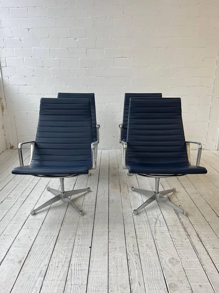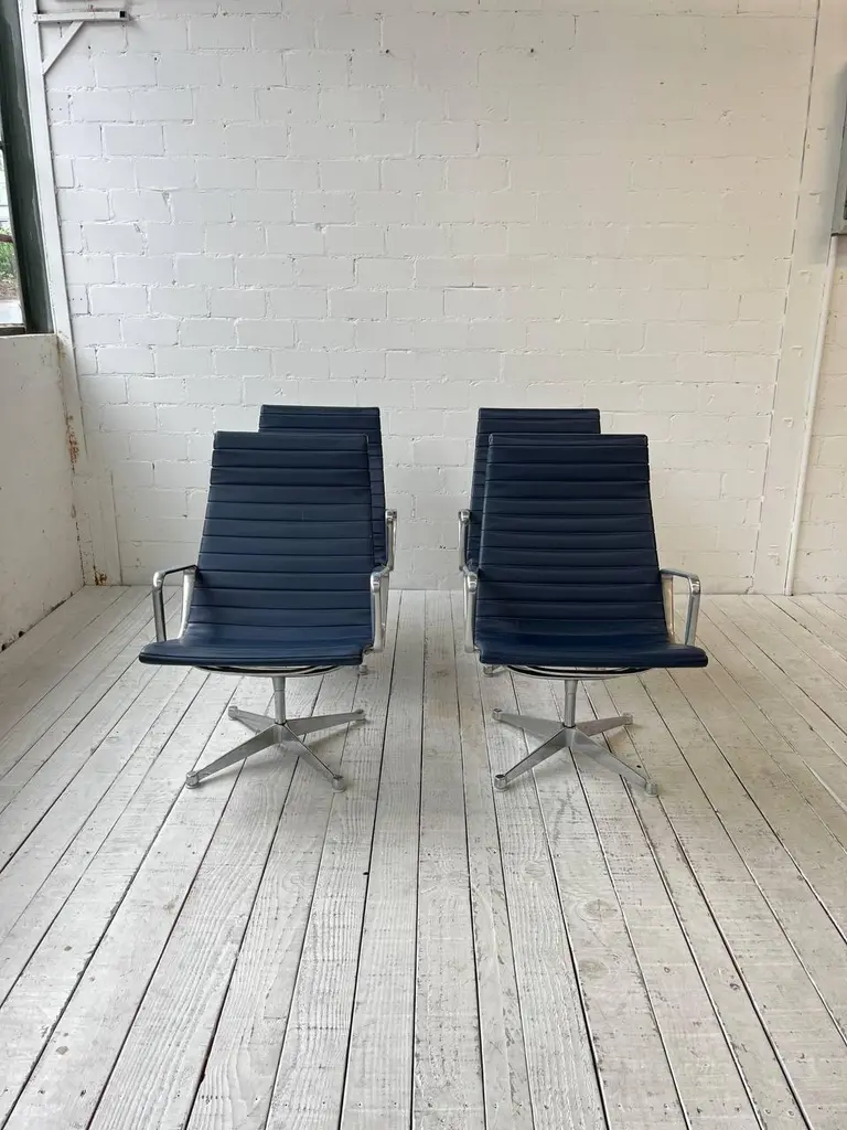 Four Charles & Ray Eames chairs for Herman Miller, shown here in the swiveling Lounge Chair version of the Aluminum Group. The frames are made of matte aluminum (a rare variant), and the seat shells are covered in blue skai synthetic leather. This is the Herman Miller version with the old base, and the swivel mechanism works perfectly. This piece has an attribution mark, I am sure that it is completely authentic and take full responsibility for any authenticity issues arising from misattribution