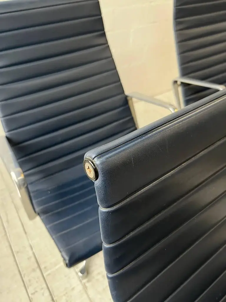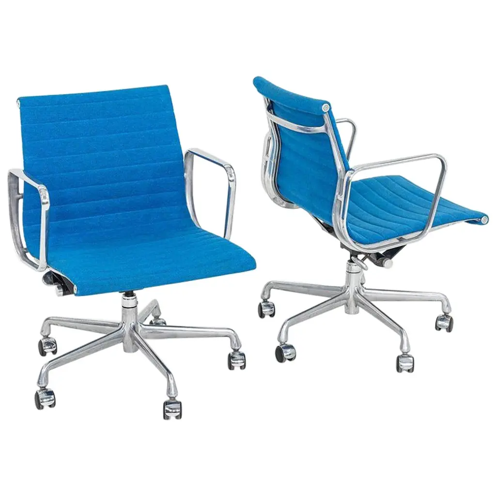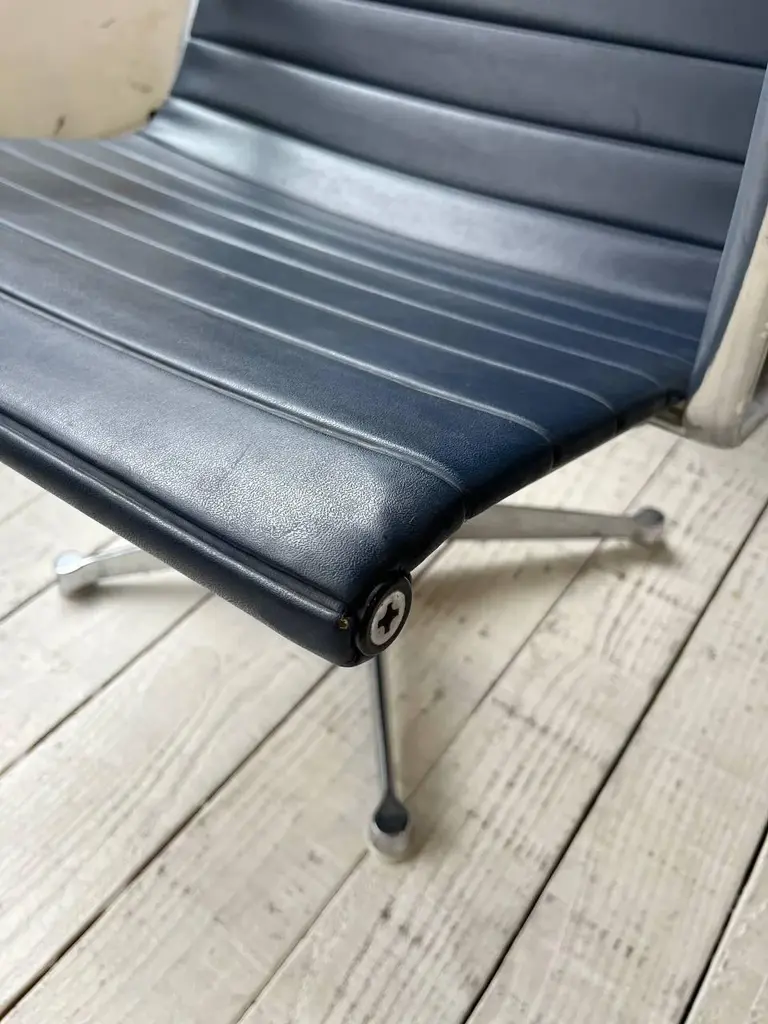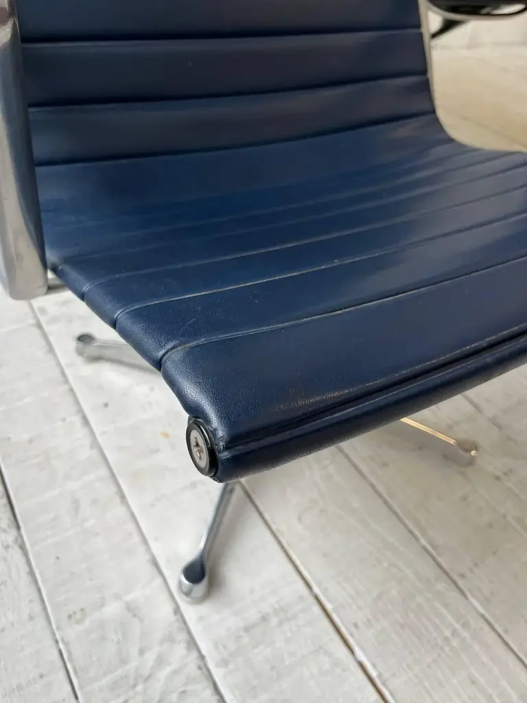 Four Charles & Ray Eames chairs for Herman Miller, shown here in the swiveling Lounge Chair version of the Aluminum Group. The frames are made of matte aluminum (a rare variant), and the seat shells are covered in blue skai synthetic leather. This is the Herman Miller version with the old base, and the swivel mechanism works perfectly. This piece has an attribution mark, I am sure that it is completely authentic and take full responsibility for any authenticity issues arising from misattribution