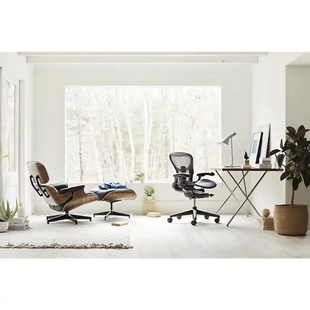 There is nothing quite like an Eames. The legendary Eames Lounge Chair by Herman Miller was originally designed by the famous Charles and Ray Eames in 1956 and their design immediately became one of the icons of Mid-Century furniture. Its 7-ply veneer shell is available in a variety of modern finishes while its cushions are individually upholstered and replaceable. The Eames base is crafted with die-cast aluminum with shock mounts made of resilient natural rubber. Swivel to the perfect position with its swivel functionality and adjustable stainless steel glides.