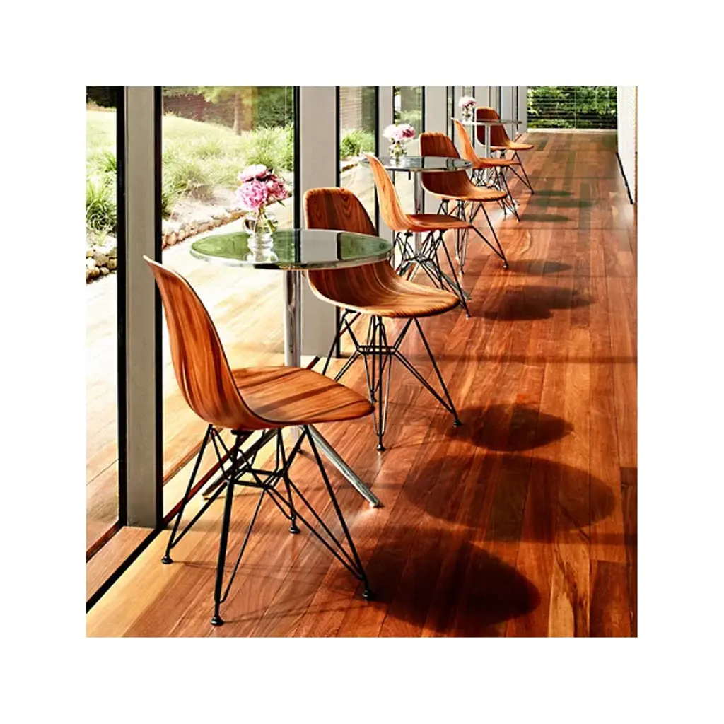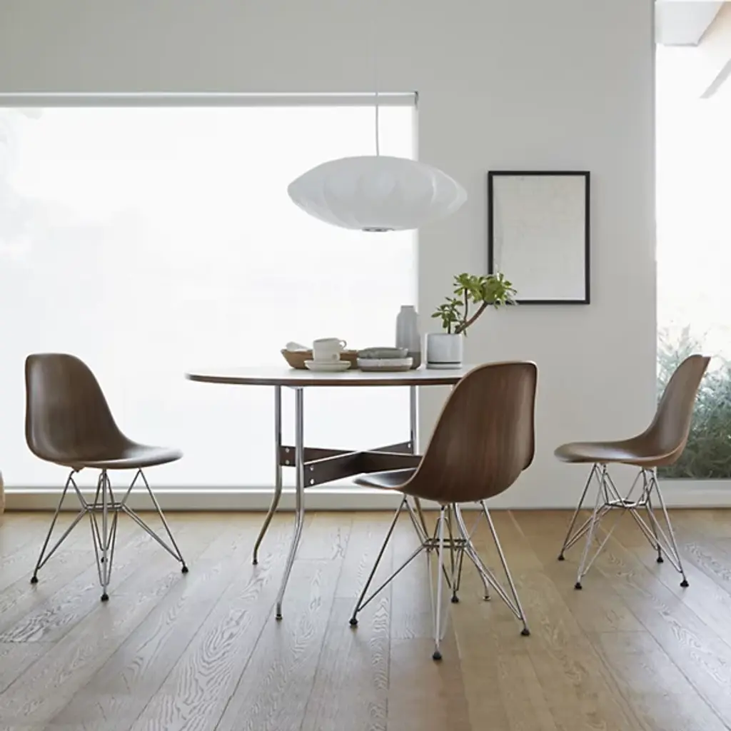 Embrace the sweeping elegance of modern design with the Eames Molded Wood Side Chair with Wire Base from Herman Miller. A clever creation from the minds of husband and wife team Charles and Ray Eames, their synergy starts with a braced arrangement of steel wires set upon swiveling glides that supports the single-piece shell of contoured hardwood that gives the piece its unique look. The wood itself has a deep pocket and waterfall-style front to ensure stable seating while remaining smooth enough to blend in well with a wide range of interior décor.