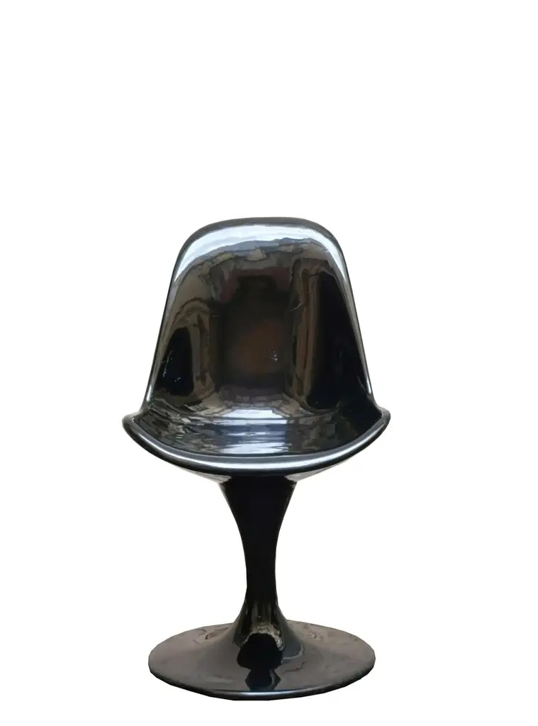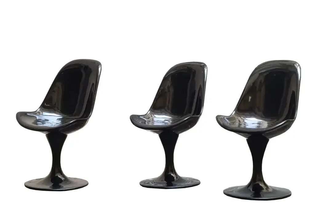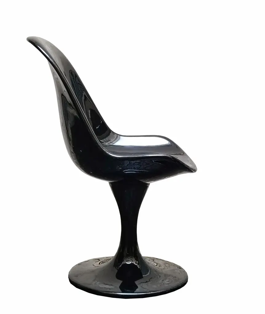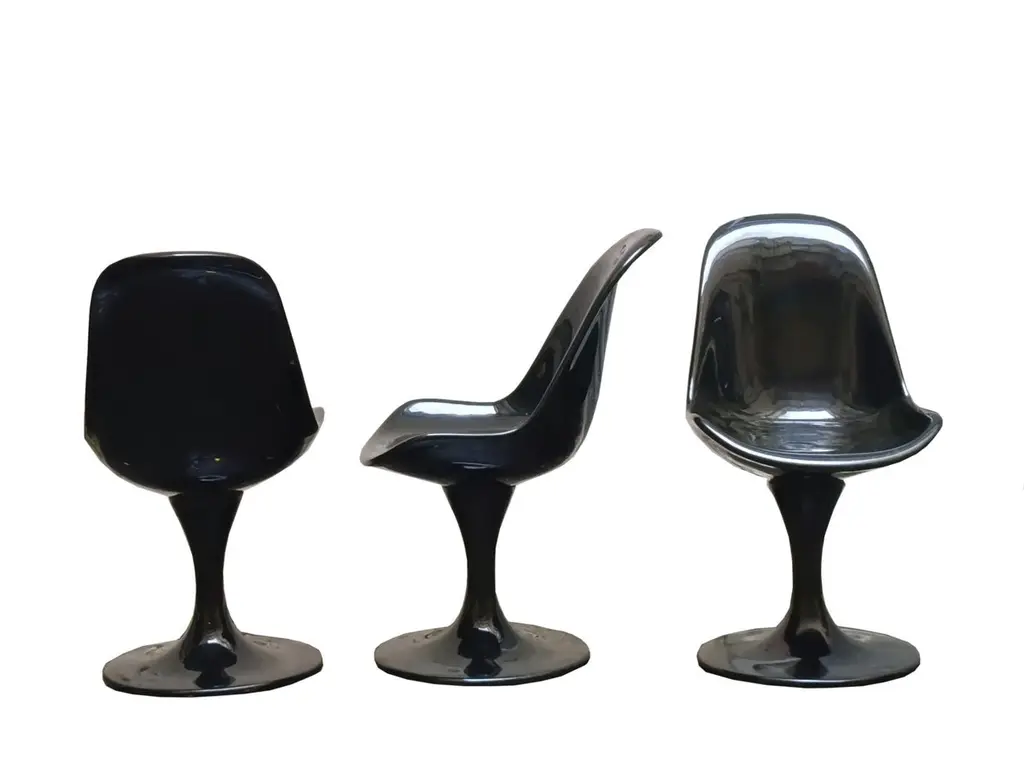 Elegant armless swivel chairs with black lacquered cast aluminum base and black glossy abs monocoque, the chair is in Eero Saarinen's Tulip style. Each chair features a central pedestal base, which widens downward to provide stability. The seat is shaped like a shell, offering comfort and ergonomic support. The colored is a deep black, which gives them a sleek and modern look.