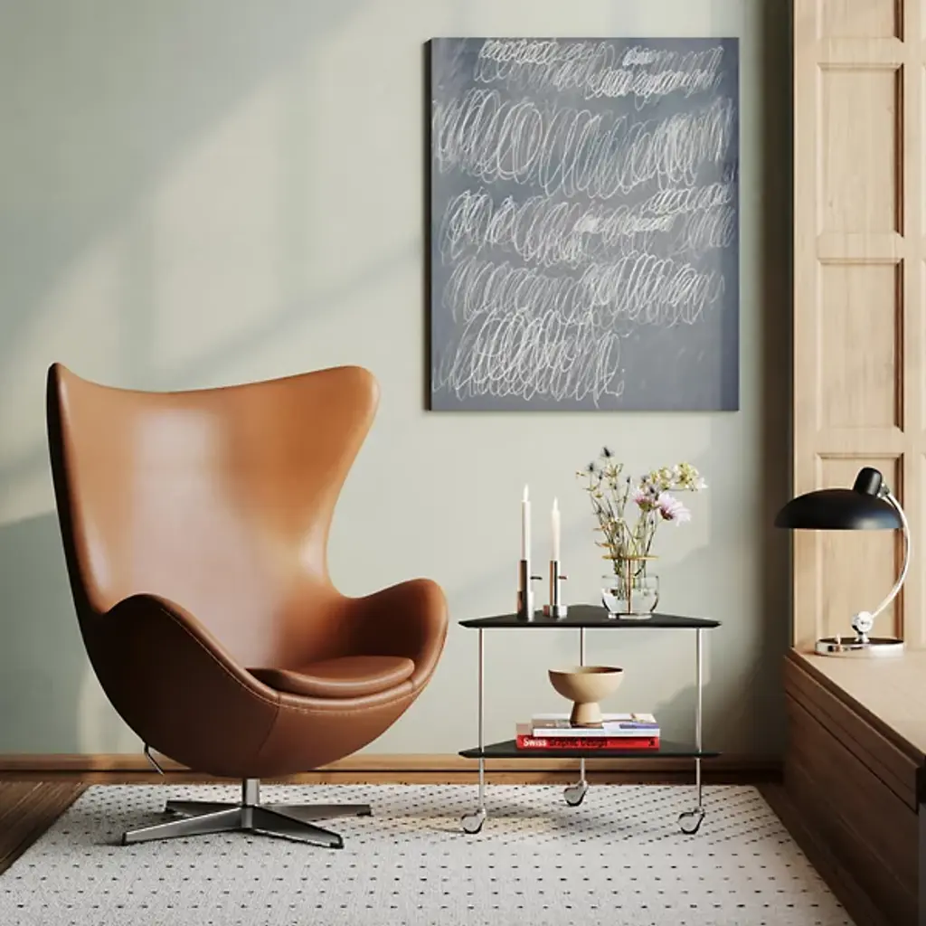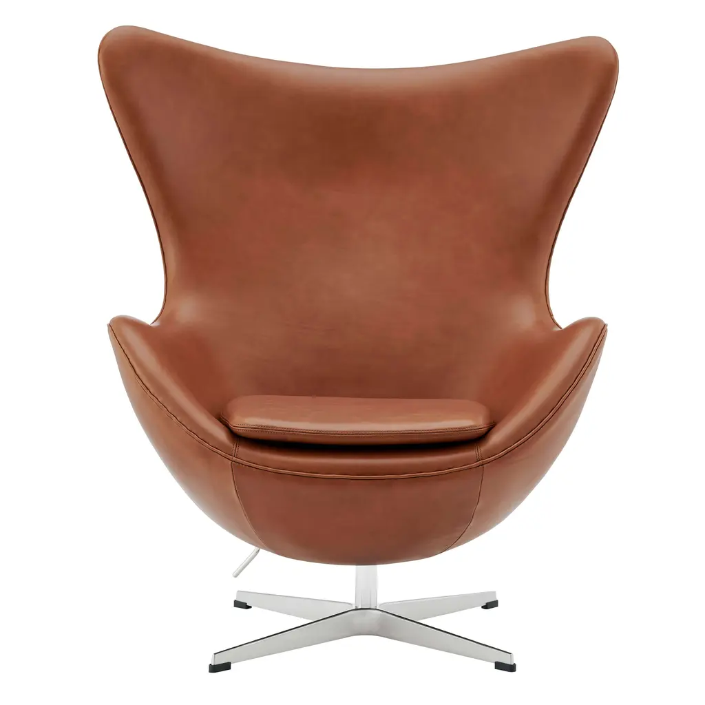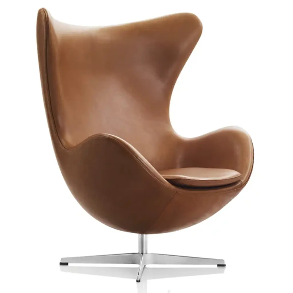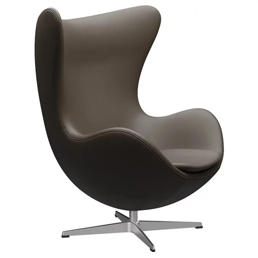 The Egg Leather Swivel Chair from Fritz Hansen is designed by Arne Jacobsen. It combines Scandinavian and mid-century modern styles. This chair received a MoMa Collection award. It has an intricate, curved body that captures the essence of its namesake’s shape, keeping you enveloped as you relax. It is upholstered with leather and filled with polyurethane foam for softness. Yet, it’s reinforced with fiberglass, promising that its durable composition does not compromise comfort. Steel and aluminum keep the chair upright, allowing mobility thanks to convenient felt glides. Swivel capabilities allow you to position yourself easily. It’s FSC-Certified, featuring materials sourced from responsibly managed forests.