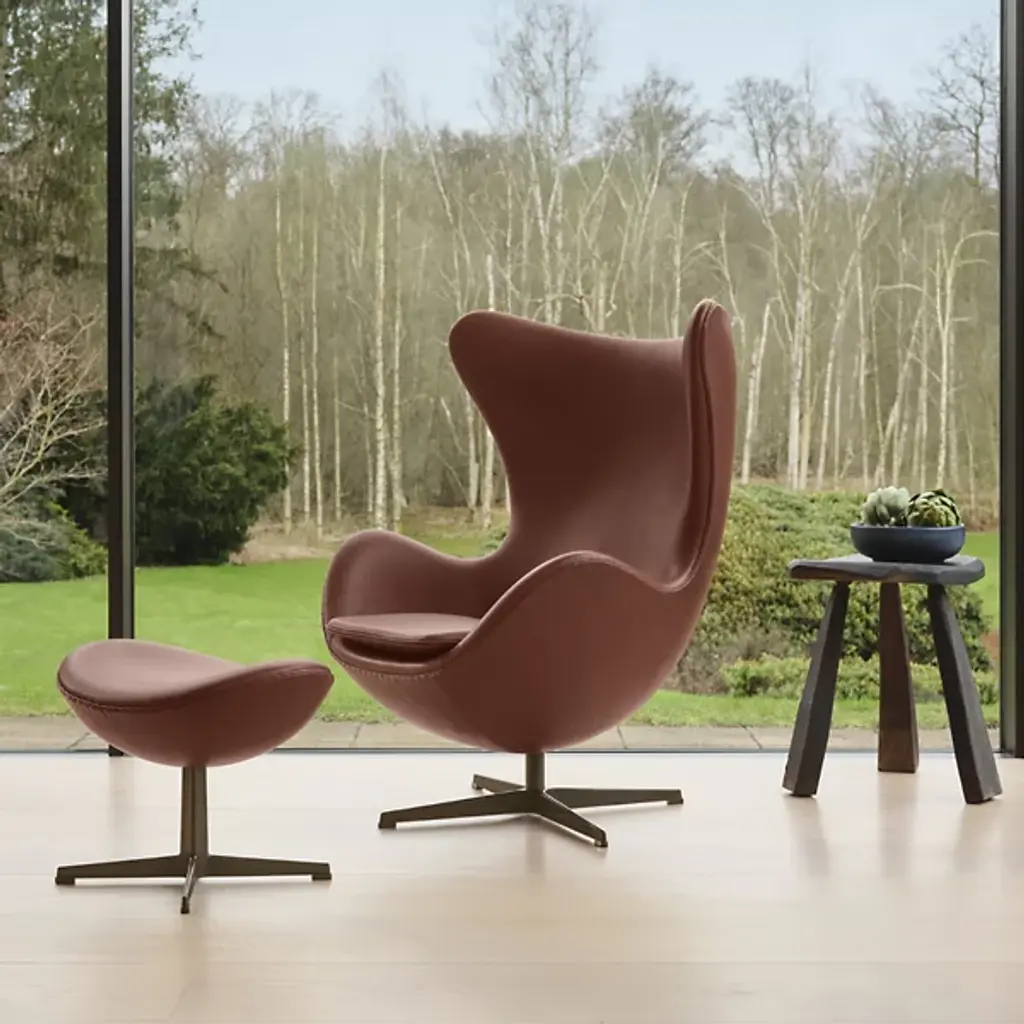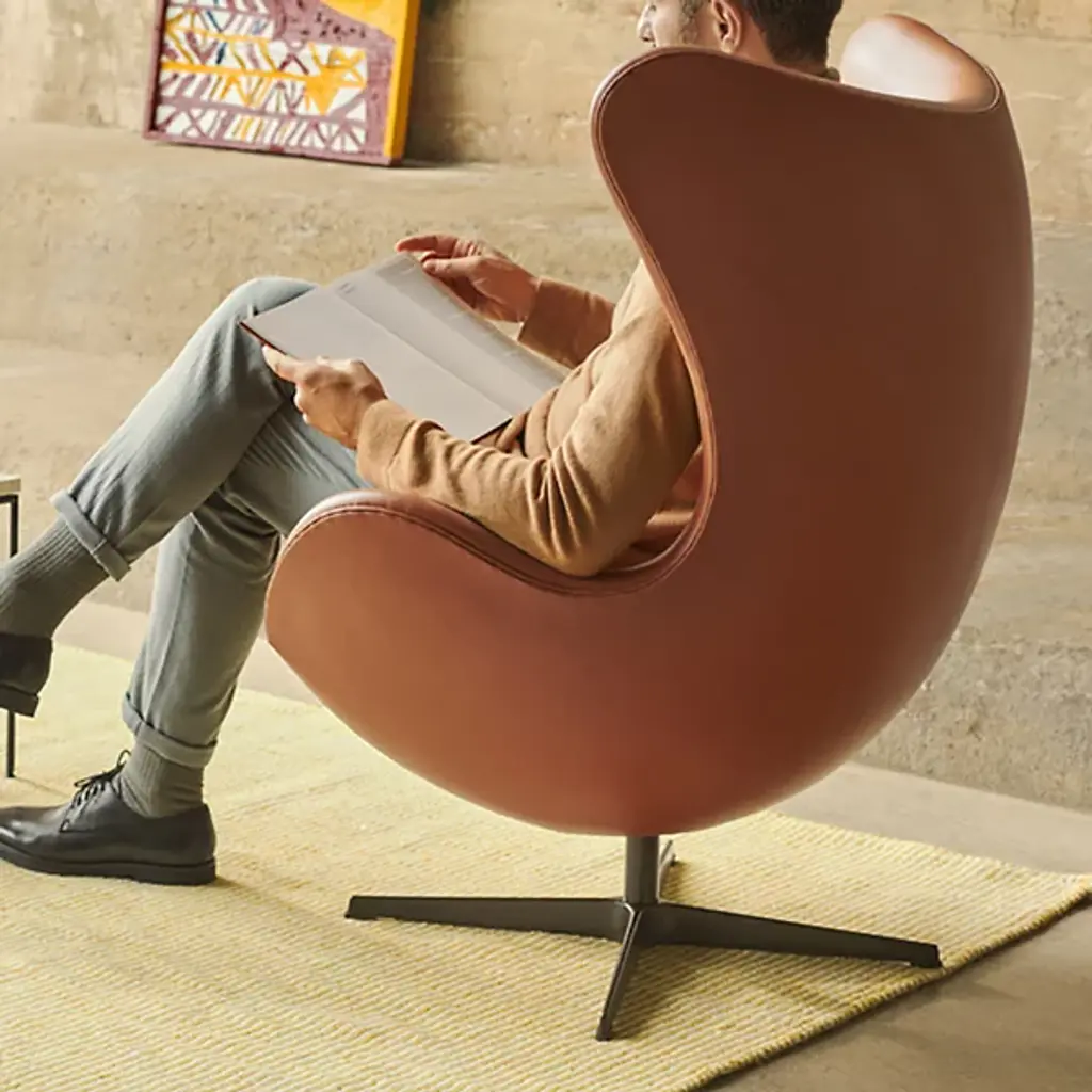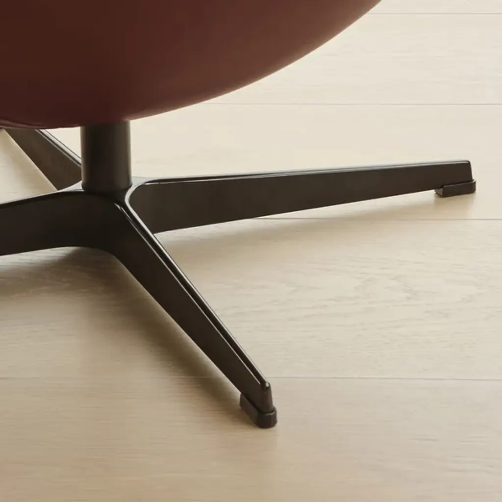 The Egg Leather Swivel Chair from Fritz Hansen is designed by Arne Jacobsen. It combines Scandinavian and mid-century modern styles. This chair received a MoMa Collection award. It has an intricate, curved body that captures the essence of its namesake’s shape, keeping you enveloped as you relax. It is upholstered with leather and filled with polyurethane foam for softness. Yet, it’s reinforced with fiberglass, promising that its durable composition does not compromise comfort. Steel and aluminum keep the chair upright, allowing mobility thanks to convenient felt glides. Swivel capabilities allow you to position yourself easily. It’s FSC-Certified, featuring materials sourced from responsibly managed forests.