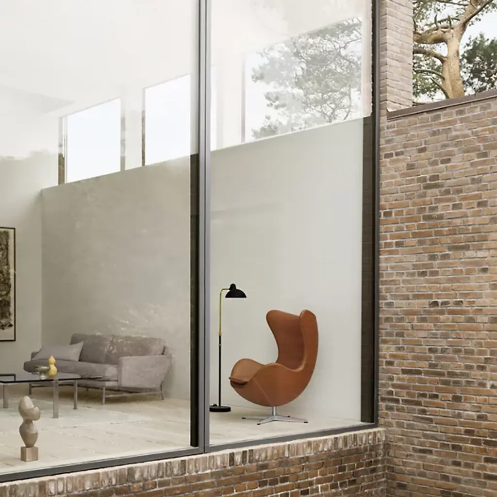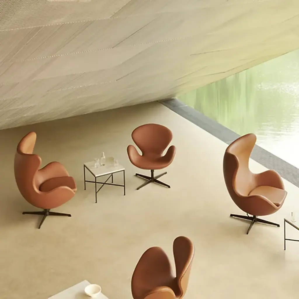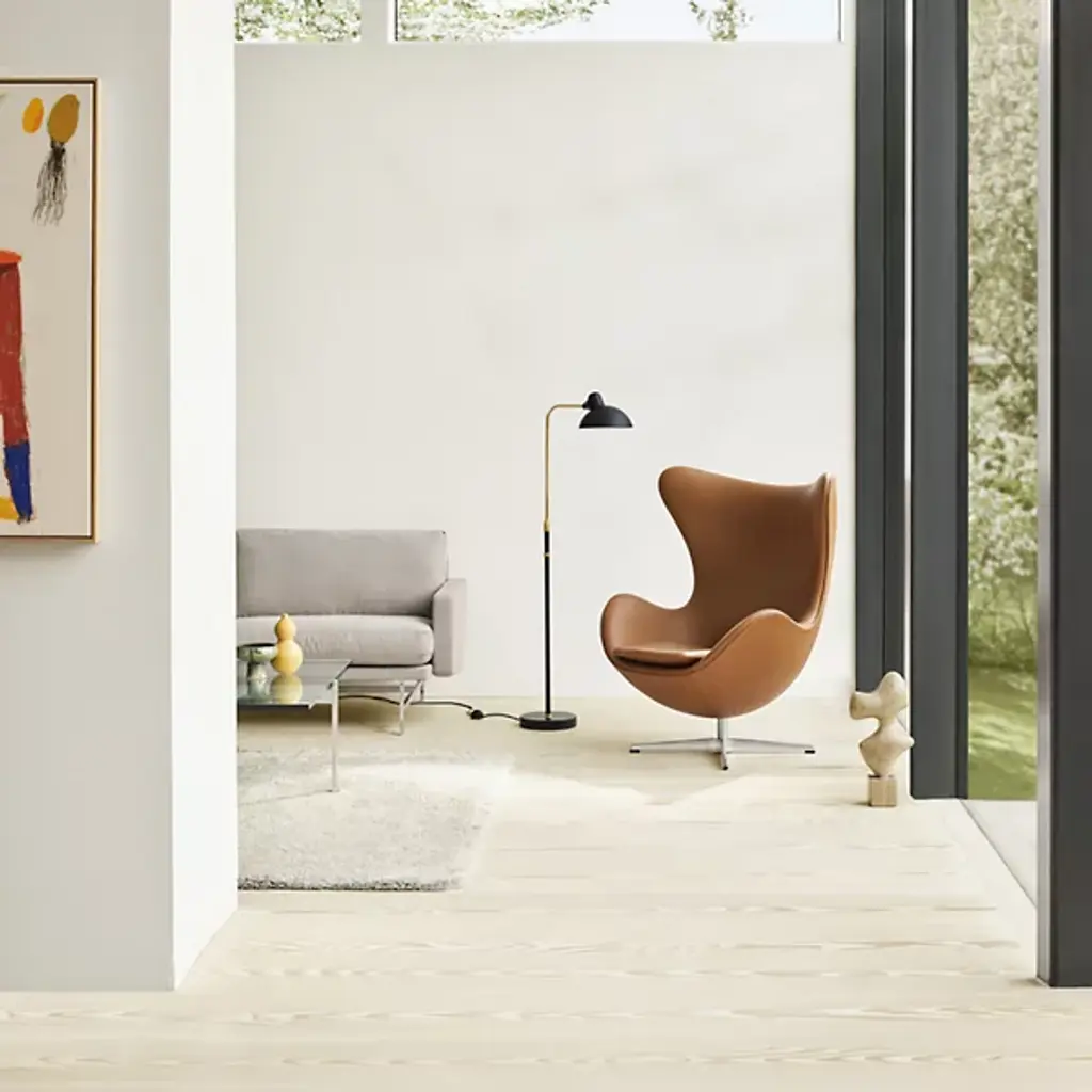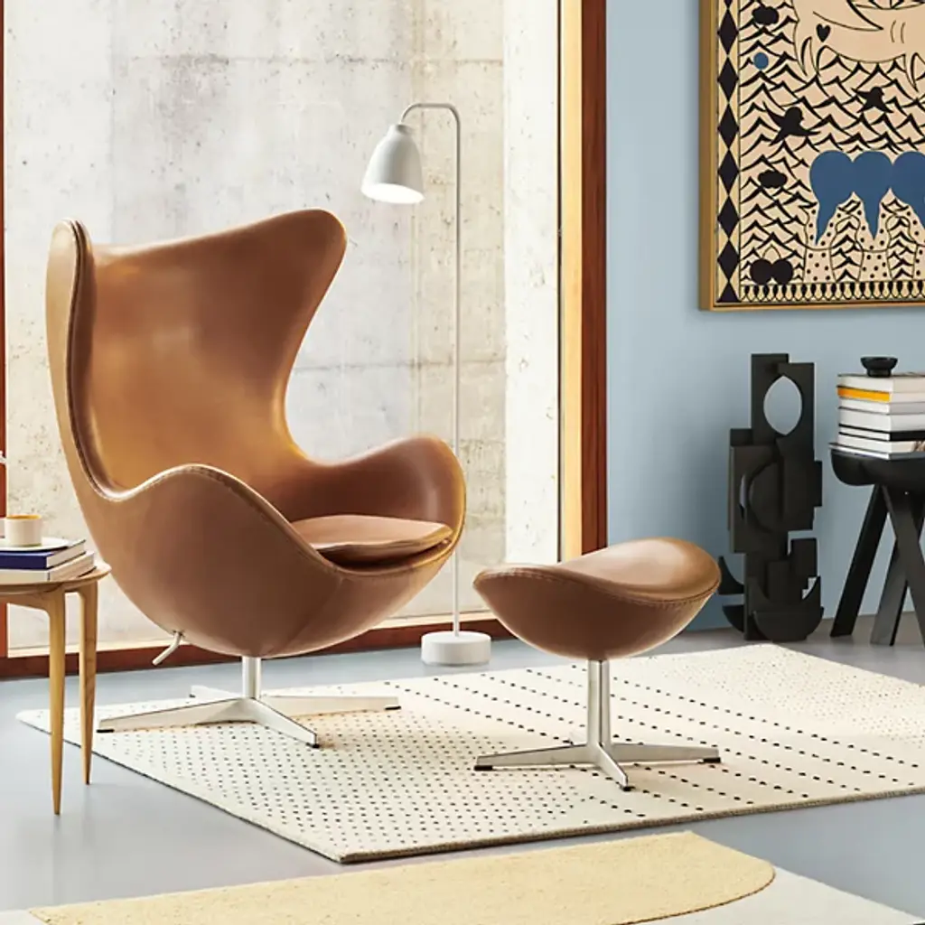 The Egg Leather Swivel Chair from Fritz Hansen is designed by Arne Jacobsen. It combines Scandinavian and mid-century modern styles. This chair received a MoMa Collection award. It has an intricate, curved body that captures the essence of its namesake’s shape, keeping you enveloped as you relax. It is upholstered with leather and filled with polyurethane foam for softness. Yet, it’s reinforced with fiberglass, promising that its durable composition does not compromise comfort. Steel and aluminum keep the chair upright, allowing mobility thanks to convenient felt glides. Swivel capabilities allow you to position yourself easily. It’s FSC-Certified, featuring materials sourced from responsibly managed forests.