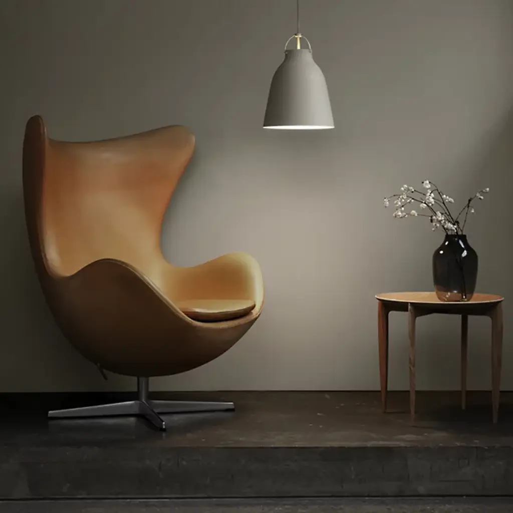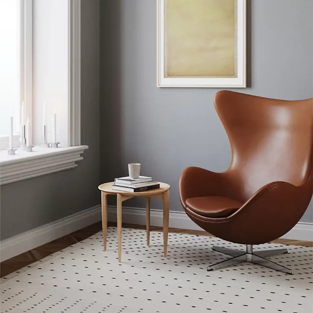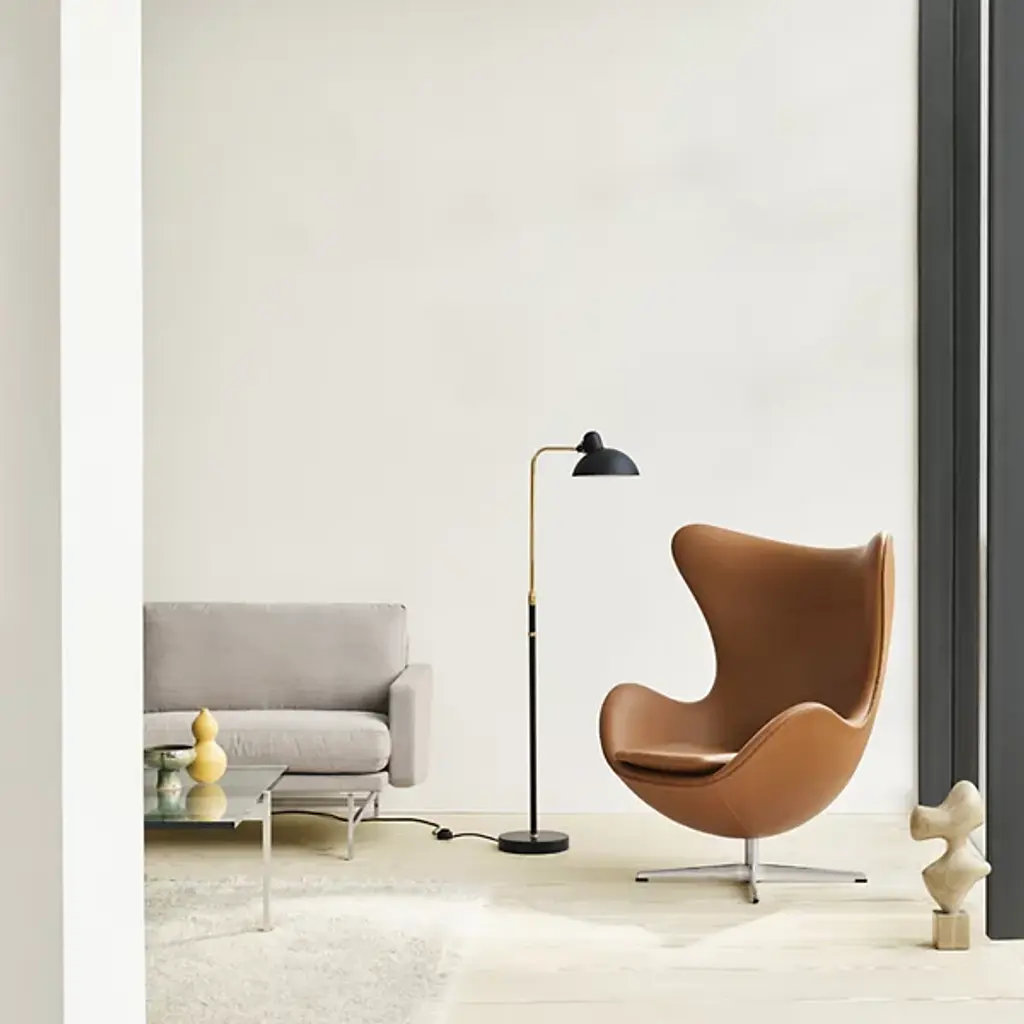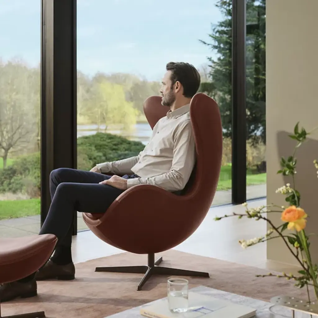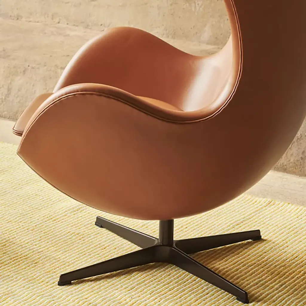 The Egg Leather Swivel Chair from Fritz Hansen is designed by Arne Jacobsen. It combines Scandinavian and mid-century modern styles. This chair received a MoMa Collection award. It has an intricate, curved body that captures the essence of its namesake’s shape, keeping you enveloped as you relax. It is upholstered with leather and filled with polyurethane foam for softness. Yet, it’s reinforced with fiberglass, promising that its durable composition does not compromise comfort. Steel and aluminum keep the chair upright, allowing mobility thanks to convenient felt glides. Swivel capabilities allow you to position yourself easily. It’s FSC-Certified, featuring materials sourced from responsibly managed forests.