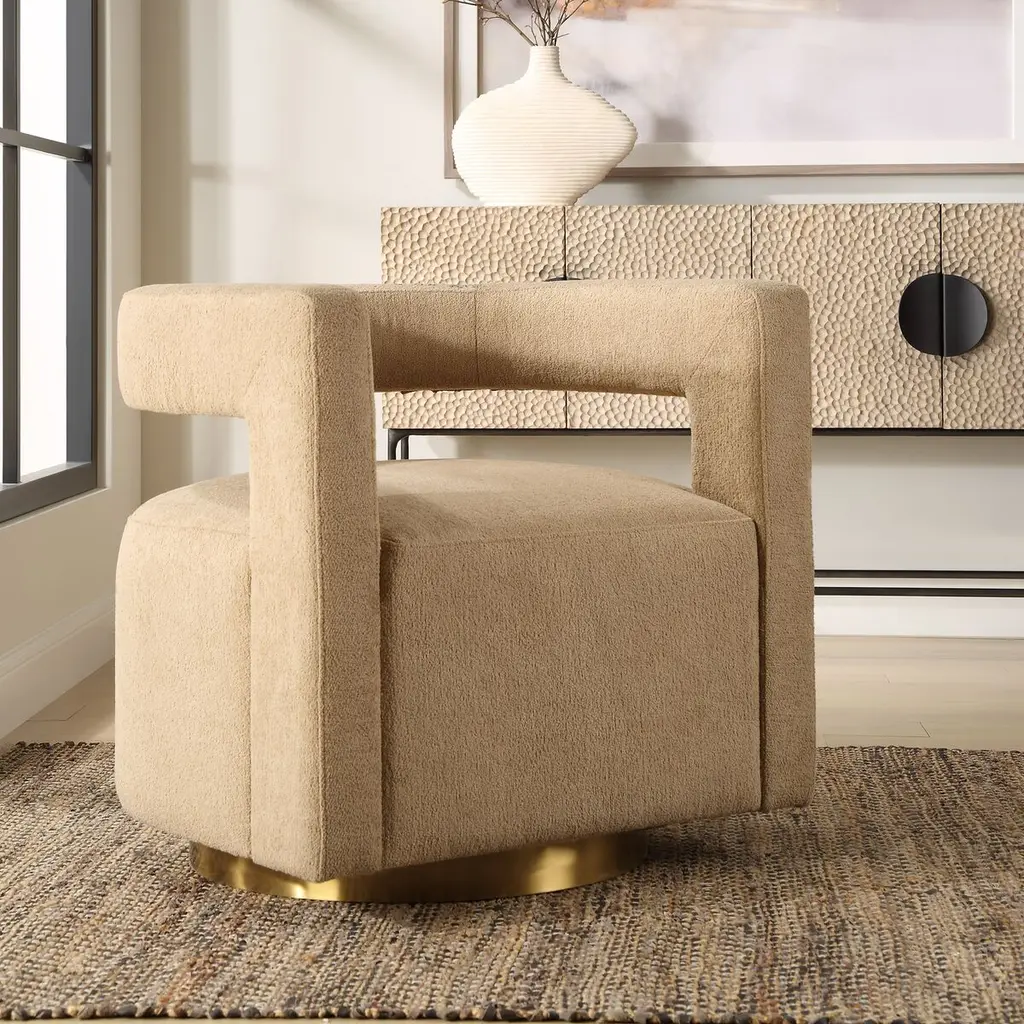 Indulge in the luxurious embrace of the Elina Swivel Chair, where modern elegance meets timeless romance. This exquisite piece captivates with its floating barrel back design, inviting you to sink into its sumptuous curves. Upholstered in a textured boucle fabric, it offers a tactile experience that whispers of sophistication and warmth. The chair's plinth swivel base, crafted from brushed brass plated stainless steel, adds a touch of opulence, allowing you to glide effortlessly into a world of comfort and style. Let this chair be the centerpiece of your living space, a testament to the art of refined relaxation.