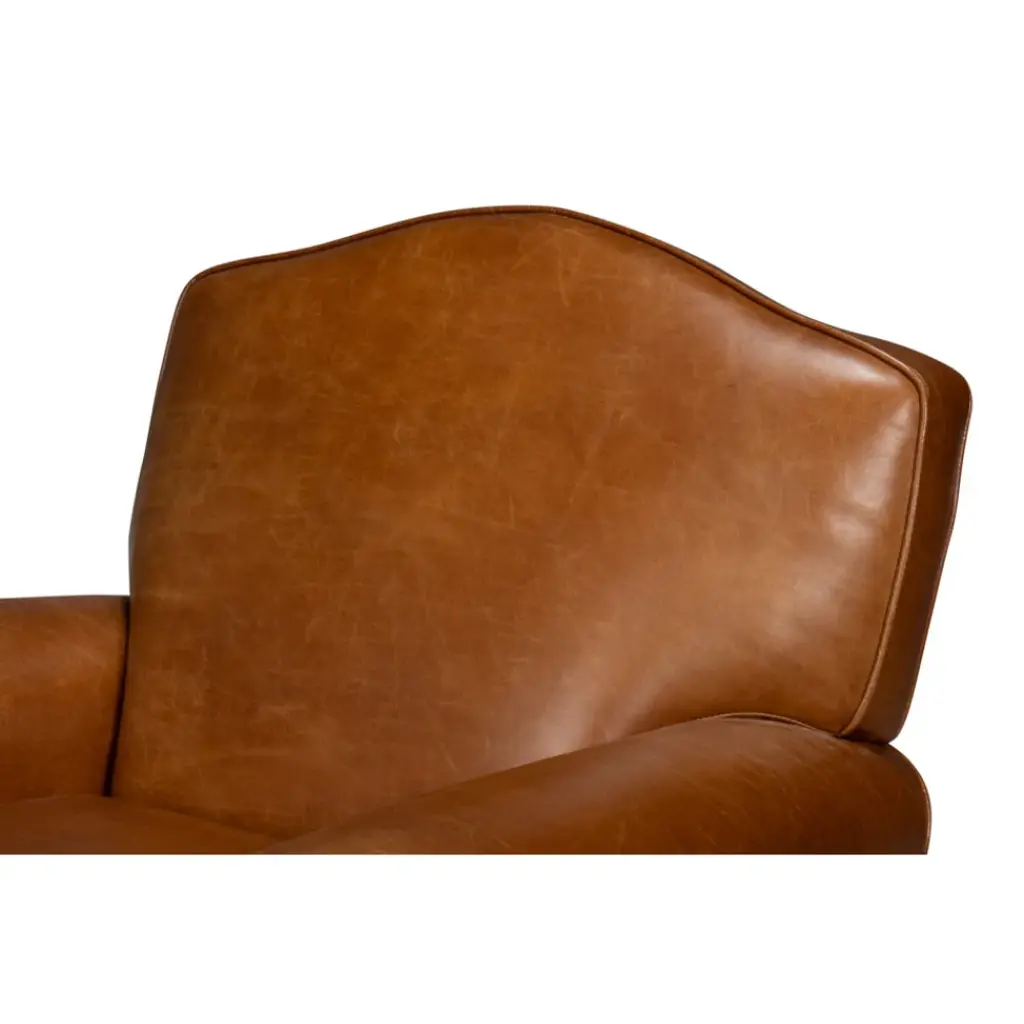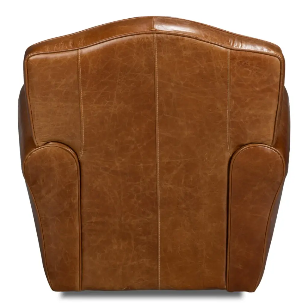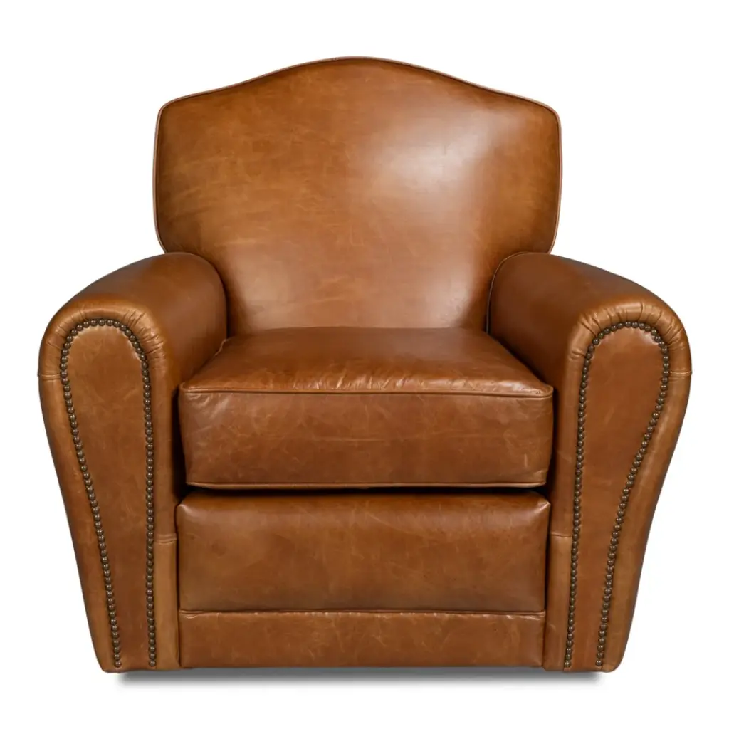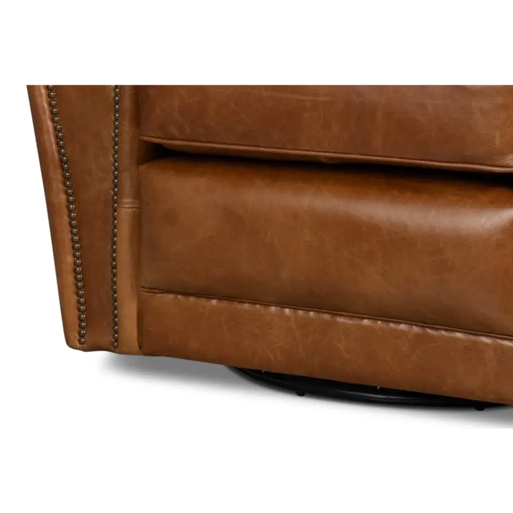 Comfort gets hip with the addition of a swivel component to a traditional Cuba brown leather chair. Wide rounded arms are accented with brass nailhead detail. Alone or in a pair, this handsome chair will add timeless appeal to your room.