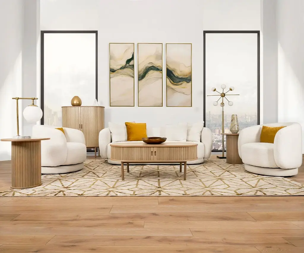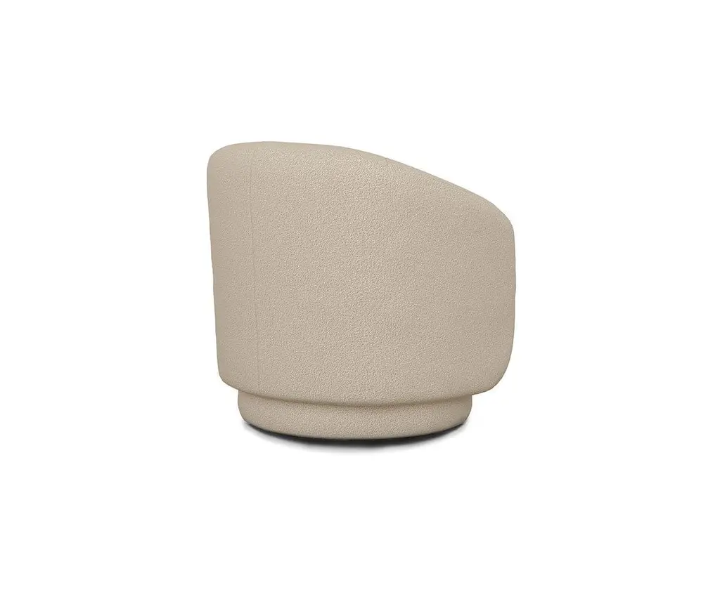 The Ellie Swivel Chair combines contemporary design with undeniable coziness. A gracefully curved back envelopes you while you sit, while soft boucle upholstery blankets you with comfort. Stylish channeling elevates this chair, giving it a touch of elegance that goes hand in hand with the clean lines and modern design. Memory swivel action allows you to smoothly turn 180° for conversational purposes, and ensures that your chair will remain facing forwards when not occupied.