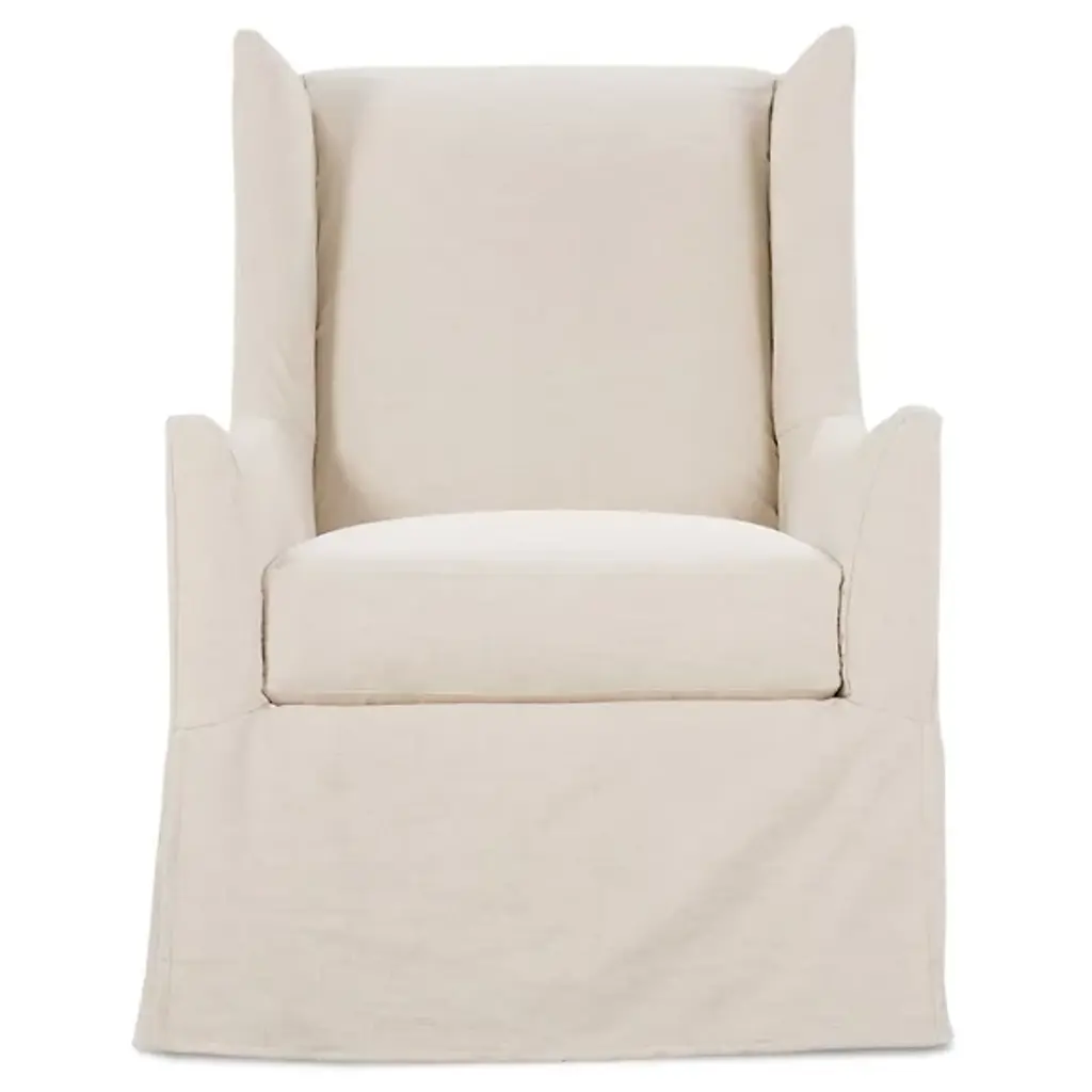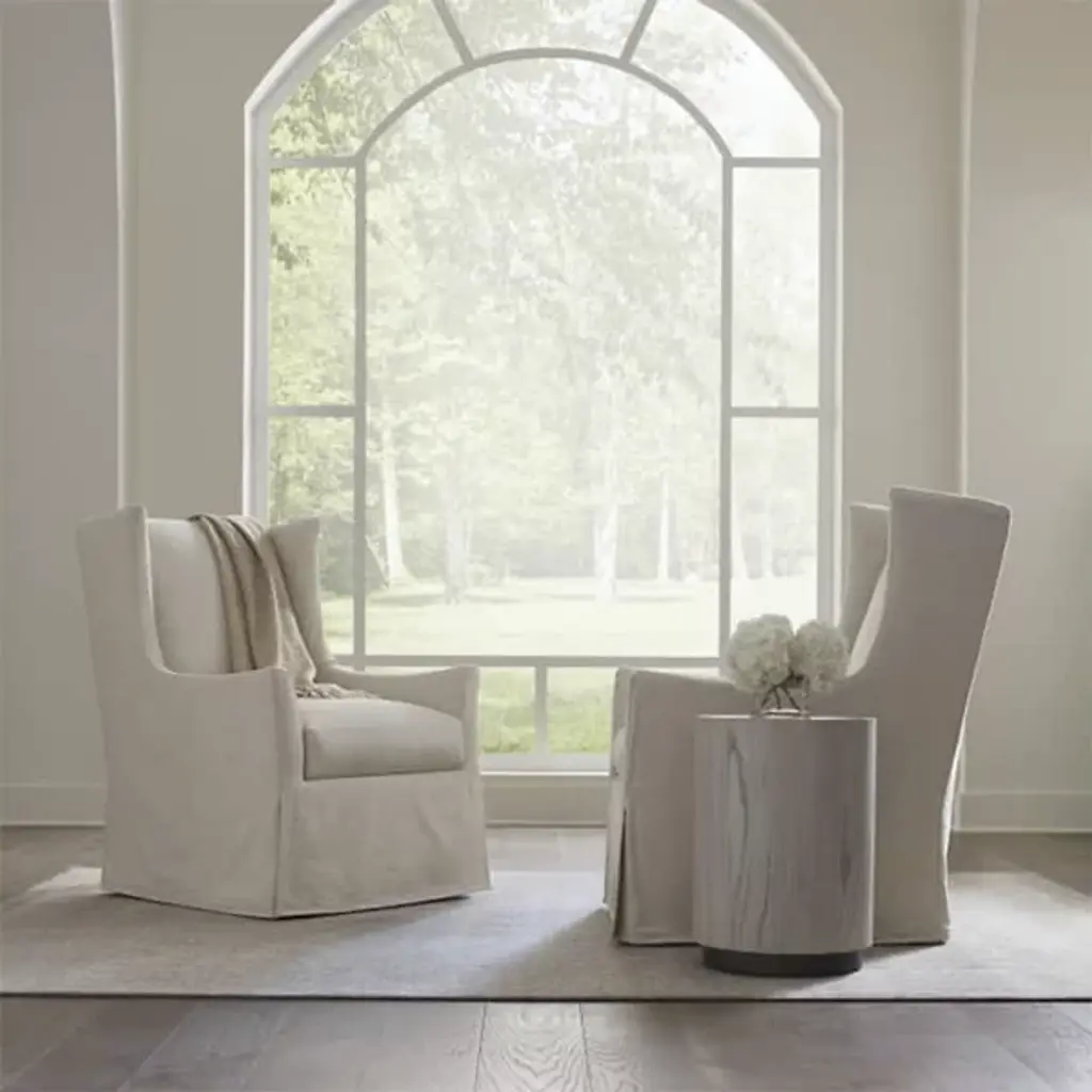 The Ellory Slipcover Swivel Chair from Rowe Furniture works perfectly in spaces ranging from nurseries to formal settings. Its cotton-linen blend cover removes for simple cleaning, while the metal base enables smooth rotation. The chair’s high-resiliency foam core, free of PBDEs and flame retardants, reflects environmental consciousness. Its cloud cushion system responds well to regular fluffing and rotation, maintaining optimal comfort. This adaptable chair combines movement with maintenance ease.