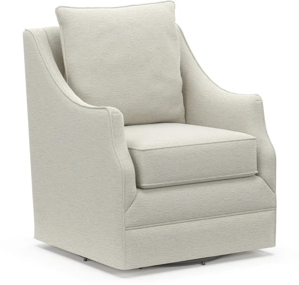 Exclusive to One Kings Lane: This swivel chair is designed with a sloped track arm and upholstered in Crypton --an eco-friendly high-performance fabric--which repels stains, spills, bacteria, and mold. Constructed of an engineered hardwood-laminate frame, eight-way hand-tied suspension system, and a spring foam cushion with down-proof ticking ensure long-lasting comfort and support. Each piece is handcrafted by skilled artisans in High Point, NC and offers a lifetime warranty on the frame and suspension system and a limited lifetime warranty on the seat cushion.