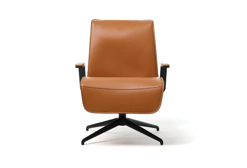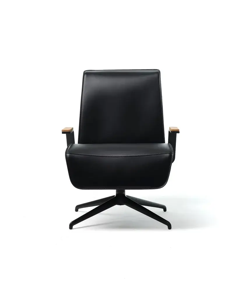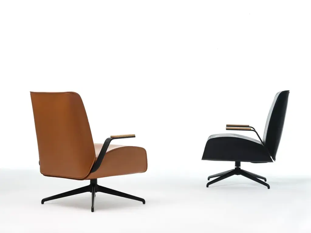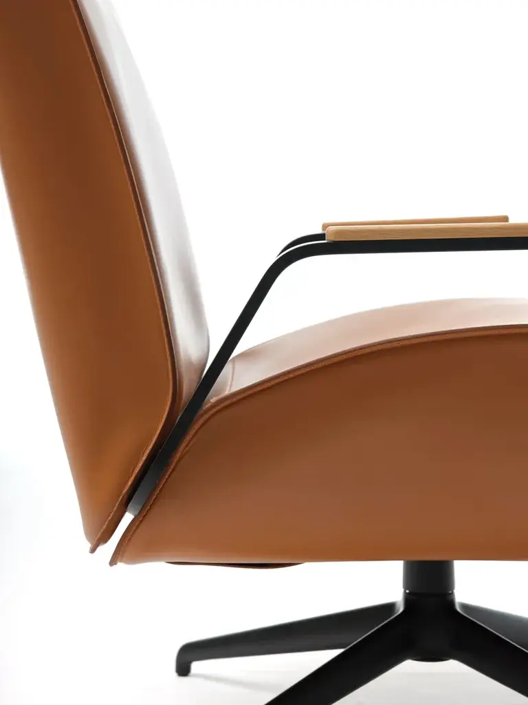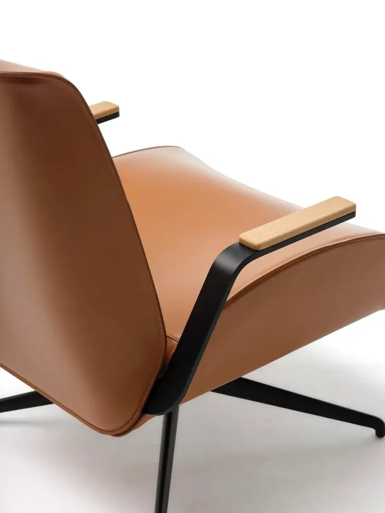 Endo is a swivel leather armchair, restrained in its lines and volumes, yet materially rich.Its internal structure consists of steel tube frames over which leather panels are stretched and stitched. No polyurethane foam or elastic webbing is used inside, optimizing both the sustainability and the aesthetic character of the armchair: over time, the leather will adapt to the body’s shape, making each Endo chair unique. The steel armrests, seamlessly integrated into the design, are topped with a thin oak veneer for a warmer, more inviting tactile experience. A 4-spoke swivel base with automatic return follows the body's movements, enhancing seating comfort.Available in 15 colors. Powder-coated steel base and internal frames; outer shell in leather.