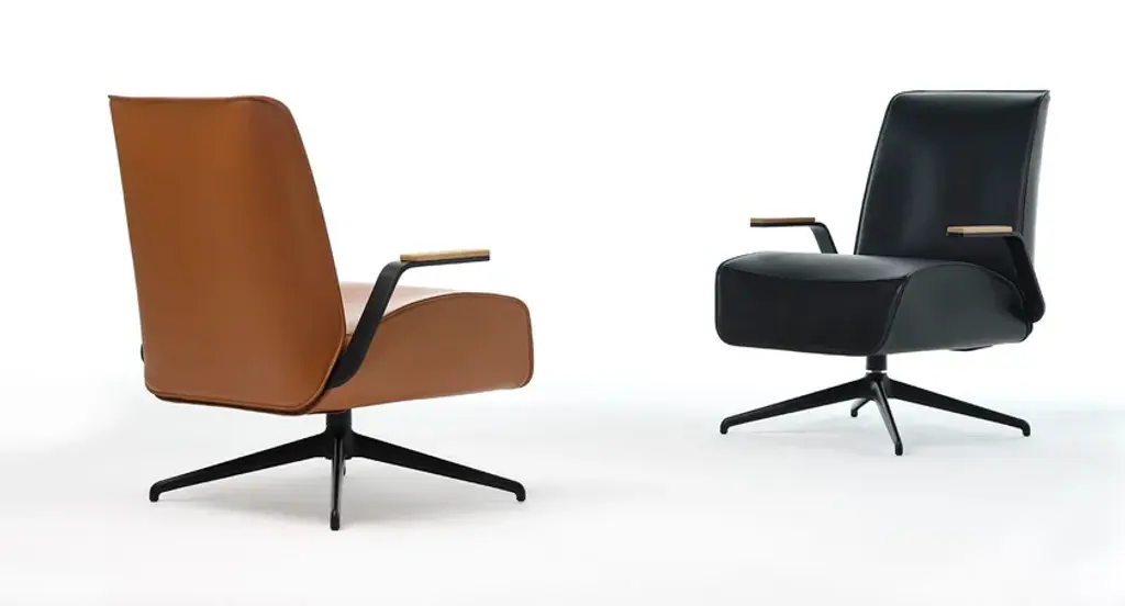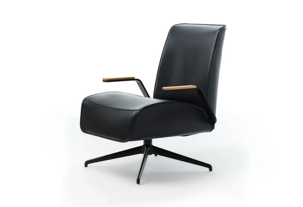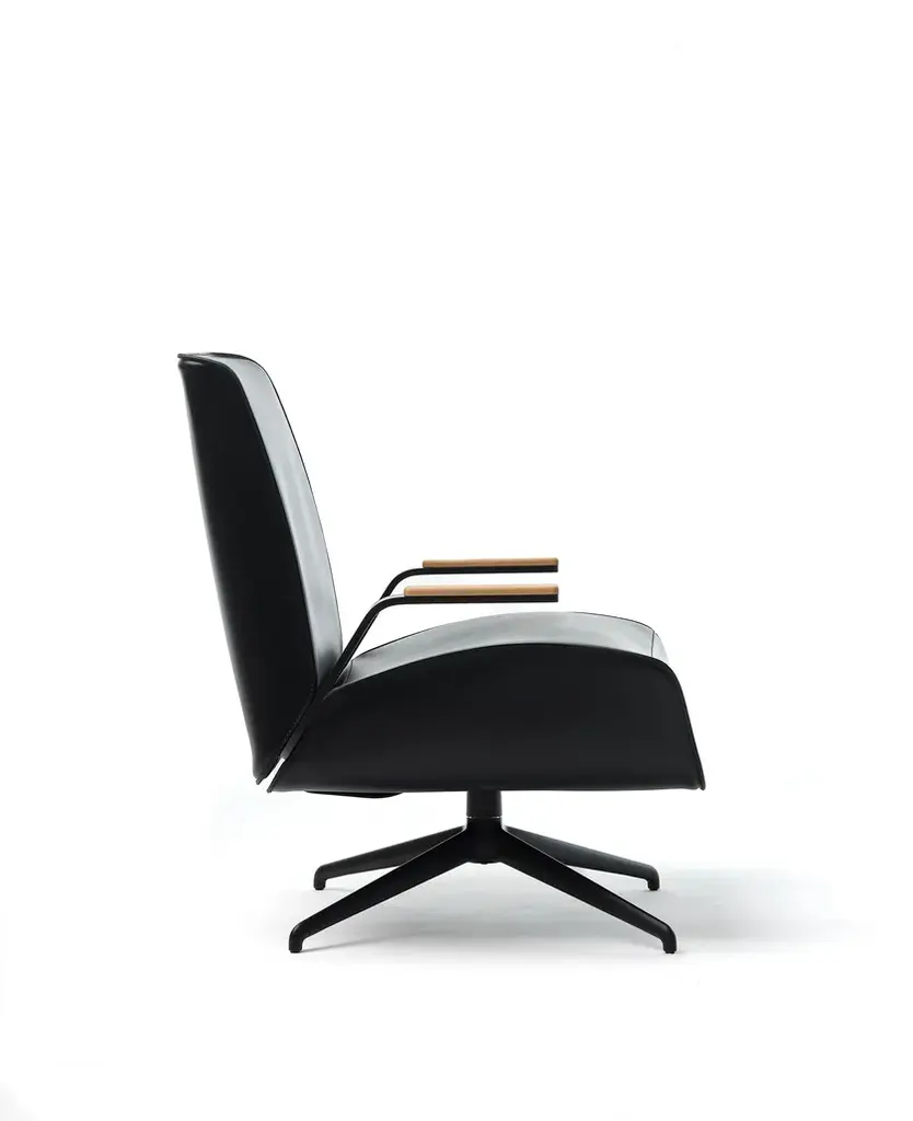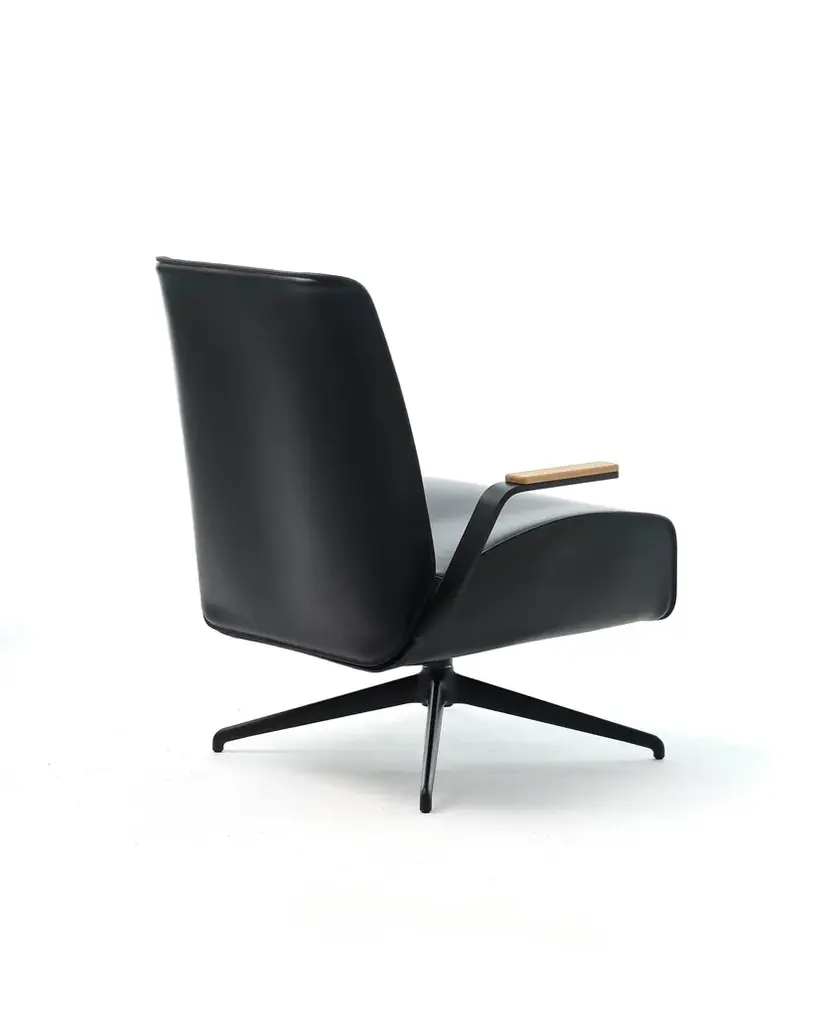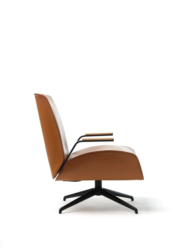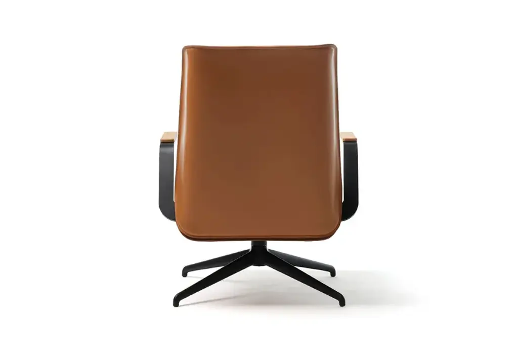 Endo is a swivel leather armchair, restrained in its lines and volumes, yet materially rich.Its internal structure consists of steel tube frames over which leather panels are stretched and stitched. No polyurethane foam or elastic webbing is used inside, optimizing both the sustainability and the aesthetic character of the armchair: over time, the leather will adapt to the body’s shape, making each Endo chair unique. The steel armrests, seamlessly integrated into the design, are topped with a thin oak veneer for a warmer, more inviting tactile experience. A 4-spoke swivel base with automatic return follows the body's movements, enhancing seating comfort.Available in 15 colors. Powder-coated steel base and internal frames; outer shell in leather.