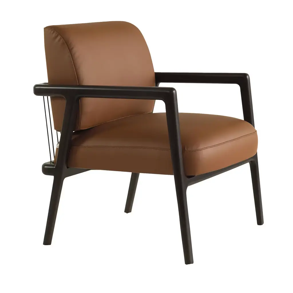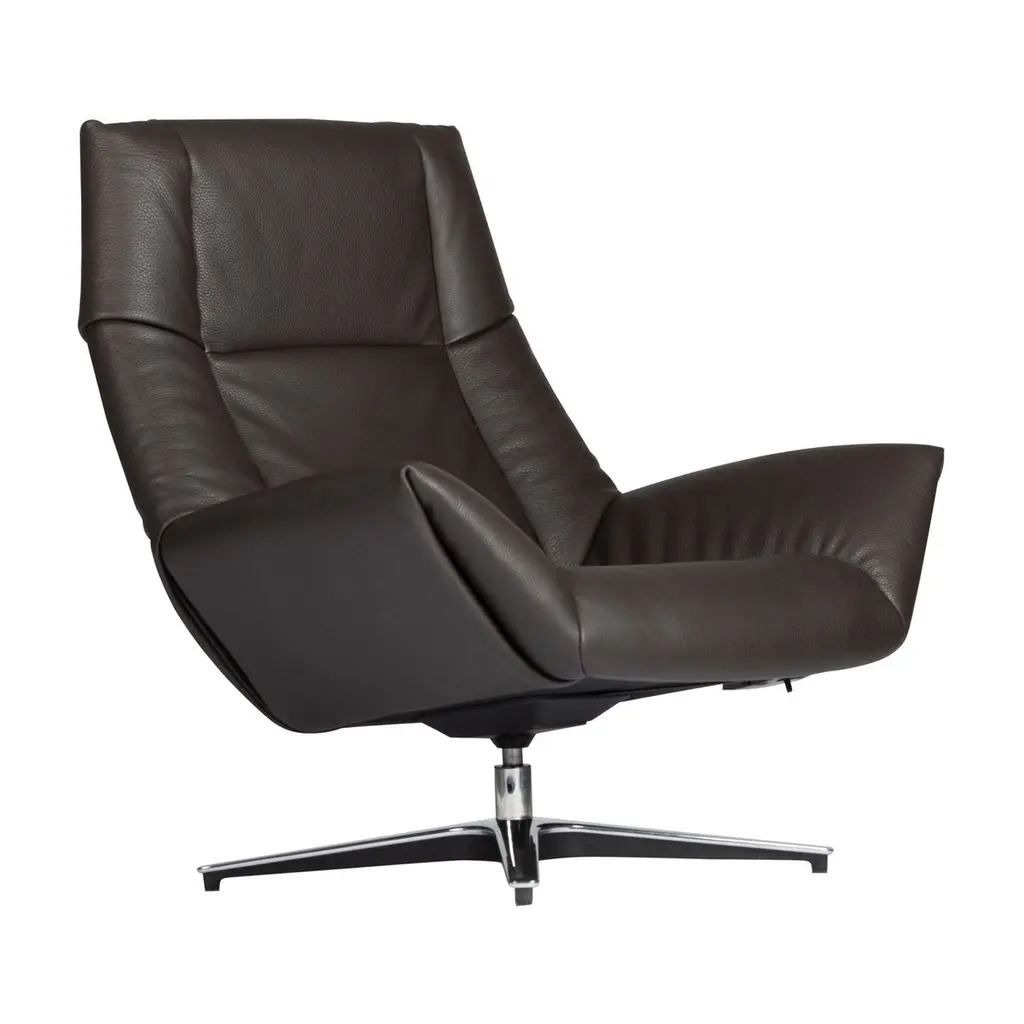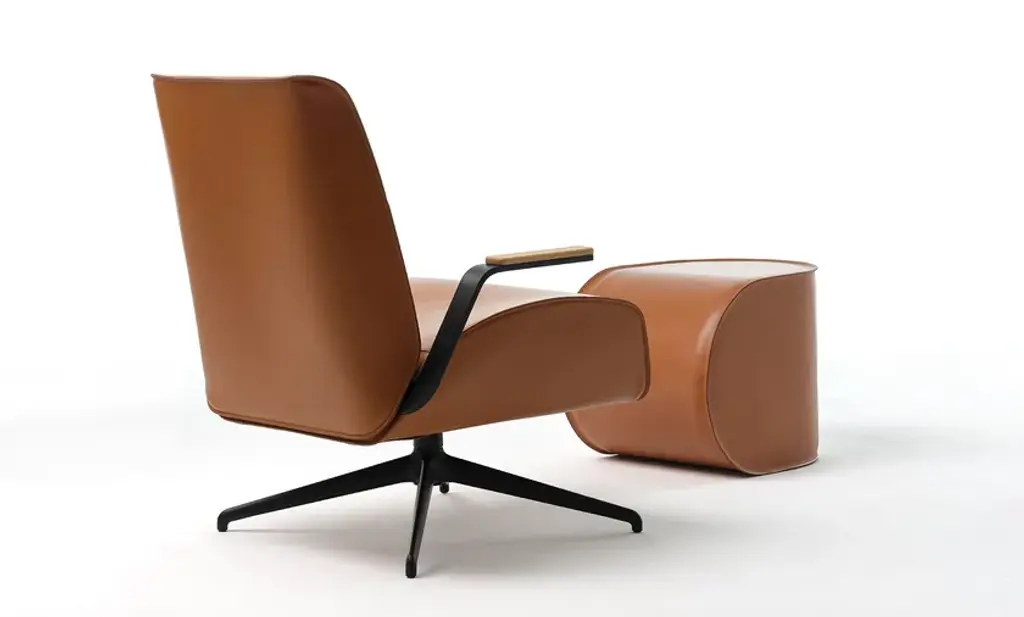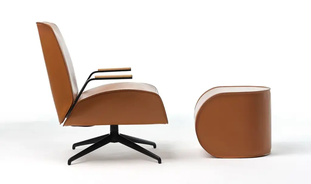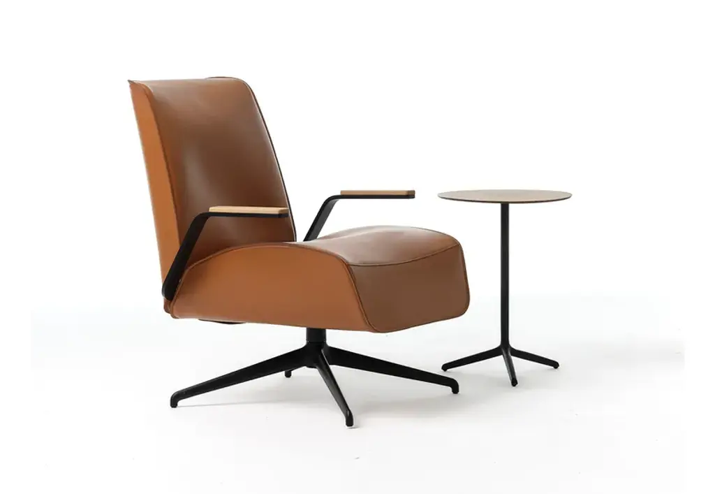 Endo is a swivel leather armchair, restrained in its lines and volumes, yet materially rich.Its internal structure consists of steel tube frames over which leather panels are stretched and stitched. No polyurethane foam or elastic webbing is used inside, optimizing both the sustainability and the aesthetic character of the armchair: over time, the leather will adapt to the body’s shape, making each Endo chair unique. The steel armrests, seamlessly integrated into the design, are topped with a thin oak veneer for a warmer, more inviting tactile experience. A 4-spoke swivel base with automatic return follows the body's movements, enhancing seating comfort.Available in 15 colors. Powder-coated steel base and internal frames; outer shell in leather.