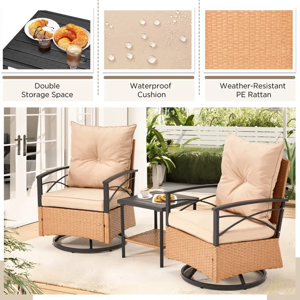 Relax in Style with 3 Pieces Patio Swivel Rocker Rattan Chairs This 3-piece outdoor furniture set features two swivel rocking chairs and a stylish coffee table, designed for your ultimate comfort and convenience. The chairs combine a 360-degree swivel base with a gentle rocking function, allowing you to lounge, read, or chat in total relaxation. Crafted with a durable rustproof steel frame and hand-woven PE rattan, these swivel patio chairs are built to last through all seasons. The thick cushions with zippered covers ensure easy cleaning and maintain their shape over time. The included coffee table boasts a double-layer storage design and a waterproof wood-grain tabletop, perfect for holding your drinks and snacks. Whether you’re decorating your patio, porch, balcony, or poolside, this porch chairs set of 2 is the ideal choice. Simple assembly with clear instructions makes it easy to enjoy your new furniture set in no time.