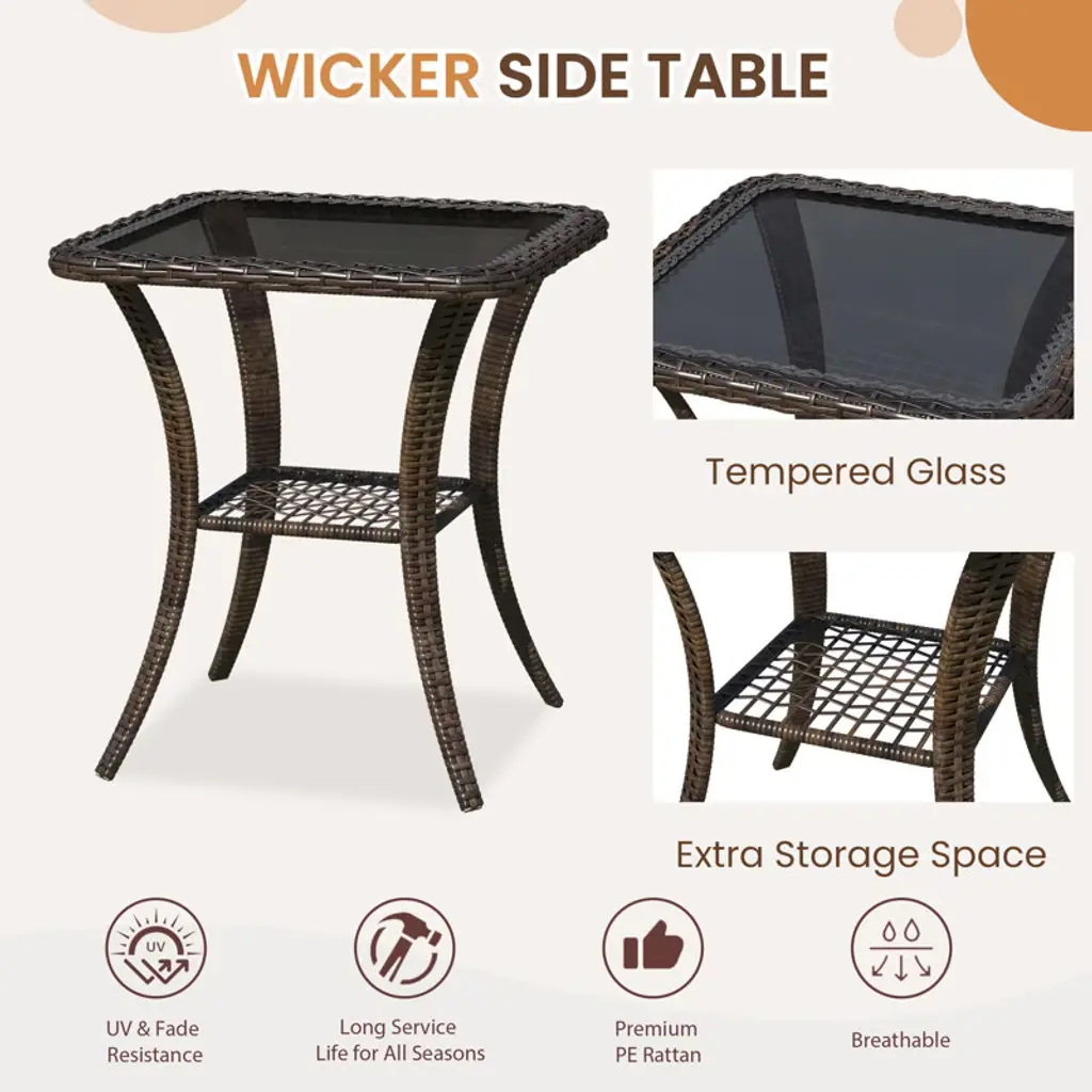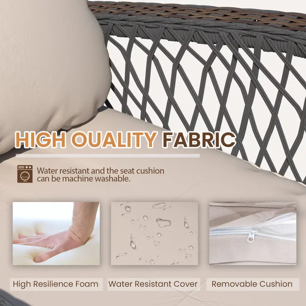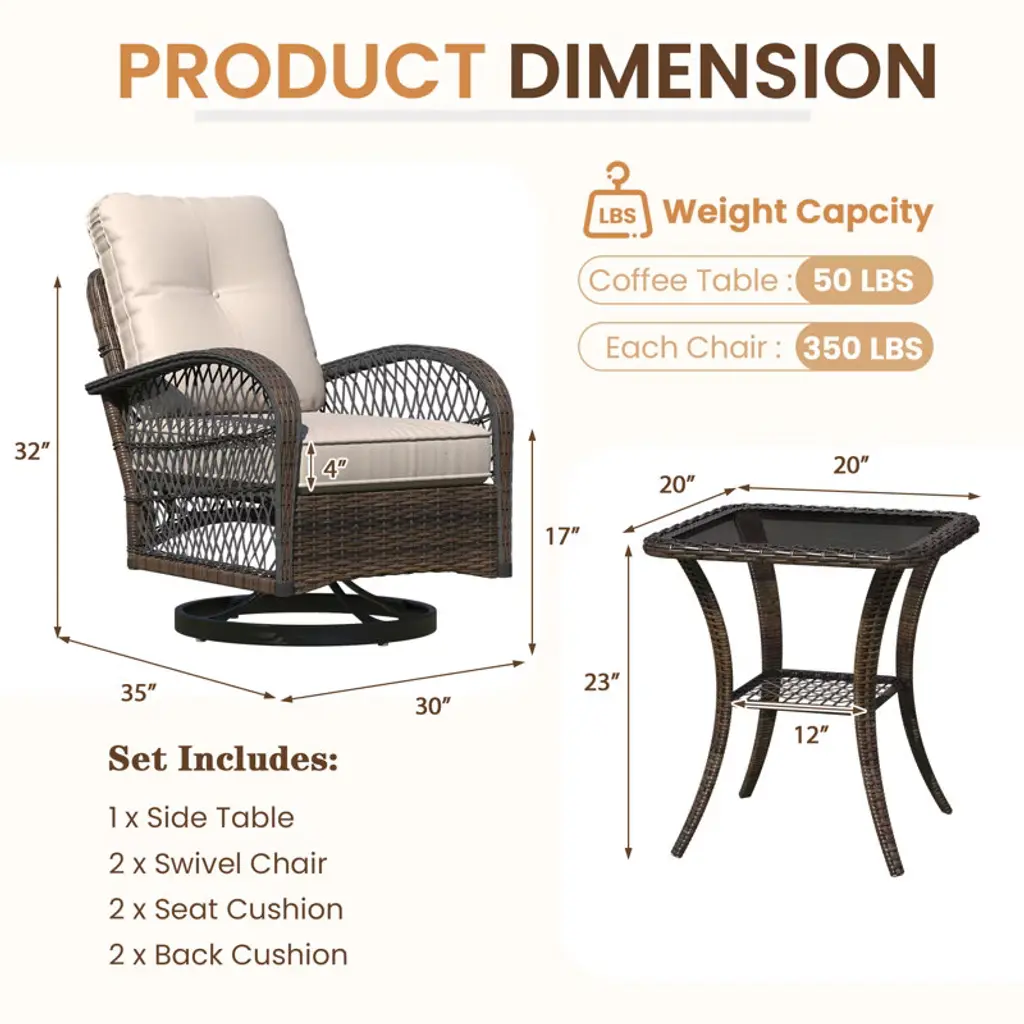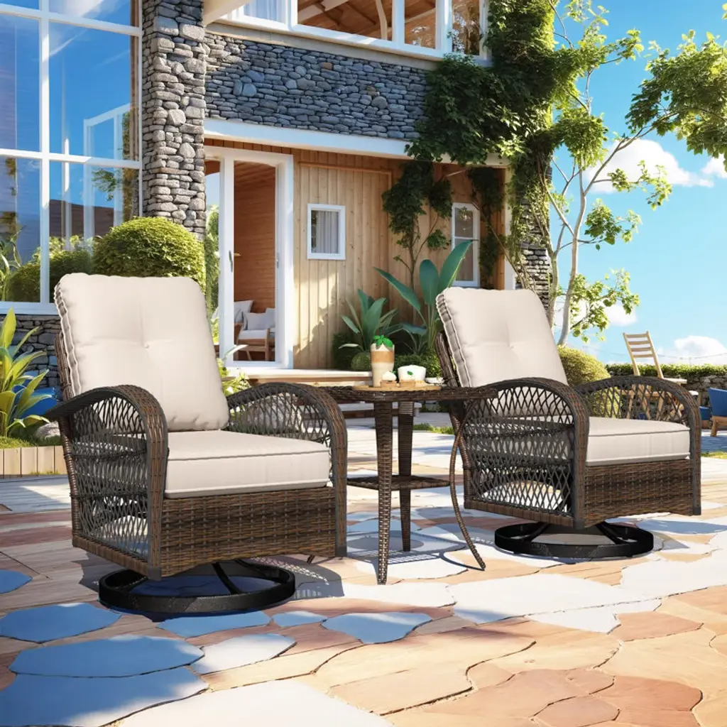 Outdoor Swivel Rocker Bistro Set - 3 Piece Wicker Patio Set with 2 Swivel Rocking Chairs and Side Table Create the perfect outdoor retreat with this stylish and comfortable patio bistro set. Designed with convenience in mind, this set includes two 360° swivel rocking chairs, each offering smooth rocking and the ability to rotate to any direction. The high-quality handwoven PE rattan adds a touch of elegance, while the powder-coated steel frame ensures durability and resistance to the elements. The thick cushions provide ultimate comfort, making it easy to relax for hours on end. The set also includes a durable tempered glass side table that offers extra storage for your drinks, snacks, or other essentials. Ideal for smaller outdoor spaces like balconies, porches, or gardens, this outdoor swivel rocker patio chairs set is a perfect fit for any space. Whether you’re enjoying a quiet morning with a book or entertaining friends, this set ensures comfort and style.
