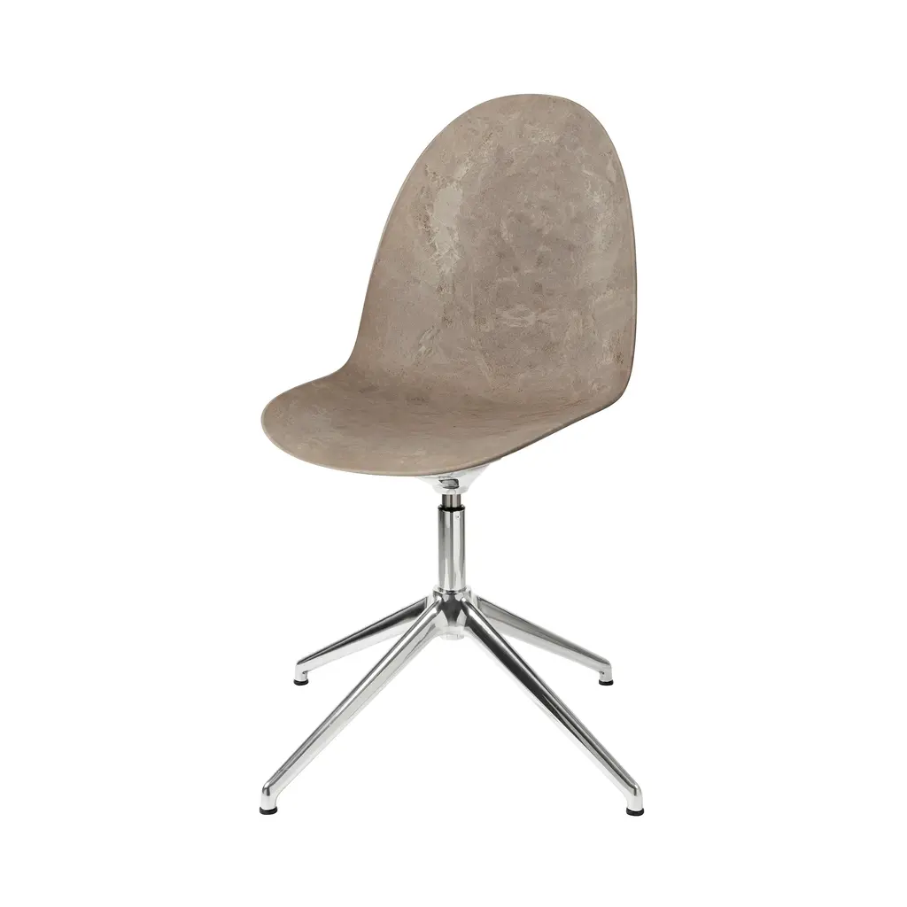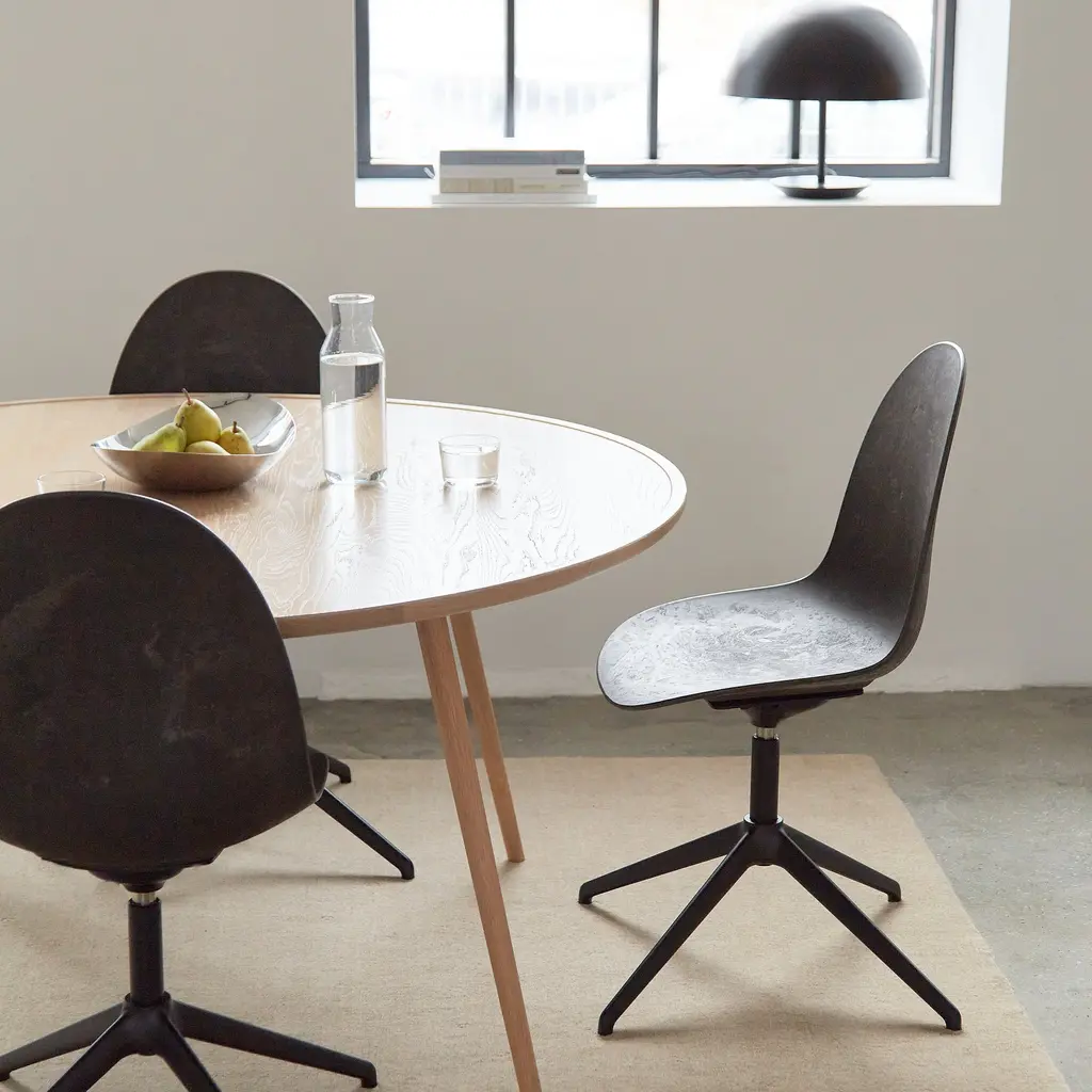 The Eternity Swivel Chair, designed by Space Copenhagen, is a sustainable piece made from innovative Matek® material and is available in 4 colors. This material combines recycled fibers with plastic waste. The base is crafted from 96% recycled aluminum and comes in a polished aluminum or black finish. Designed for both private and public spaces, the chair is built for disassembly, ensuring all components can be recycled.