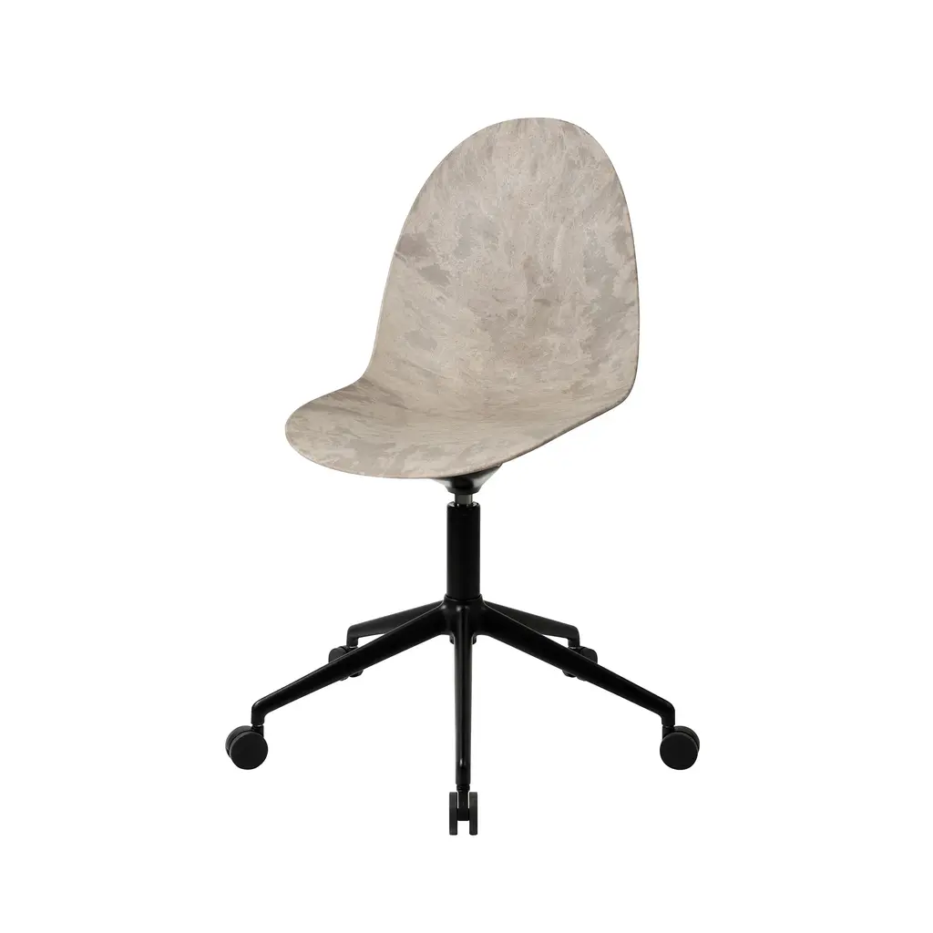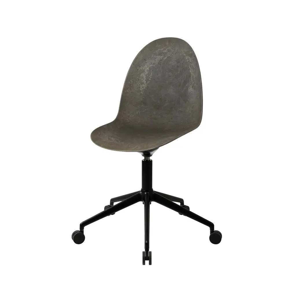 The Eternity Swivel Chair, designed by Space Copenhagen, is a sustainable piece made from innovative Matek® material that is available in 4 colors. This material combines recycled fibers with plastic waste. The base is crafted from 96% recycled aluminum and comes in a polished aluminum or black finish. Designed for both private and public spaces, the chair is built for disassembly, ensuring all components can be recycled. This variation is equipped with castors for easy mobility, making it ideal for both private and public spaces.