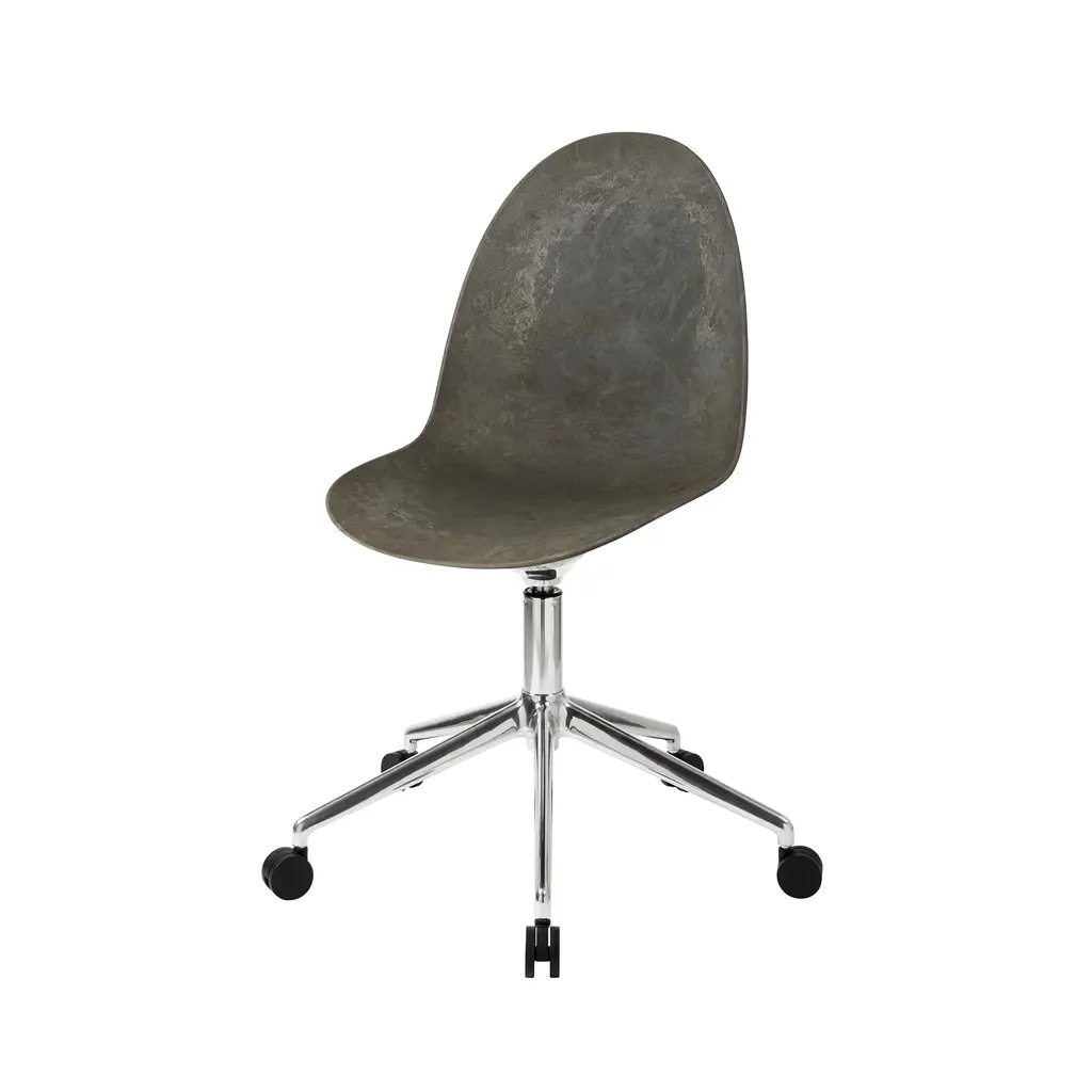 The Eternity Swivel Chair, designed by Space Copenhagen, is a sustainable piece made from innovative Matek® material that is available in 4 colors. This material combines recycled fibers with plastic waste. The base is crafted from 96% recycled aluminum and comes in a polished aluminum or black finish. Designed for both private and public spaces, the chair is built for disassembly, ensuring all components can be recycled. This variation is equipped with castors for easy mobility, making it ideal for both private and public spaces.