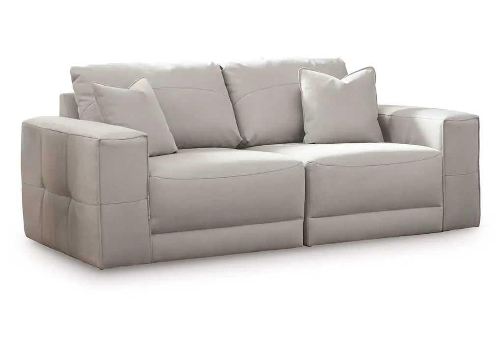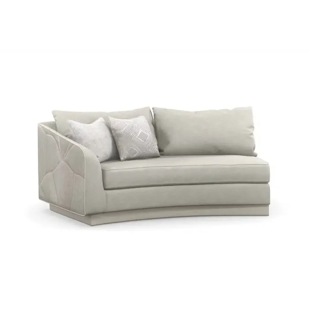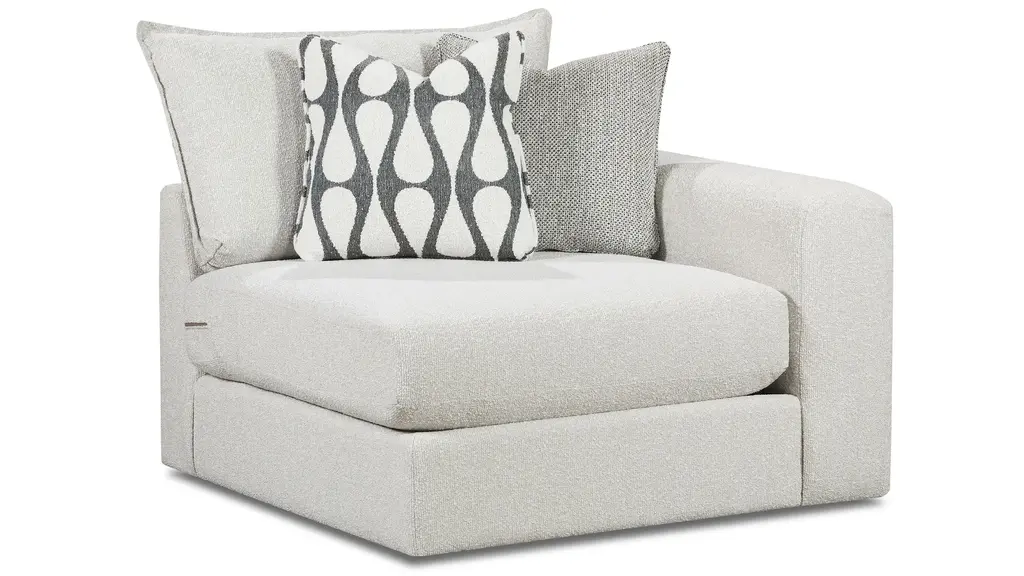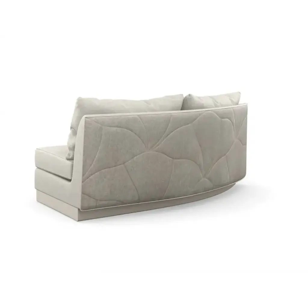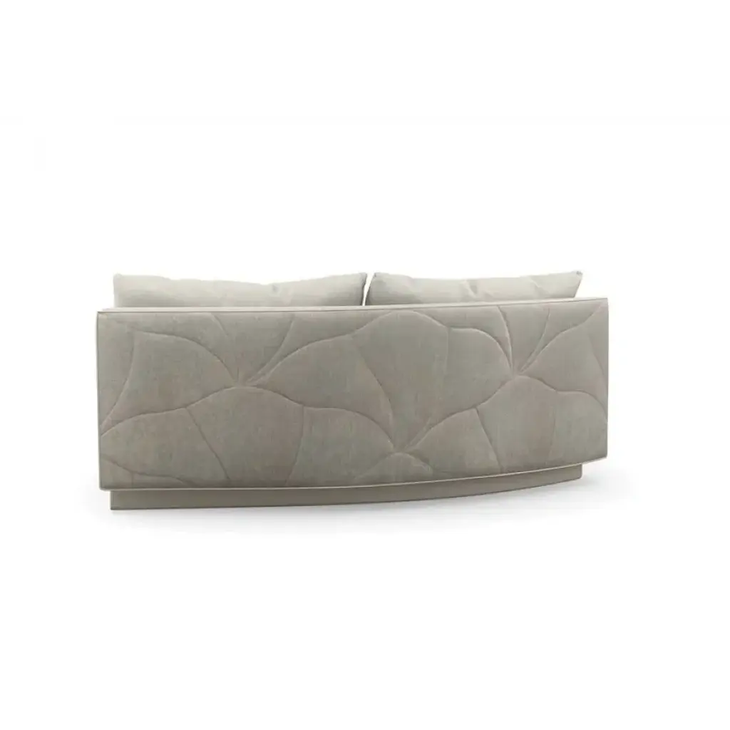 Free-flowing and organic, Fanciful’s soft curves are artfully accented by a quilted ginkgo leaf pattern, fanning out along the back and sides. Its nature-inspired design adds graphic interest and dimension, complemented by a curved plinth base wrapped in pearl vinyl. Expertly tailored in tonal gray performance fabrics, inside and out, and trimmed in contrast welt. For a finishing touch, we’ve added accent pillows in soothing neutral hues and a subtle pattern. Pair with the matching Fanciful swivel chair.