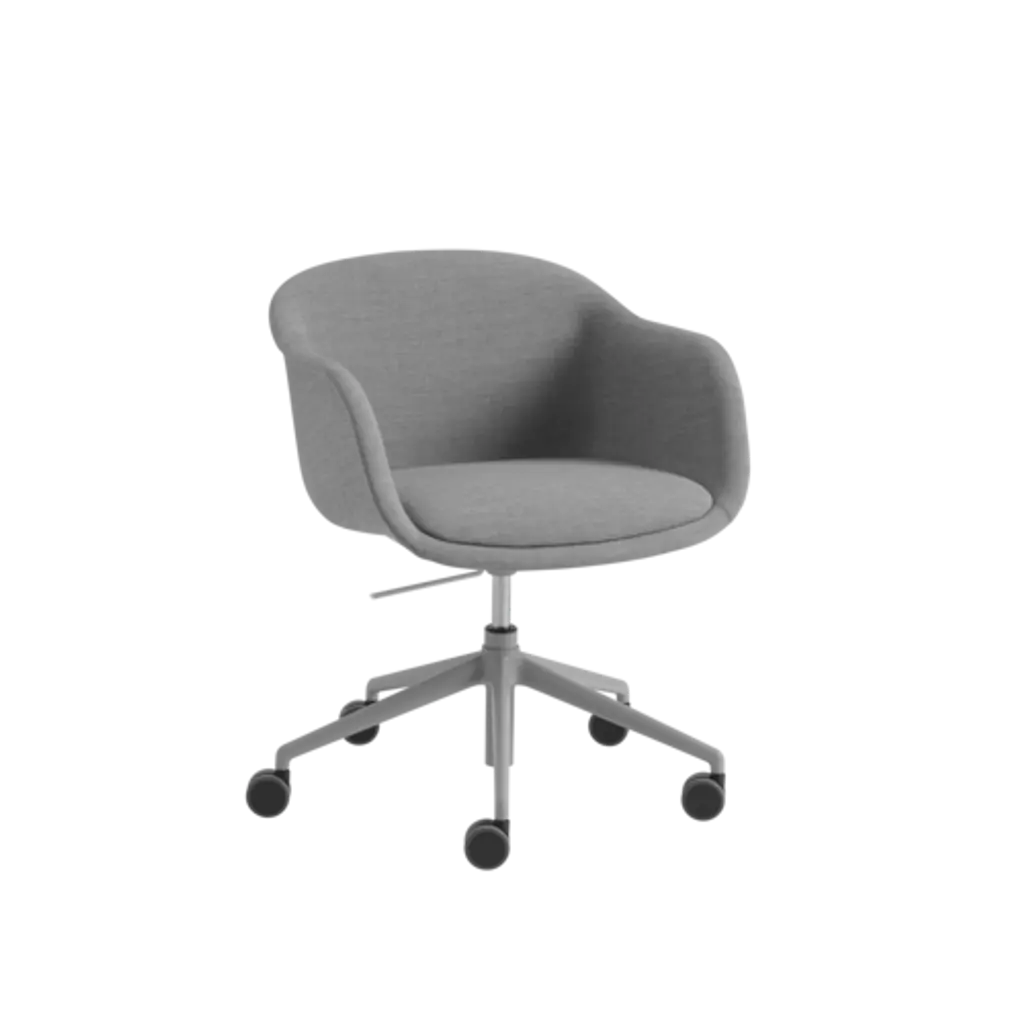 Iskos-Berlin's office seating Fiber gets the ultimate treatment in both customization and workability. Completely upholstered in a premium textile or fine leather, the armchair's interior molded shell yields its comfortable contours. And, along with its pivoting swivel base set on castors for effortless movement, the chair height is instantly adjusted via gaslift.