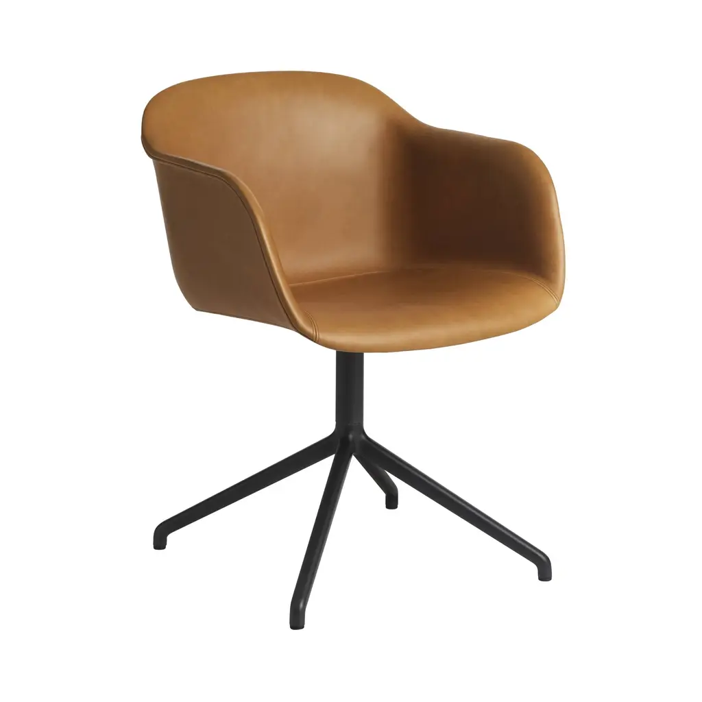 A clever mix of contemporary sensibility and modern design ideal for work or home. The Fiber Armchair Fiber Armchair with Swivel Base from Muuto balances atop a structure of slender aluminum legs, extending a central stem higher to a one-piece shell seat made of molded plastic enhanced with at least a quarter of its mass in wood fibers. This sustainable seat offers a stylish and tactile texture, while the shape offers an enveloping retro appeal with a classic, professional character.