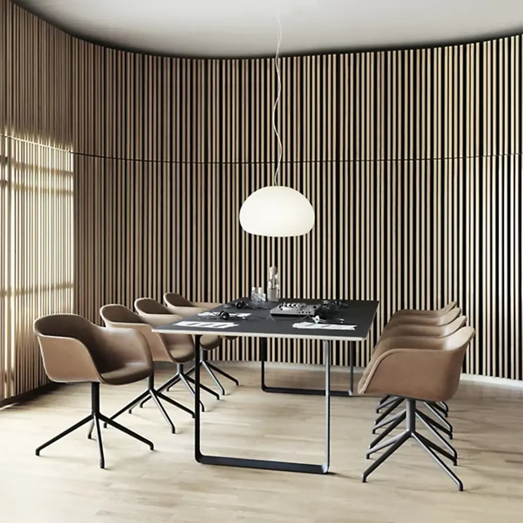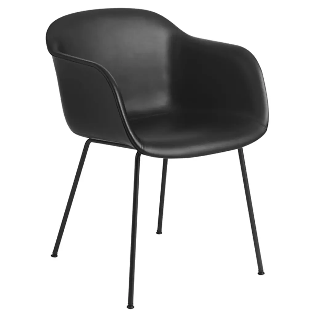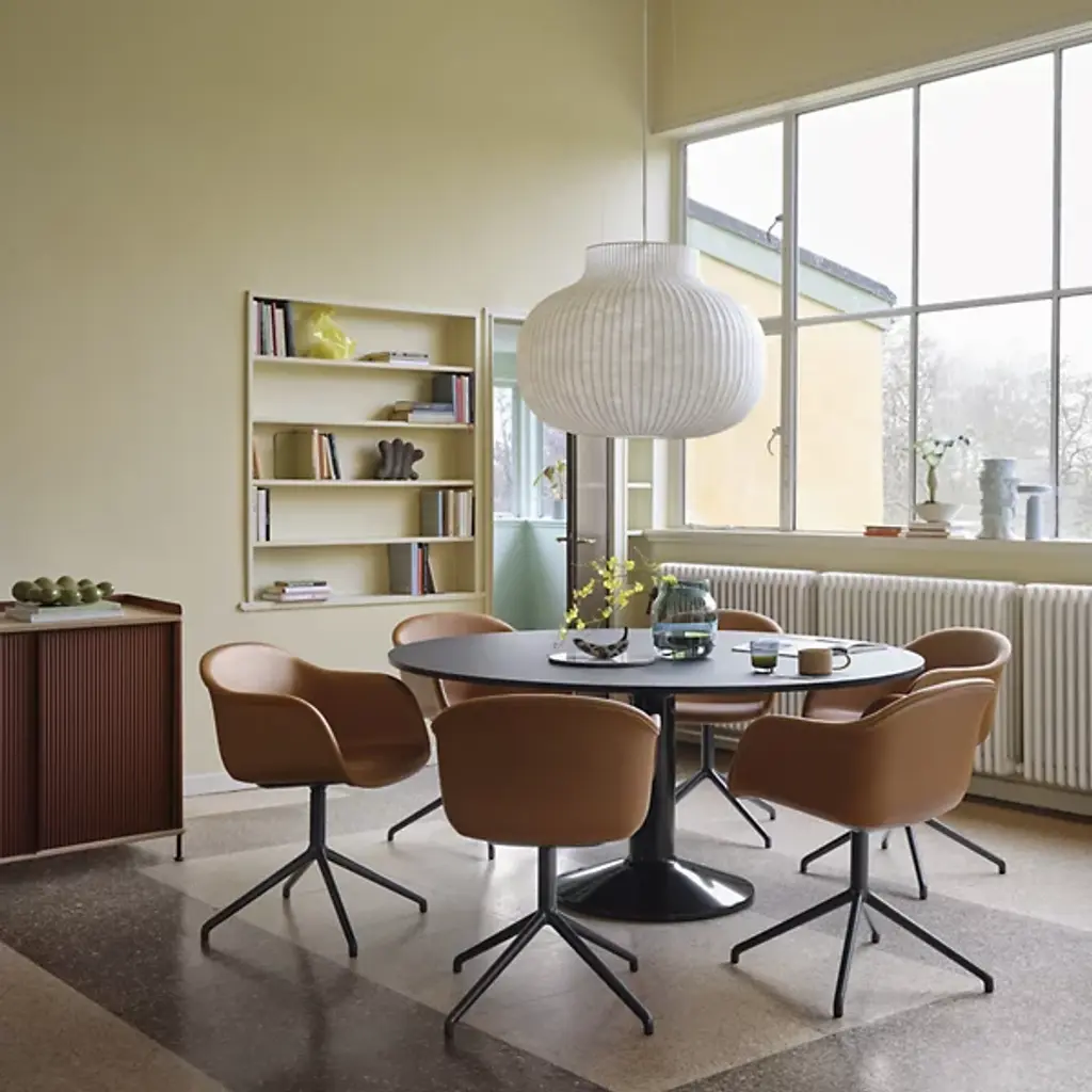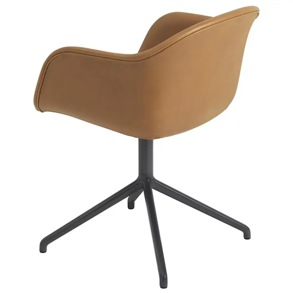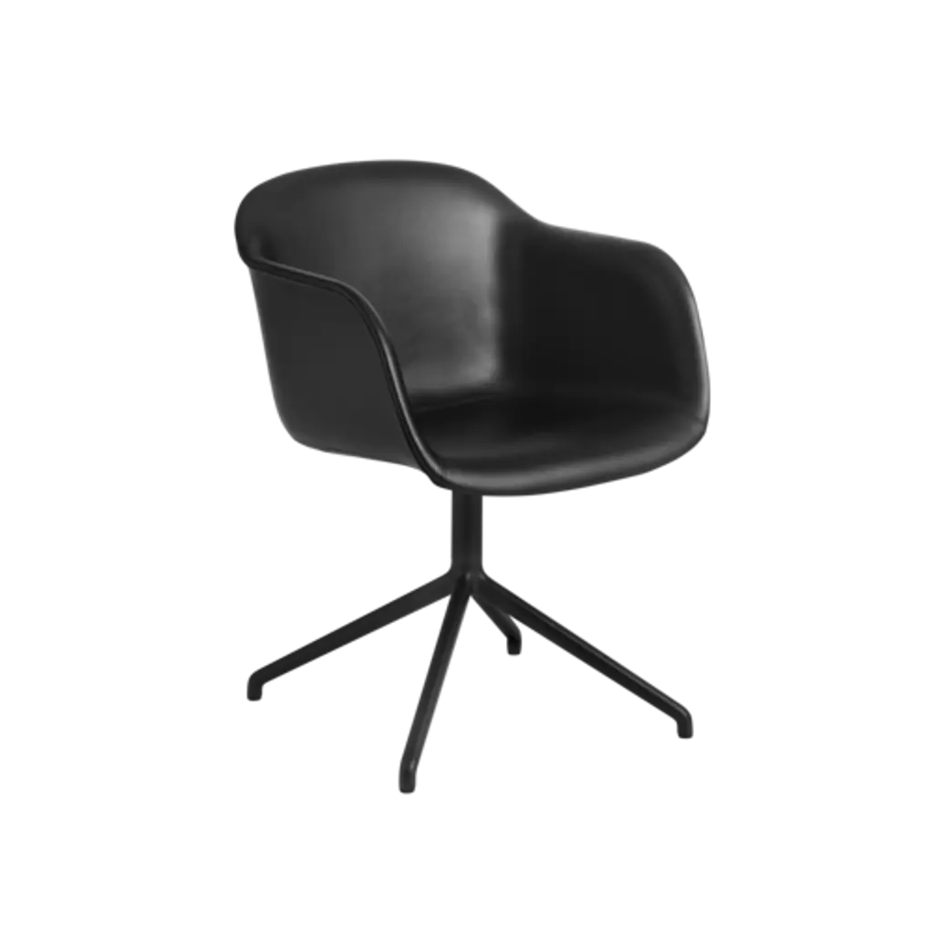 A clever mix of contemporary sensibility and modern design ideal for work or home. The Fiber Armchair Fiber Armchair with Swivel Base from Muuto balances atop a structure of slender aluminum legs, extending a central stem higher to a one-piece shell seat made of molded plastic enhanced with at least a quarter of its mass in wood fibers. This sustainable seat offers a stylish and tactile texture, while the shape offers an enveloping retro appeal with a classic, professional character.