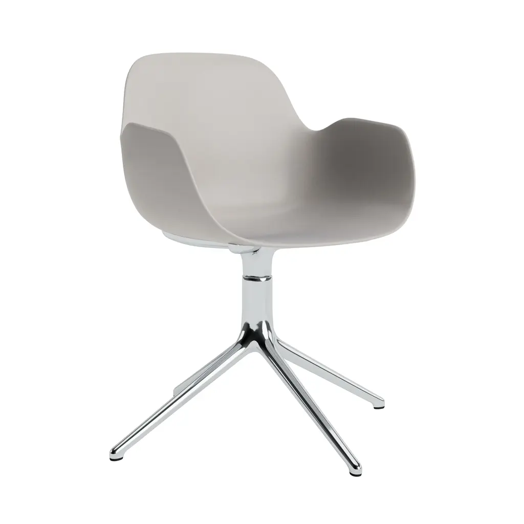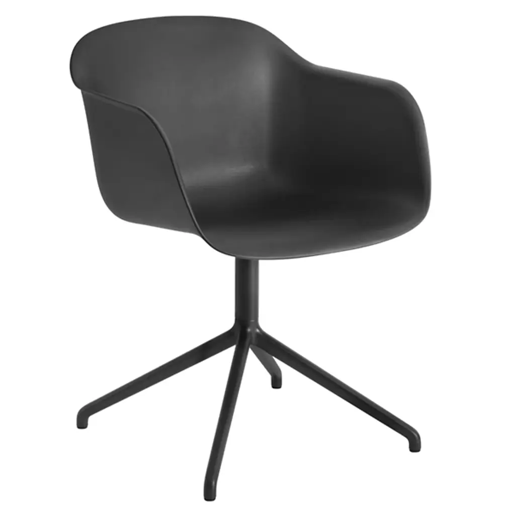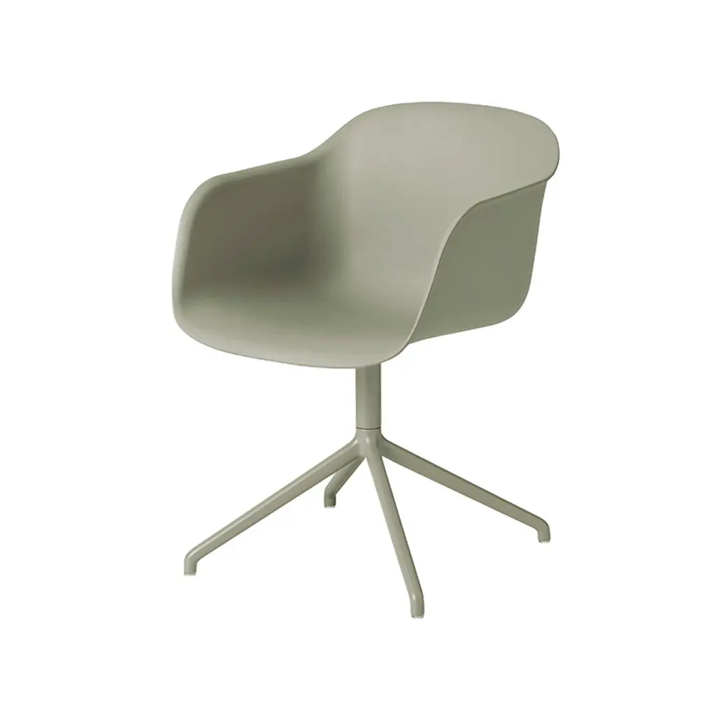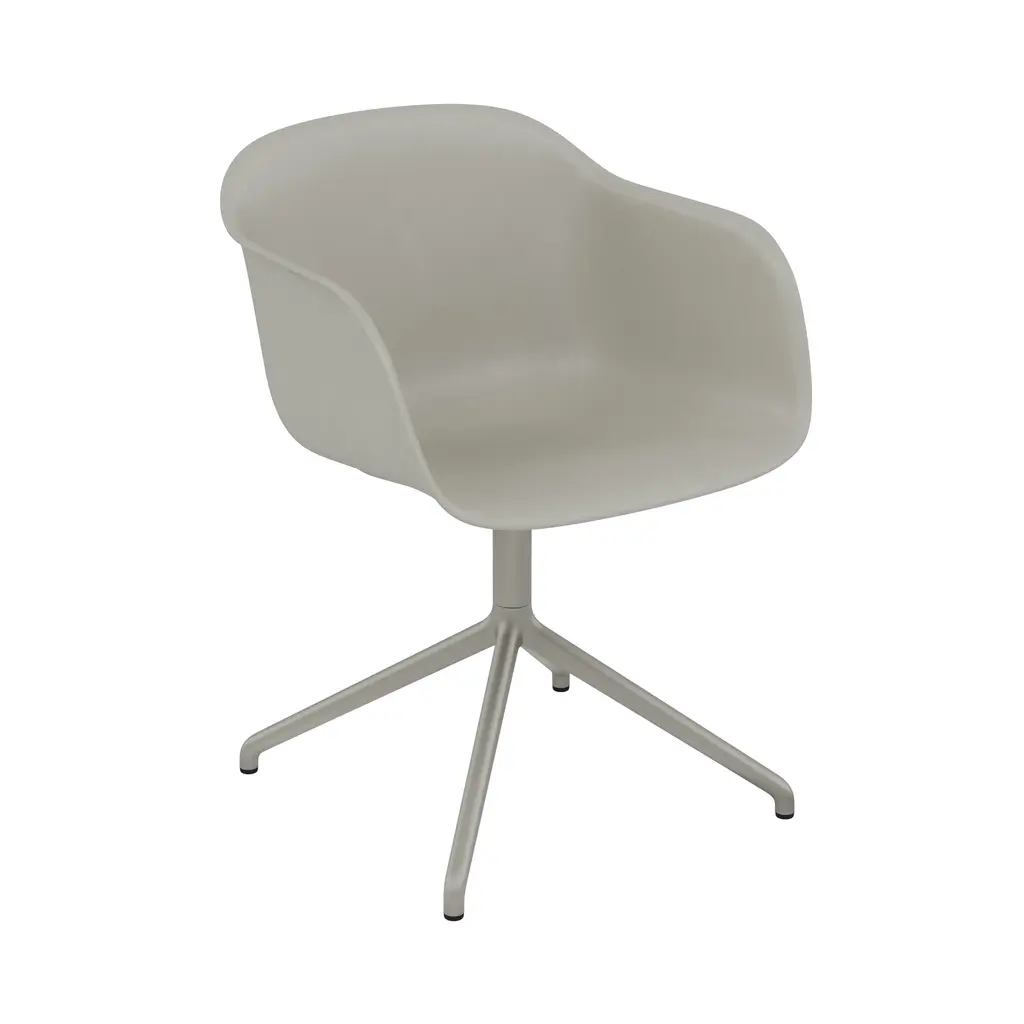 A clever mix of contemporary sensibility and modern design ideal for work or home. The Fiber Armchair Fiber Armchair with Swivel Base from Muuto balances atop a structure of slender aluminum legs, extending a central stem higher to a one-piece shell seat made of molded plastic enhanced with at least a quarter of its mass in wood fibers. This sustainable seat offers a stylish and tactile texture, while the shape offers an enveloping retro appeal with a classic, professional character.