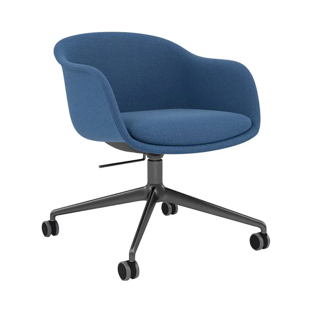 Welcome mobility — via roll-around castors and a seat that swivels and tilts — accentuates the finely engineered utility of this Fiber Conference Armchair model from Muuto. Its distinctive sculptural design and long-lastingly comfortable ergonomics devised by Copenhagen-based Iskos-Berlin get a sustainable turn with the seat’s inner shell made of 99% recycled plastic. Apropos for home office and the workplace alike, the chair is fully upholstered in a choice of premium materials and fitted with a soft fixed cushion.