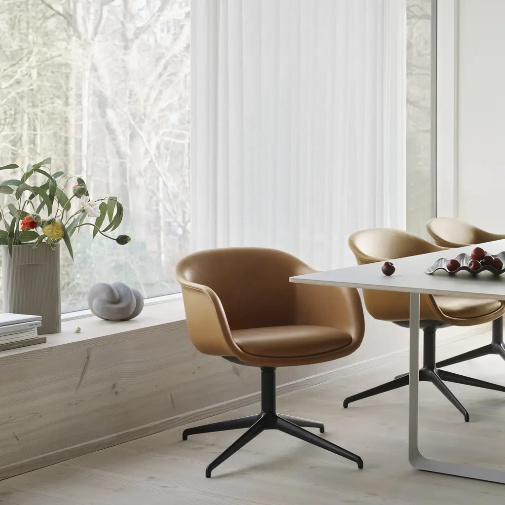 Whether set for the office or WFH, Muuto's sharp and clean-lined shell armchair with a swivel base and automatic seat return brings prime functionality, sustainability and an eye-catching presence. Fiber Conference Armchair's ergonomic contours are comfortable for long stretches of sitting, as engineered by Copenhagen-based design studio Iskos-Berlin. The seating's embracing inner shell is engineered in 99% recycled plastic and then fully upholstered with a soft fixed cushion.