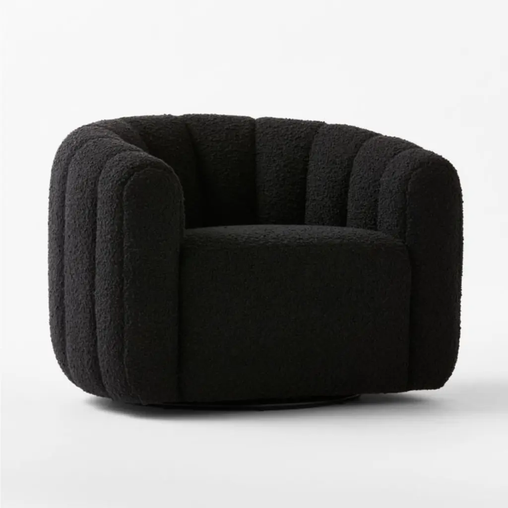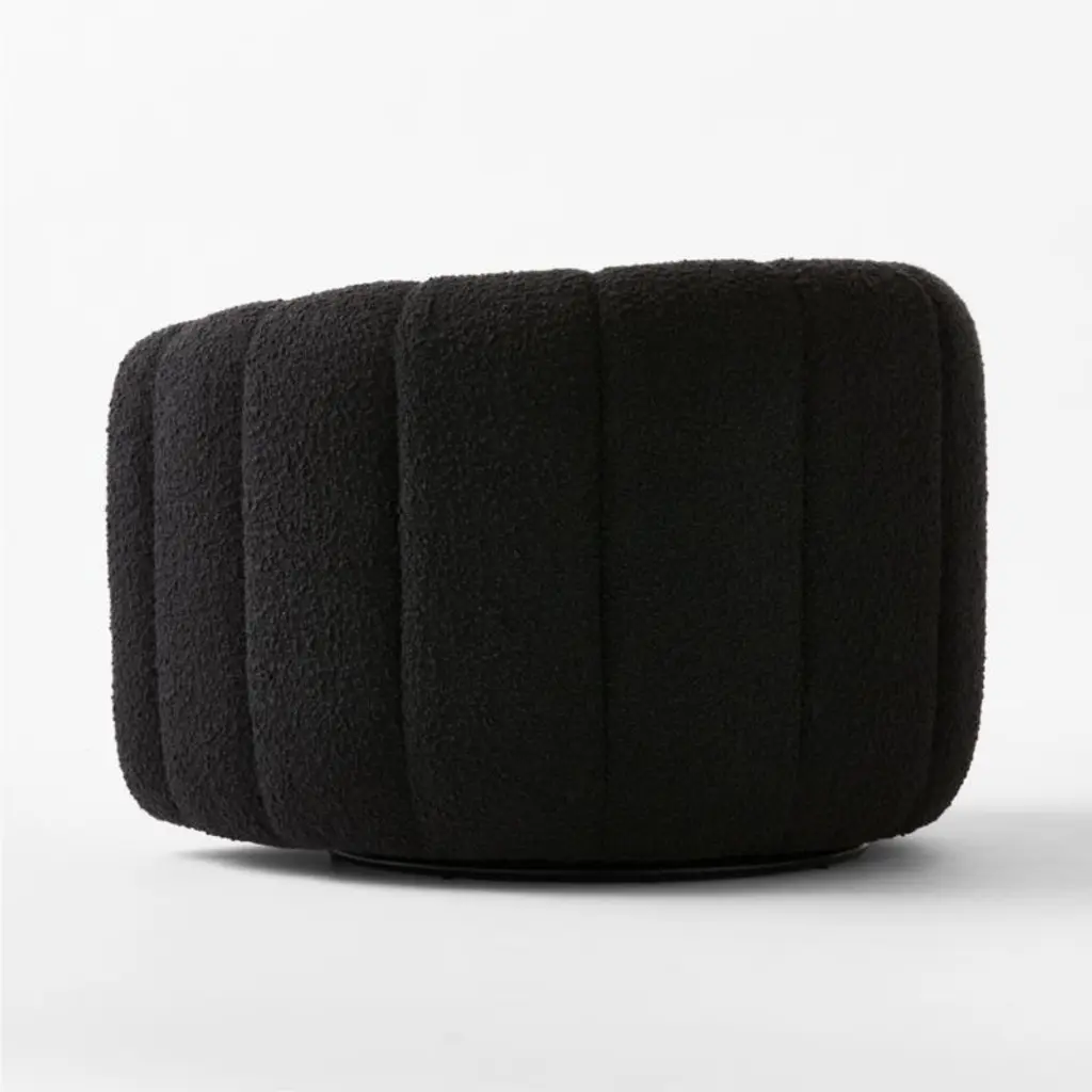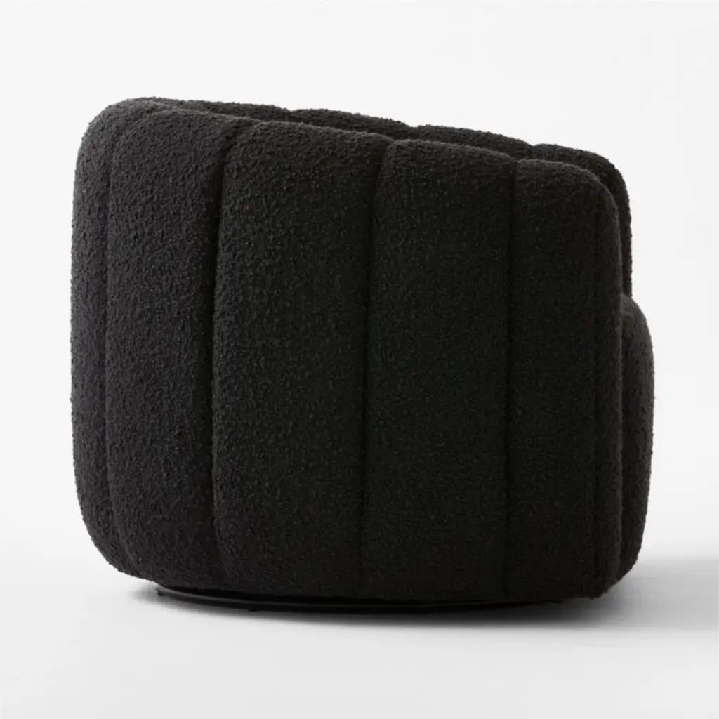 Channel-tufted in soft black boucle, deco-inspired swivel chairs make a vintage statement wherever they sit. Designed by VUUE and crafted of hardwood certified sustainable by the Forest Stewardship Council (FSC), the chairs look good from every angle. CB2 exclusive.