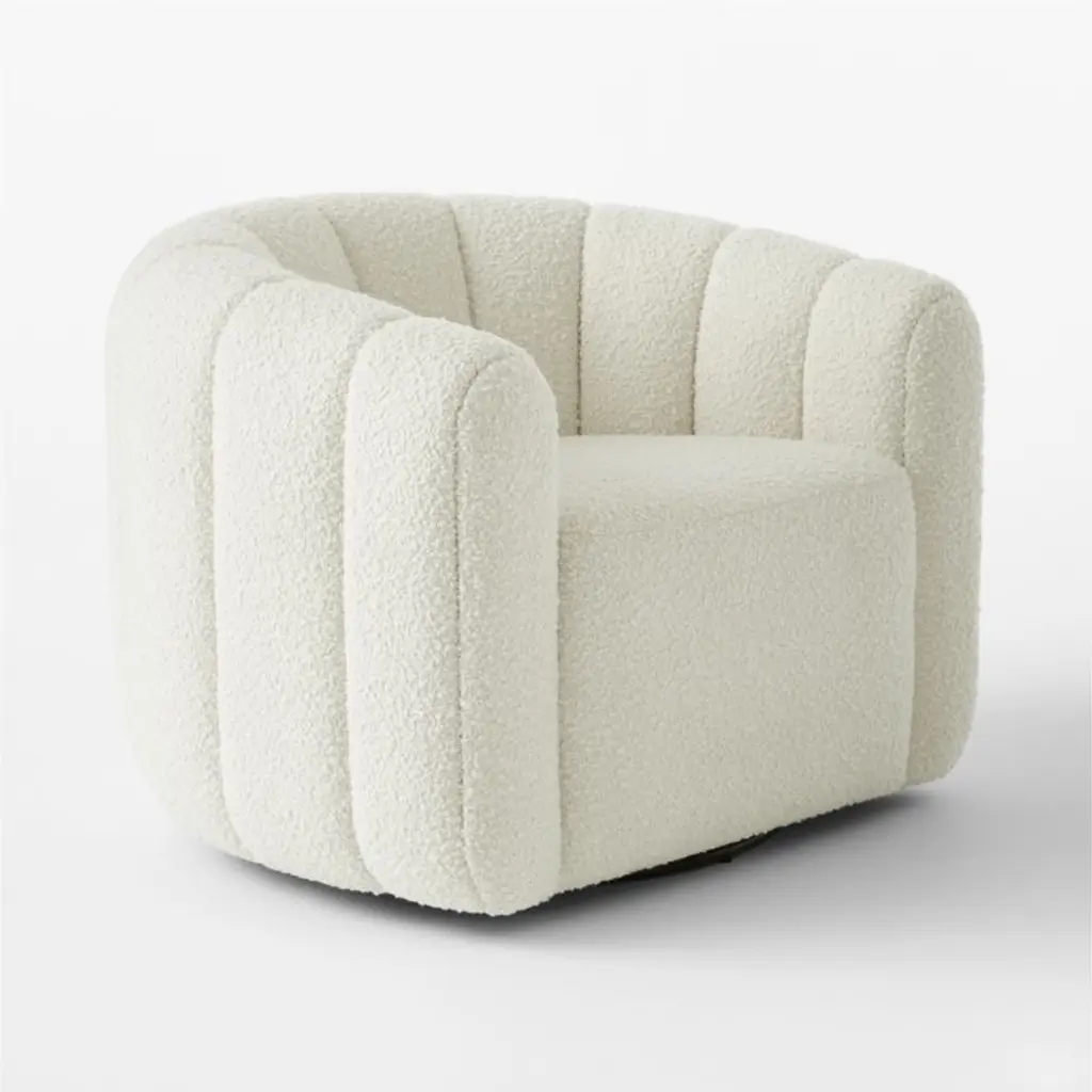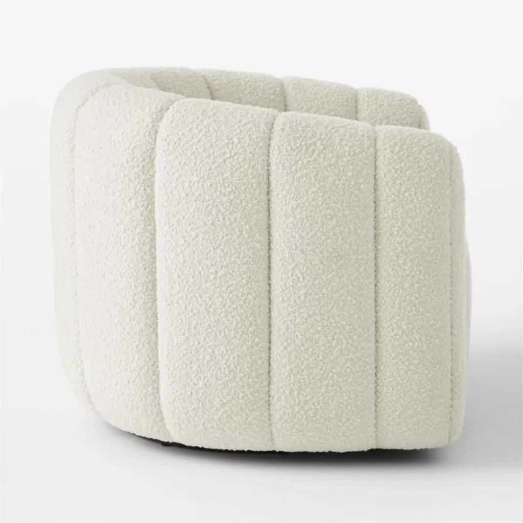 Channel-tufted in soft cream boucle, deco-inspired swivel chair makes a vintage statement wherever it sits. Designed by VUUE and crafted of hardwood certified sustainable by the Forest Stewardship Council (FSC), the chair looks good from every angle. CB2 exclusive.