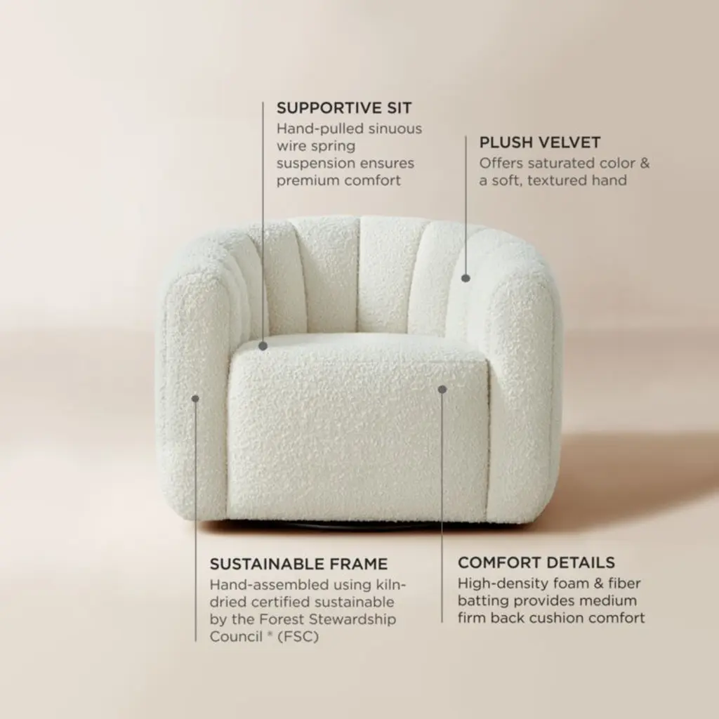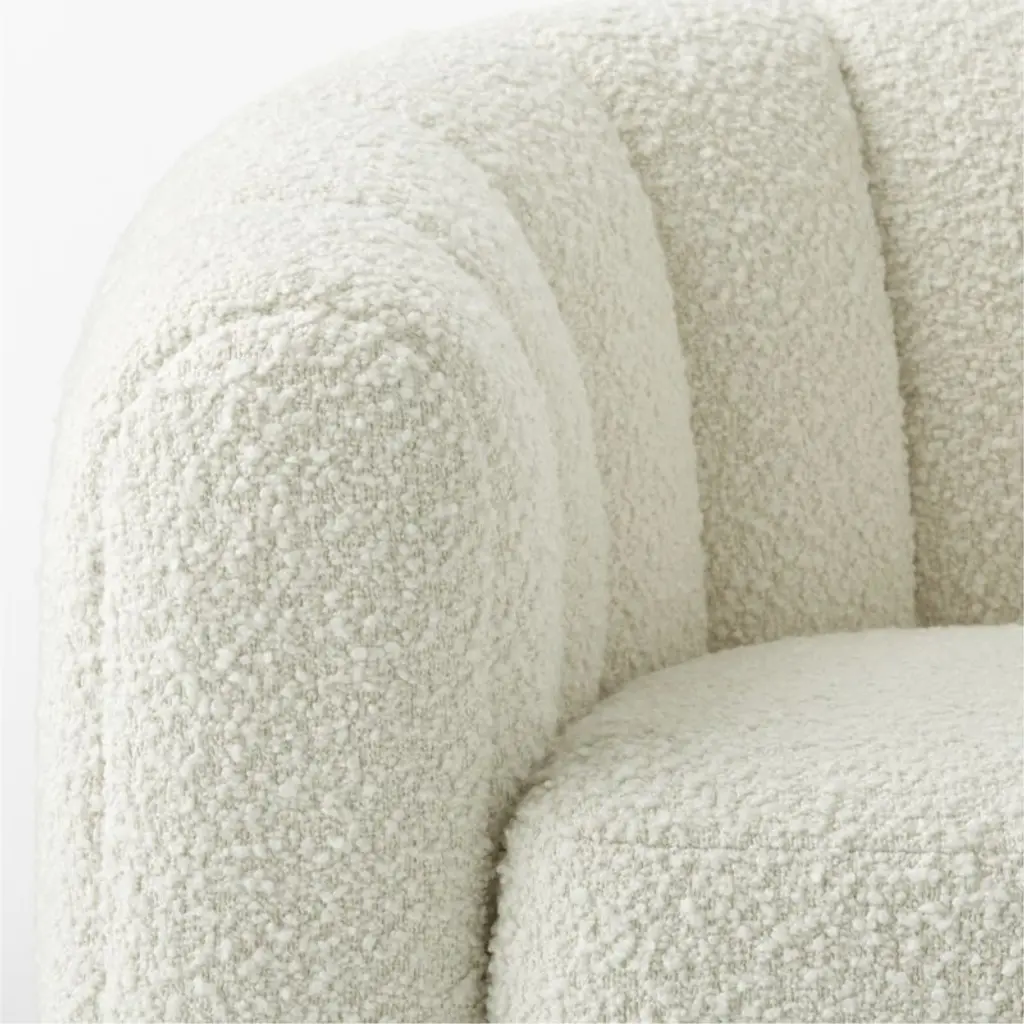 Channel-tufted in soft cream boucle, deco-inspired swivel chairs make a vintage statement wherever they sit. Designed by VUUE and crafted of hardwood certified sustainable by the Forest Stewardship Council (FSC), the chairs look good from every angle. CB2 exclusive.