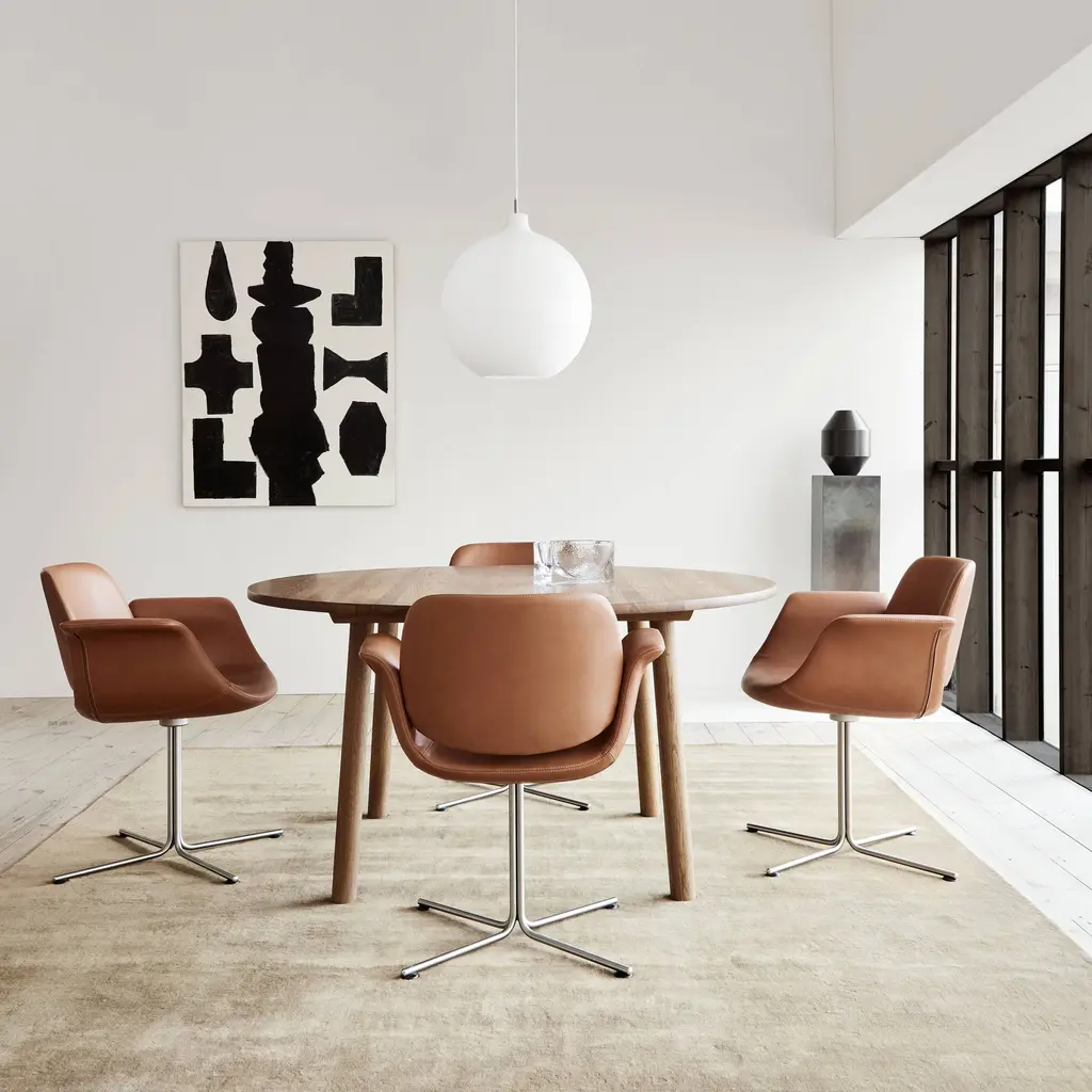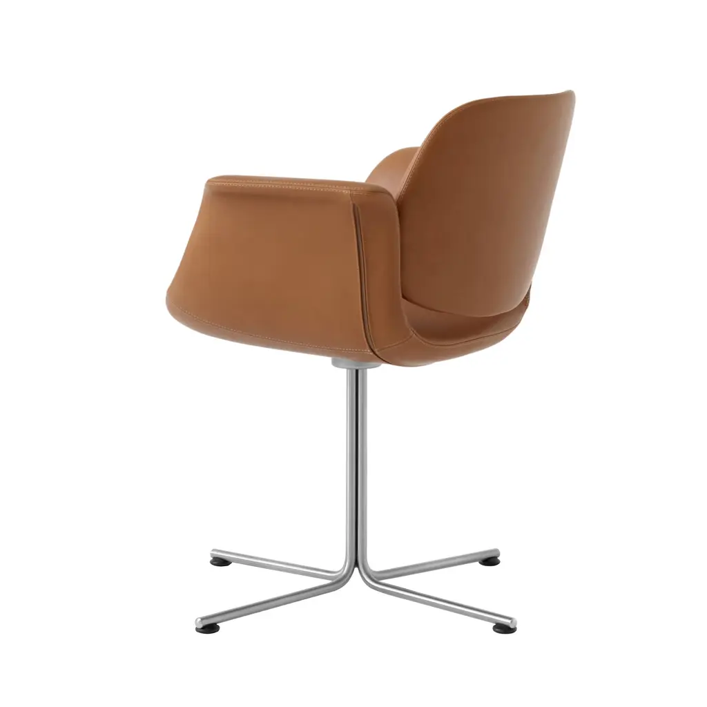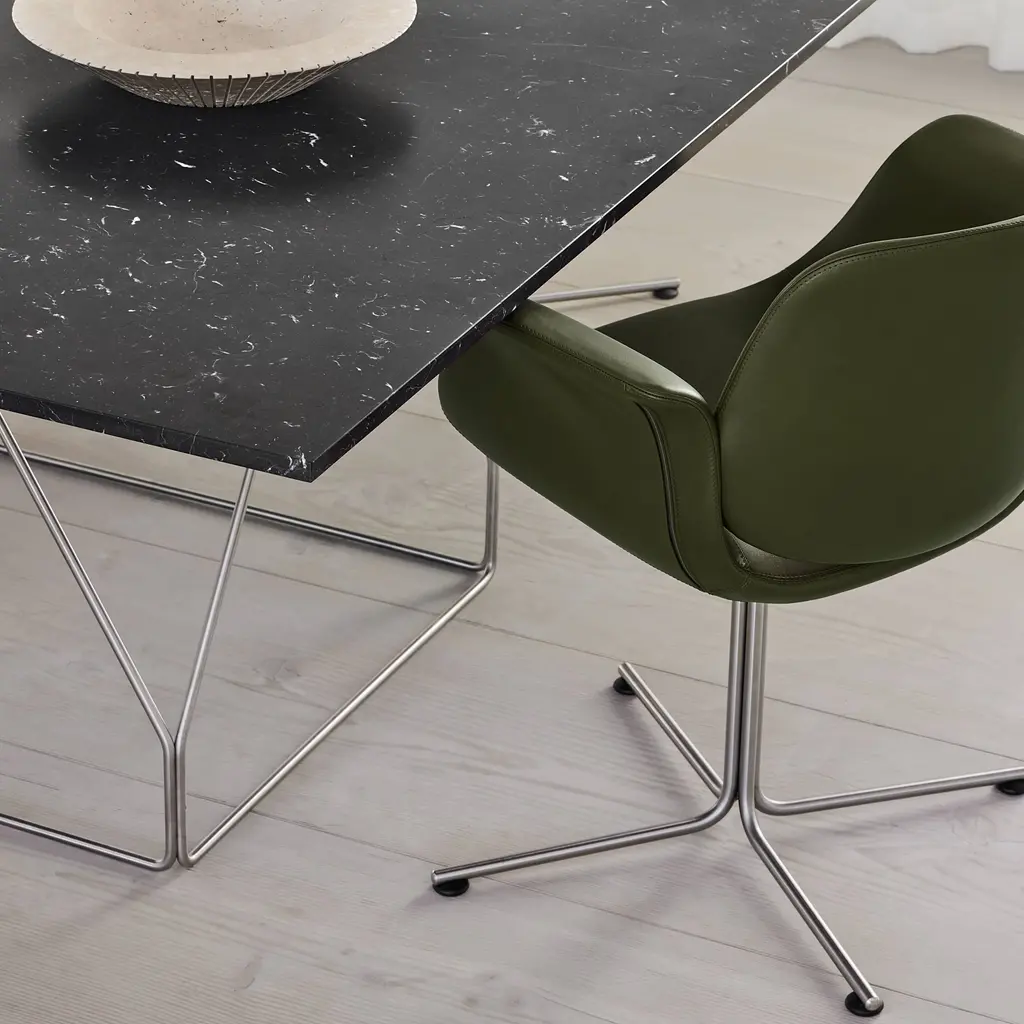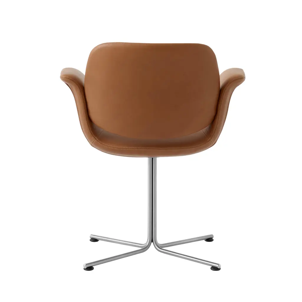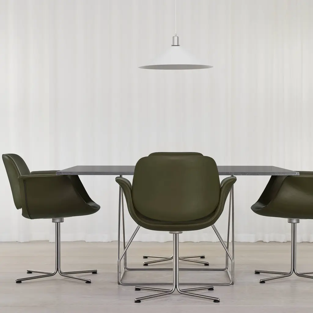 With the graceful curves of the seat and its symbolic “wings” for arms poised above the long, slim base, Foersom & Hiort-Lorenzen's lounge chair certainly looks the part. Flamingo's backrest appears as if it’s floating on top, in the shell's culmination of fluid lines. Available in both swivel and fixed versions, the seat is shaped in molded cold cured foam reinforced with steel and expertly upholstered in a premium fabric or leather, accompanied by the base in either brushed stainless-steel or black.