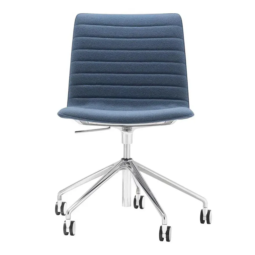 Chair with aluminum central swivel base with 5 casters, height adjustment and finished in polished aluminum, white or black. Fully upholstered seat and backrest. Optional Parallel upholstery. Height Increase: Height 32.00-36.00 inches. Seat height 17.00-21.00 inches.The most luxurious piece in the Flex Collection, the Flex Corporate has a fully upholstered seat and backrest. The wider seat, higher backrest and thicker foam increase comfort and opulence.