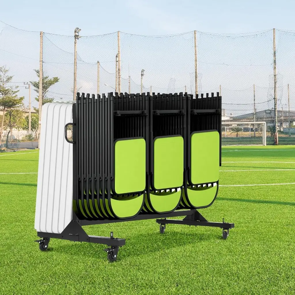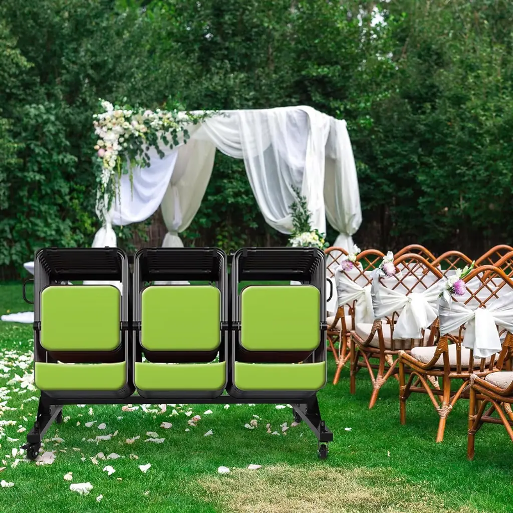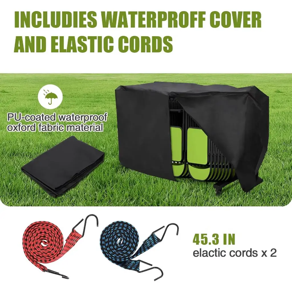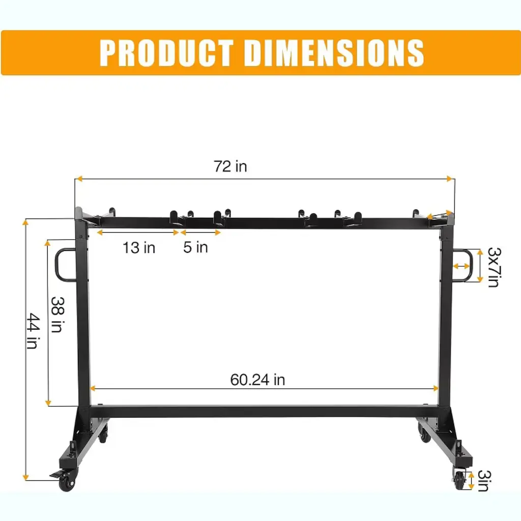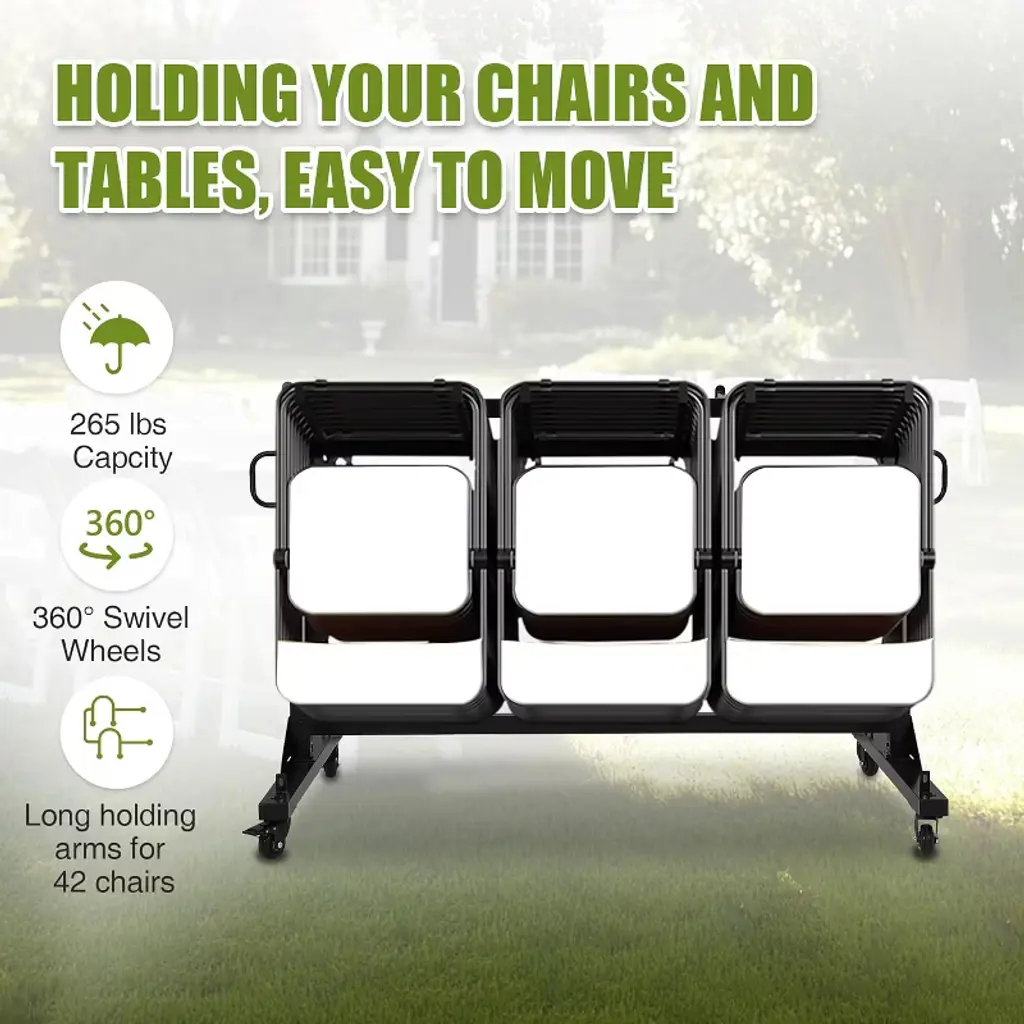 Maximize your space and simplify chair storage and transport with this Folding Chair Rack on Wheels. Constructed from durable Q235 steel with a powder-coated finish, this heavy-duty cart supports up to 42 folding chairs or 6 tables with a total capacity of 265 lbs. Designed for versatility, its height-adjustable frame fits various chair types, including standard metal and resin event chairs. Equipped with smooth 360° swivel PVC wheels and locking brakes, it offers effortless mobility and stability. The included waterproof cover and elastic straps protect your chairs from dust and moisture while securing them in place, making it ideal for schools, churches, garages, and outdoor events. Heavy Duty Metal Frame – 265 Lbs Capacity: Built from strong Q235 steel with a corrosion-resistant powder coat, this chair rack provides a stable and long-lasting storage solution for up to 42 folding chairs or 6 tables. Adjustable Height for Versatile Storage: Easily customize the frame height to accommodate different folding chair sizes, ensuring a perfect fit for metal, resin, or other event chairs. Smooth Rolling Wheels with Locks: Four 360° PVC swivel wheels offer smooth and easy movement on hard floors, carpets, or outdoor surfaces. Two locking wheels secure the cart in place during loading and unloading for added safety. Protective Cover & Secure Straps Included: The waterproof cover shields chairs from dust and moisture, while adjustable elastic straps keep chairs firmly secured during transport or storage. Multi-Purpose Chair Organizer: Ideal for storing and transporting folding chairs, tables, and other event equipment, this versatile cart saves time, space, and effort in managing your venue furniture. Specifications: Capacity: Holds up to 42 folding chairs or 6 tables Weight Capacity: 265 lbs Material: Q235 steel frame with powder-coated finish Wheels: 4 PVC 360° swivel casters, 2 with locks Adjustable Height: Yes Color: Black Includes: Waterproof cover and elastic securing straps Package Includes: 1 × Folding Chair Rack with wheels, cover, and straps Customer Support: Available for product assistance and inquiries