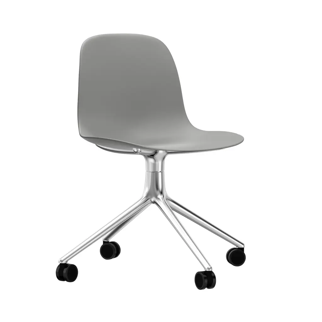 With this swivel-based version, designer Simon Legald pivots the role of his signature Form Chair for Normann Copenhagen with a comforting turn at the dining or work table in mind. Four slim arms grip the chair shell. Those same "arms" meet in a rotating centerpiece and then become legs, branching out to the ground. The aluminum base is available polished or lacquered in black or white. Swivel is only one of the many bases of the Form seating series, which also comes as an armchair and in bar and counter heights, as well as upholstery. The result is some 40,0000 possible combinations.