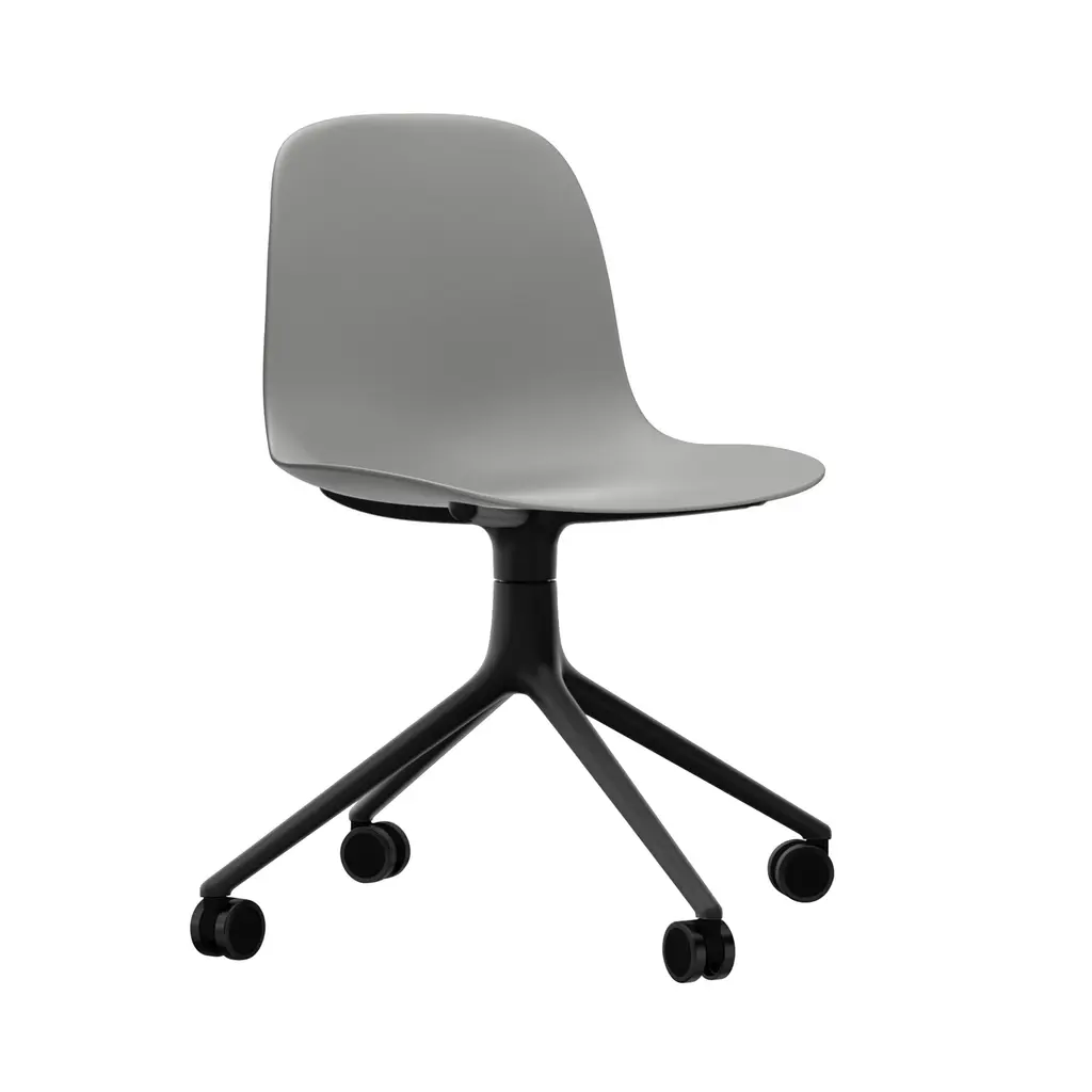 With this swivel-based version, designer Simon Legald pivots the role of his signature Form Chair for Normann Copenhagen with a comforting turn at the dining or work table in mind. Four slim arms grip the chair shell. Those same "arms" meet in a rotating centerpiece and then become legs, branching out to the ground. The aluminum base is available polished or lacquered in black or white. Swivel is only one of the many bases of the Form seating series, which also comes as an armchair and in bar and counter heights, as well as upholstery. The result is some 40,0000 possible combinations.
